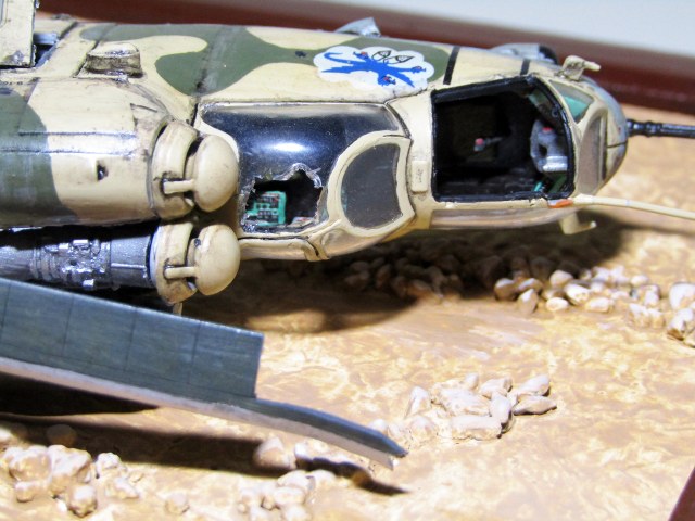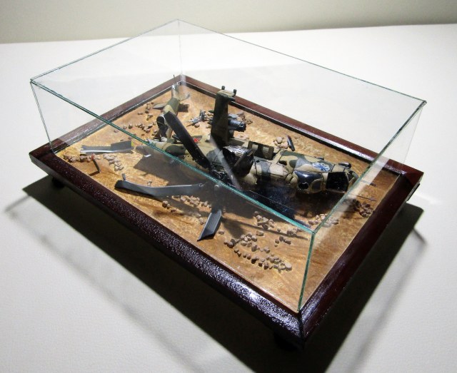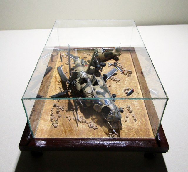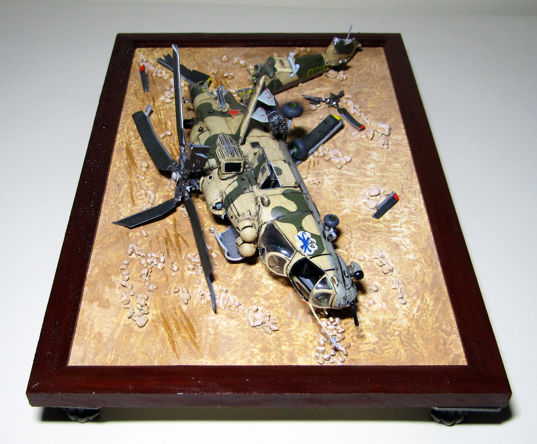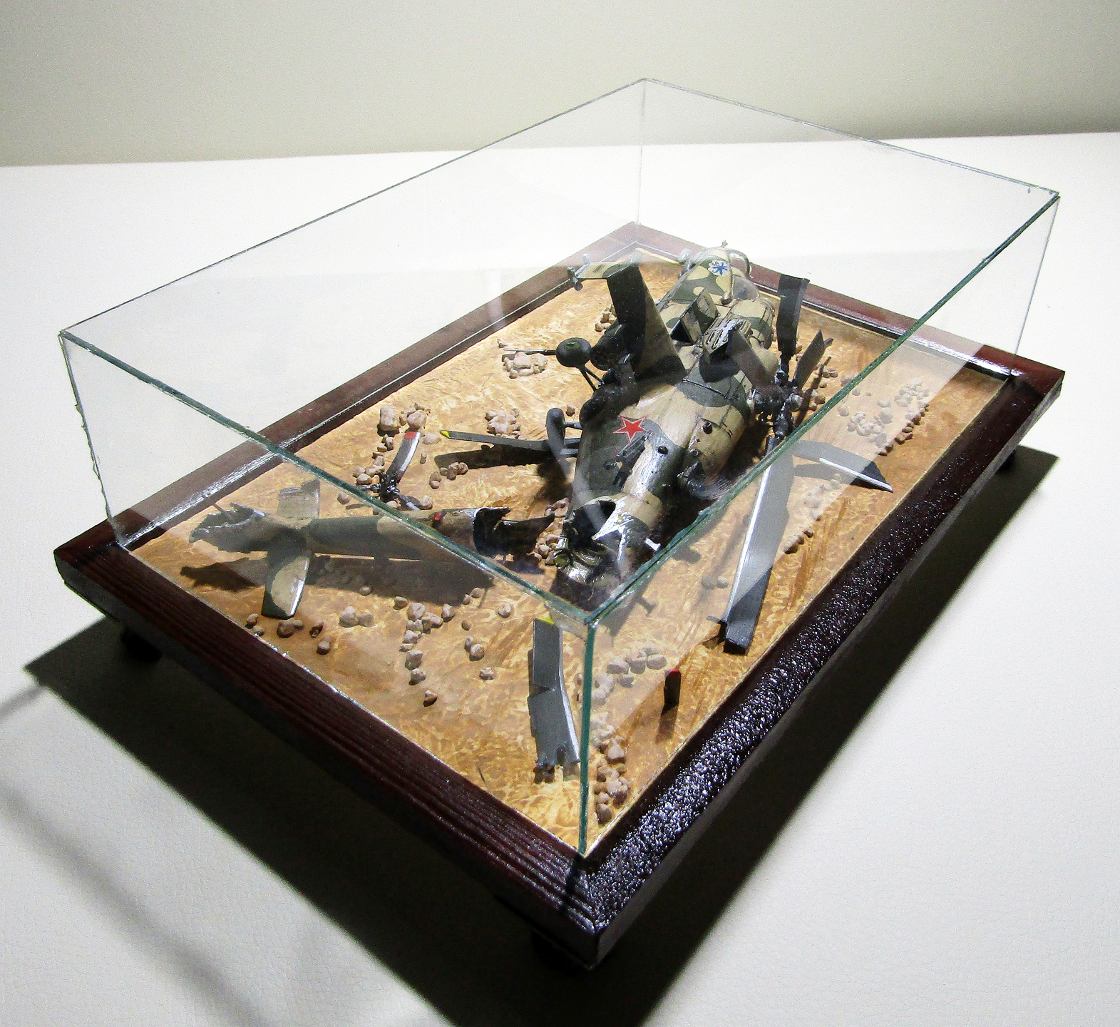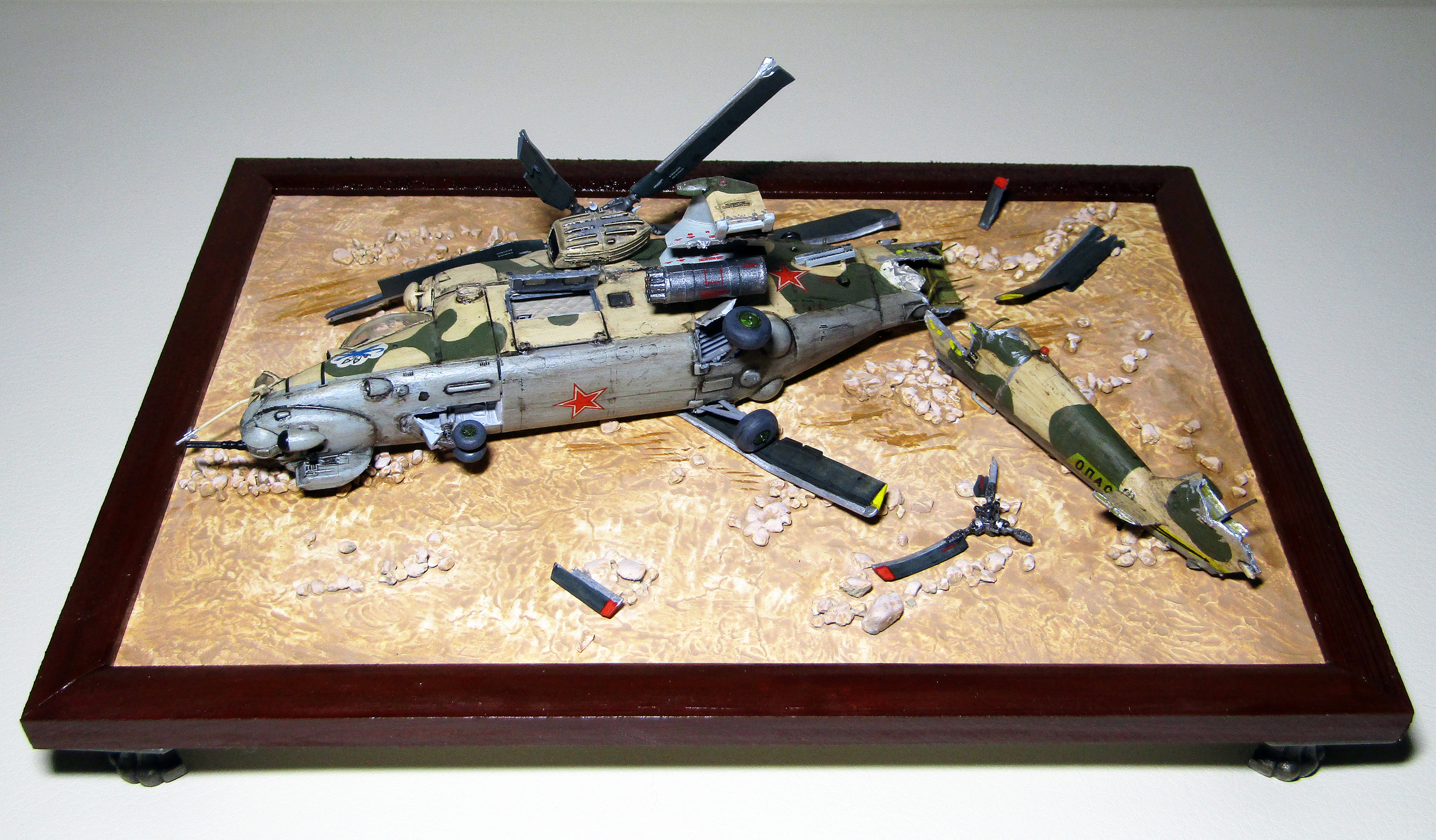 Доброго времени суток уважаемые коллеги! Довелось мне как-то собрать несколько лет назад данную вертушку. Набор от звезды очень понравился, высокая детализация и прекрасная стыкуемость деталей оставили очень приятные впечатления и заставили переменить своё отношение к звезде в целом, я наконец убедился в том, что она «может» выпускать и выпускает достойные киты. Однако исполнена данная модель была, мягко говоря не очень, ввиду отсутствия должного опыта и нормальных расходников. Красил без грунта эмалями от revell, затем перед постройкой диорамы немного «состарил» проэксперементировав разными способами смывки и перестарался. Модель получилась чересчур «грязной». Затем, в ходе переезда и вовсе поламалась. И тут, немного подумав, я решил не пропадать же добру и решил сделать небольшую миниатюру на тему афганской войны. Для сюжета использовал ряд фотографий сбитых крокодилов из различных фотоархивов. По большей части, за основу была взята фотография Ми-24П капитана Г. Павлова, подбитого у Бамиана, который после выхода из строя гидросистемы был разбит при аварийной посадке. 50-й ОСАП, 18 июня 1985 г. Умелые и слаженные действия помогли летчикам уцелеть в аварийной ситуации, однако командиру удалось выбраться из кабины, лишь разбив остекление. Но конечно-же у меня не модификация «П», а «В» с четырехствольным 12,7-мм пулемётом ЯкБ-12,7 (9-А-624). Поэтому искать какую-либо стопроцентную схожесть с фотографиями не нужно. В качестве подставки использовал листовой вспененный пластик, покрытый акриловой текстурной пастой и мелкими камушками. Лист вставлен в фоторамку. Основание красилось темперой по автомобильной грунтовке. Ножки прикрутил «шкатулочные», стеклянный колпак нарезал из фоторамочных 1-мм стёкол, склеиливал стеклянным моментом. Приятного просмотра коллеги…