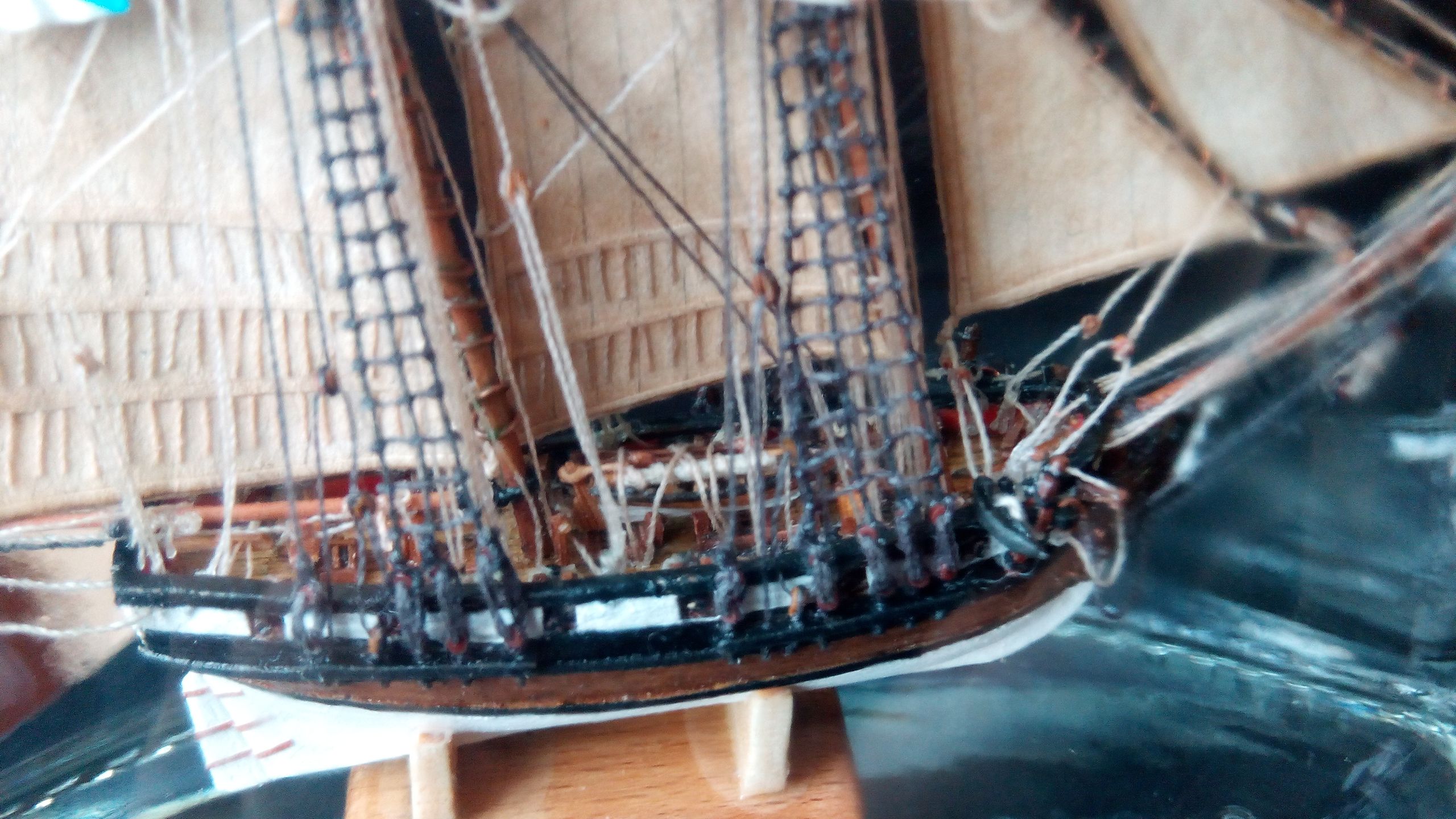 Приветствую Игорь, самое интересное это не ткань. В одном из отзывов к модели, по моему это был Антон Хотеев (Anton1969), выказал предложение об использовании бумаги. Я естественно, вначале отрицал её вариант по причине повреждений, но эта мыль мне запала, т.к. всё таки ткань в таком масштабе смотрится грубовато, с учетом того, что диаметр нитей очень влияет на восприятия масштабности. И я стал искать материалы по замене ткани со свойствами для работы на изгиб и растягивание, а также устойчивость к разрушению под солнечными лучами и к температурному режиму, т.к. если на бутылку падают лучи солнца, то она внутри нагревается. И входе различных опытов пришёл к технологии паруса из бумаги, поцесс нужно делать так, я вырезал парус, наносил карандашом швы, после его отмачивал в кофе, сушил, далее наклеил шкаторины (использовал клей пва), окрашивал снова в кофе, после окунал в акриловый прозрачный лак для дерева, примерно 10минут, что бы он хорошо впитался в структуру бумаги, а далее его сушил. Бумага приобретает свойство клиёнки, а после обычная работа по декору паруса. Но нужно помнить о том что лак будет крестализоваться с течением времени, т.е. примерно через 1,5-2 мес. он становится менее гибкий.