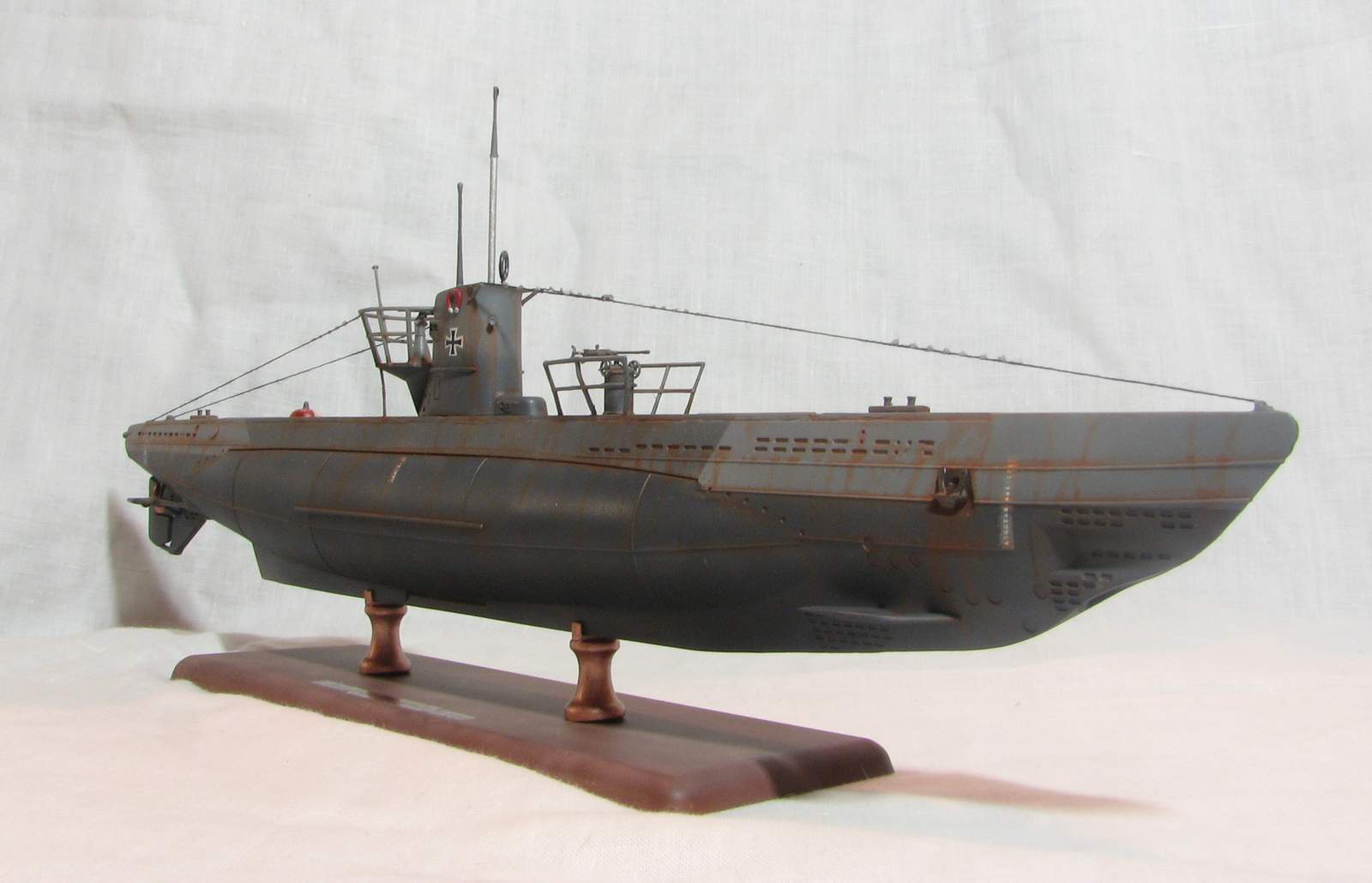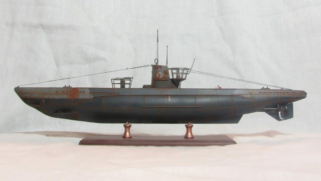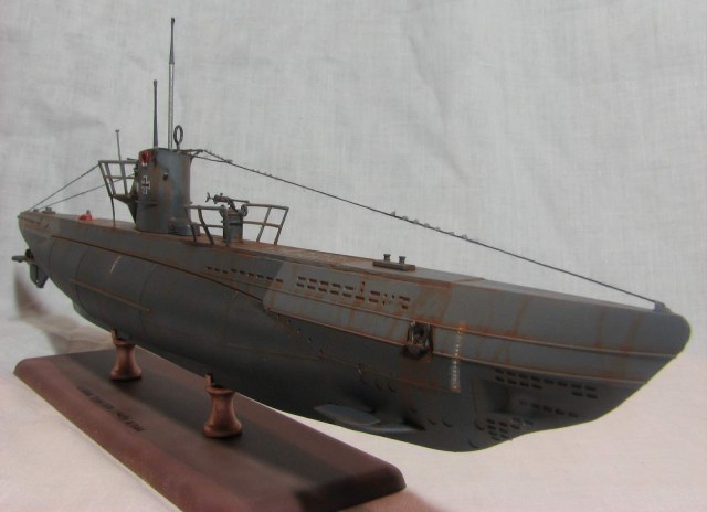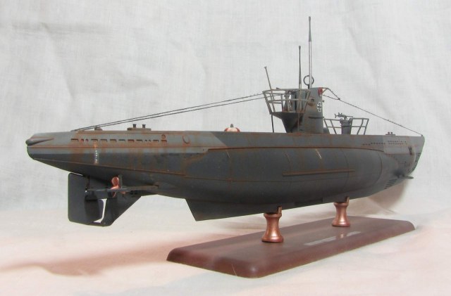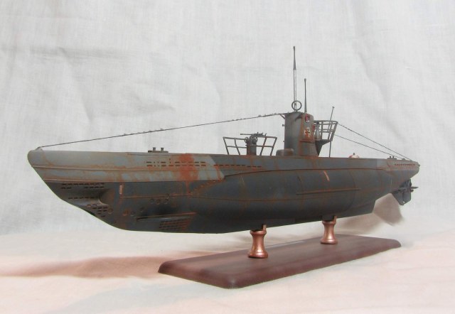 Известная модель "двойки" украинской фирмы, изображающая лодки, действовавшие на Чёрном море в 1943-44гг. Собиралась она честно говоря очень плохо, что при моих слабых навыках оказалось фатально - хорошо видно по палубе и некоторым другим местам. Уже собрав и покрасив, начал наносить декали - и понял, что сделал грубую ошибку, переделывать не рискнул. В результате получилась не конкретная лодка, а "собирательный образ 2Б 1943-44". К тому же 3 из четырех декалей левого борта у меня рассыпались, полностью или частично - попытался прикрыть избыточной ржавчиной, вышло ожидаемо. Покрашена тамиевским акрилом и звездой, растяжки - нитка, жуткие "изоляторы" - ПВА. Что интересно, на литниках полностью отсутствуют мелкие детали для второго автомата - плечевой упор и маховики есть только для одного орудия, сам я их сделать нормально не смог...