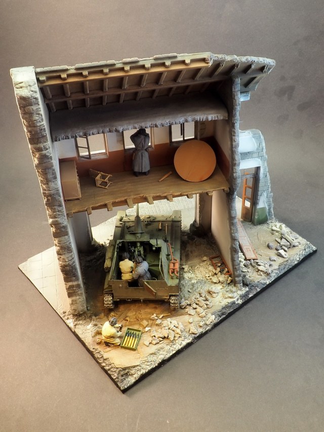 Набор на скорую руку собрать конечно тяжеловато, здание требует подгонки и шпаклевки, да и самоходка стыкуется далеко не идеально. Скажем, совсем новичкам я бы не рекомендовал. Но если уже есть какой-то опыт с техникой и хочется диораму, а самому пилить с нуля страшно, то будет неплохим выбором.