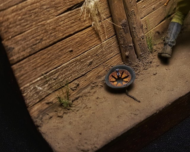Изначально когда обрезал основание кусок стенки оставил и вот он как раз был лишним, поэтому от него отказался. а меньше основание делать уже некуда и так 12х12 см на котором умещается и фрамент танка, траншея, бруствер, поле и две фигуры.