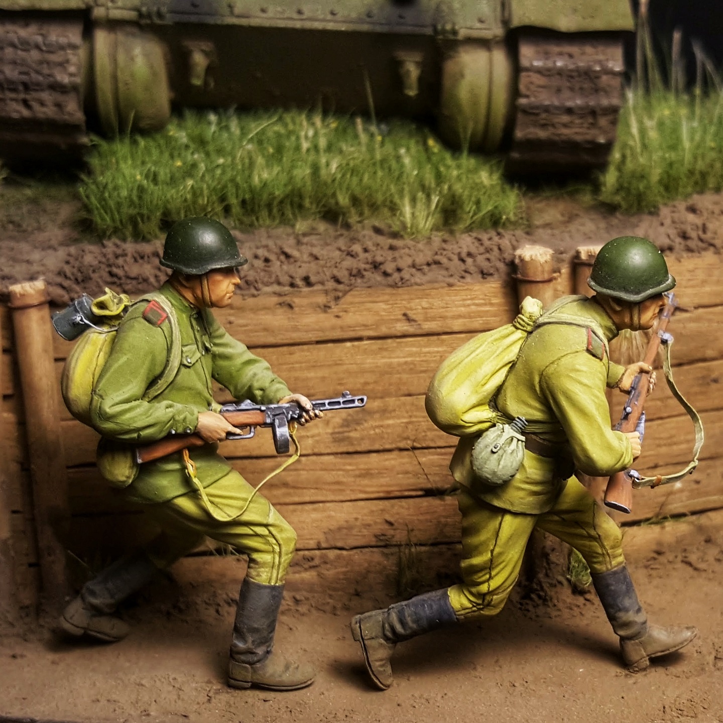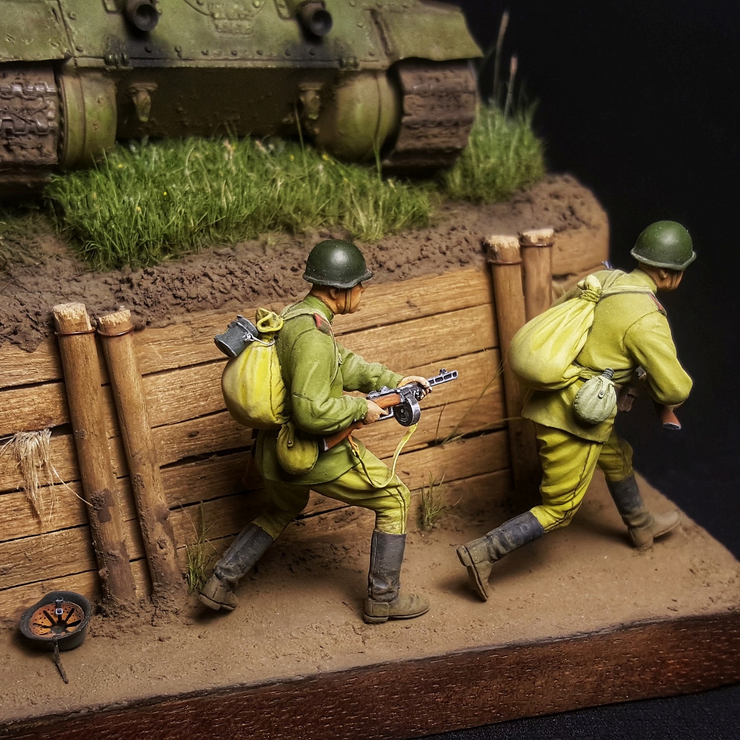 у ппш за ствол не держатся и поза бегущего солдата какая то странная-но может фото такое и слишком чисто и в траншее при таком следе от танка в траншее должно быть уйма ямок от следов и грязнее-в общем месево-а след из под танка мне кажется должен быть с травой-он же не косит ее-а в целом работа хорошая