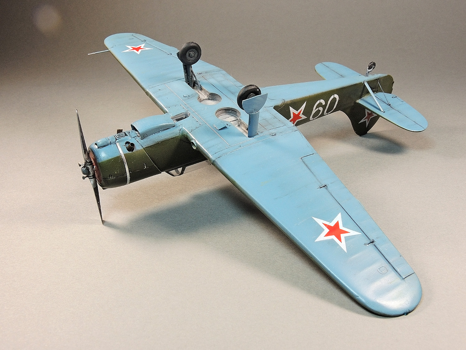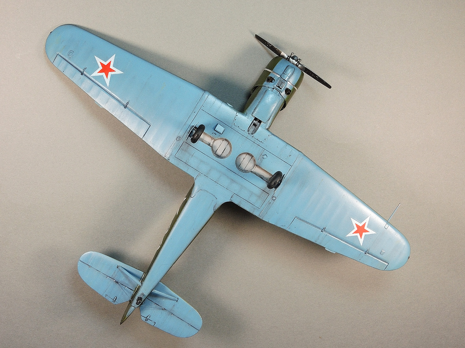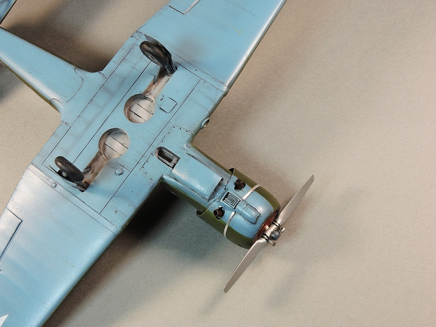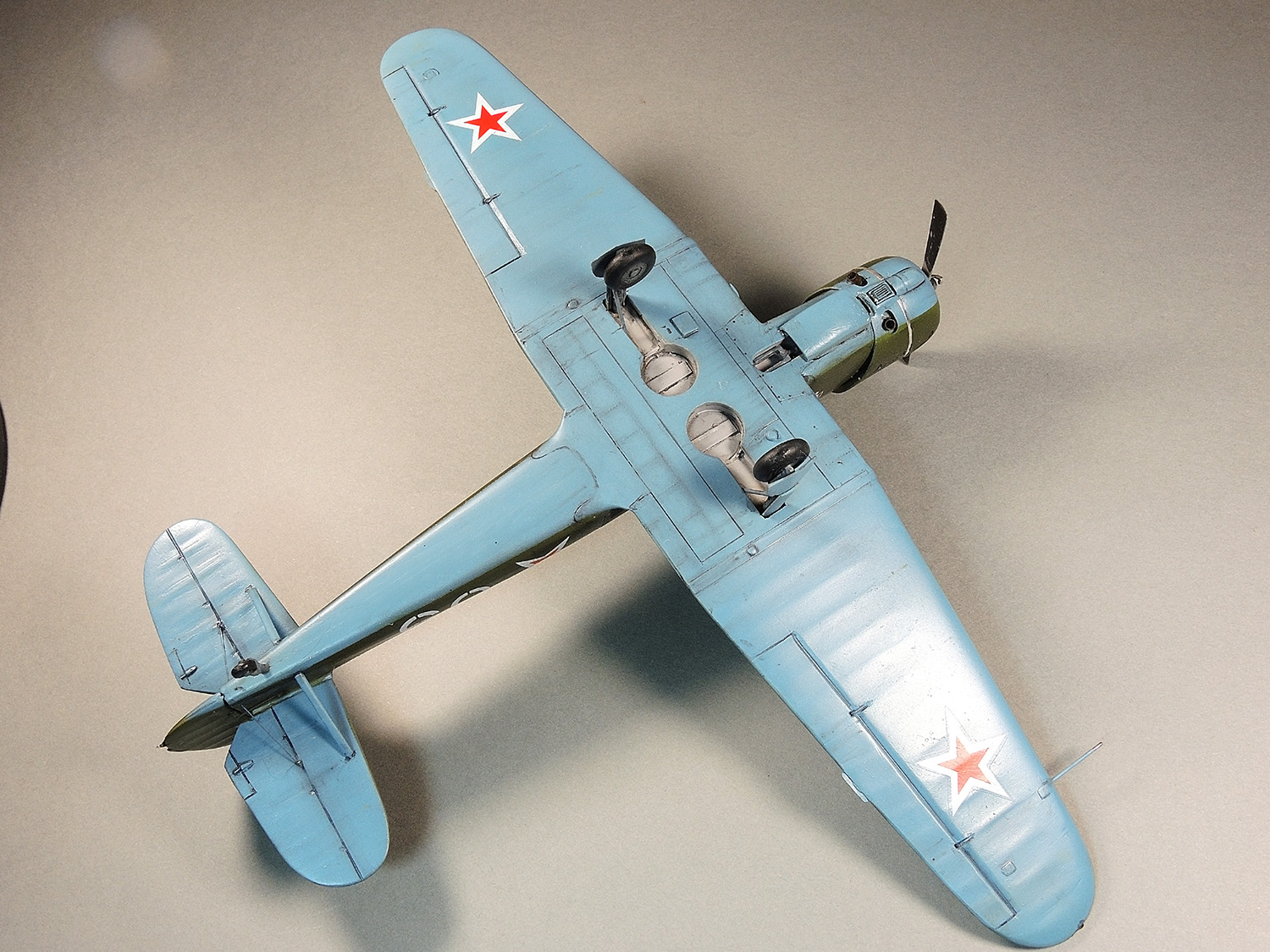 alten Ratten! Спасибо за отзыв! Этот момент не остался мной не замеченным. Но поскольку я делал модель только ПОХОЖЕЙ на прототип, а не его копию, решил сделать чуть иначе. Рассуждая примерно так. Скорее всего створки шасси были на стойках. Но когда самолет "переделывали" под киношный, или в съемочной суете её случайно оторвали (обронили), не придавая потере особого внимания. Только и всего.