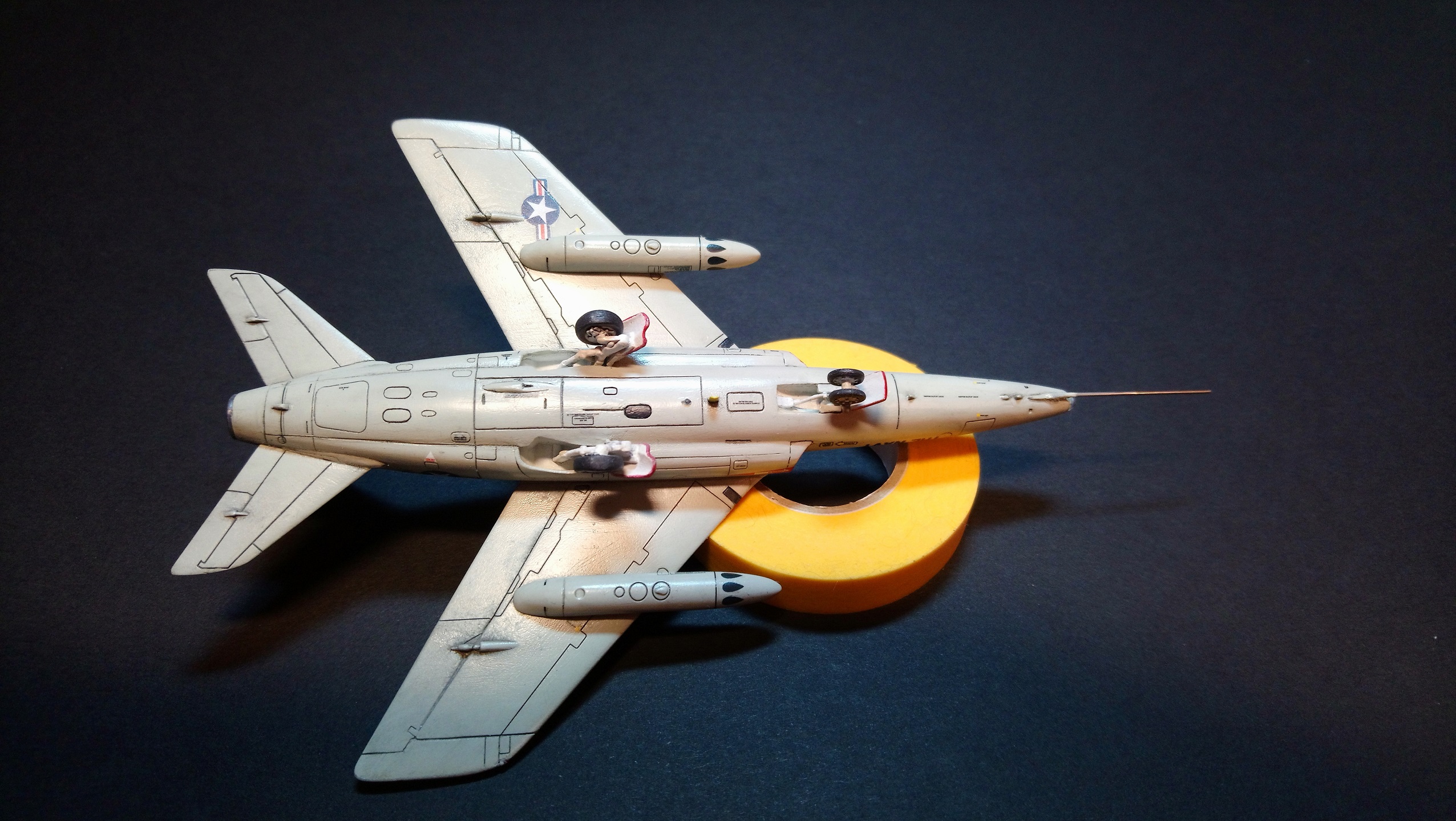 * И вроде бы все, но таких самолетов в Интернете полно. Далее пошло художественное оживление модели - перевел часть технички из оригинального набора и подкрасил кромки створок шасси в красный (прямо как в палубной авиации США).