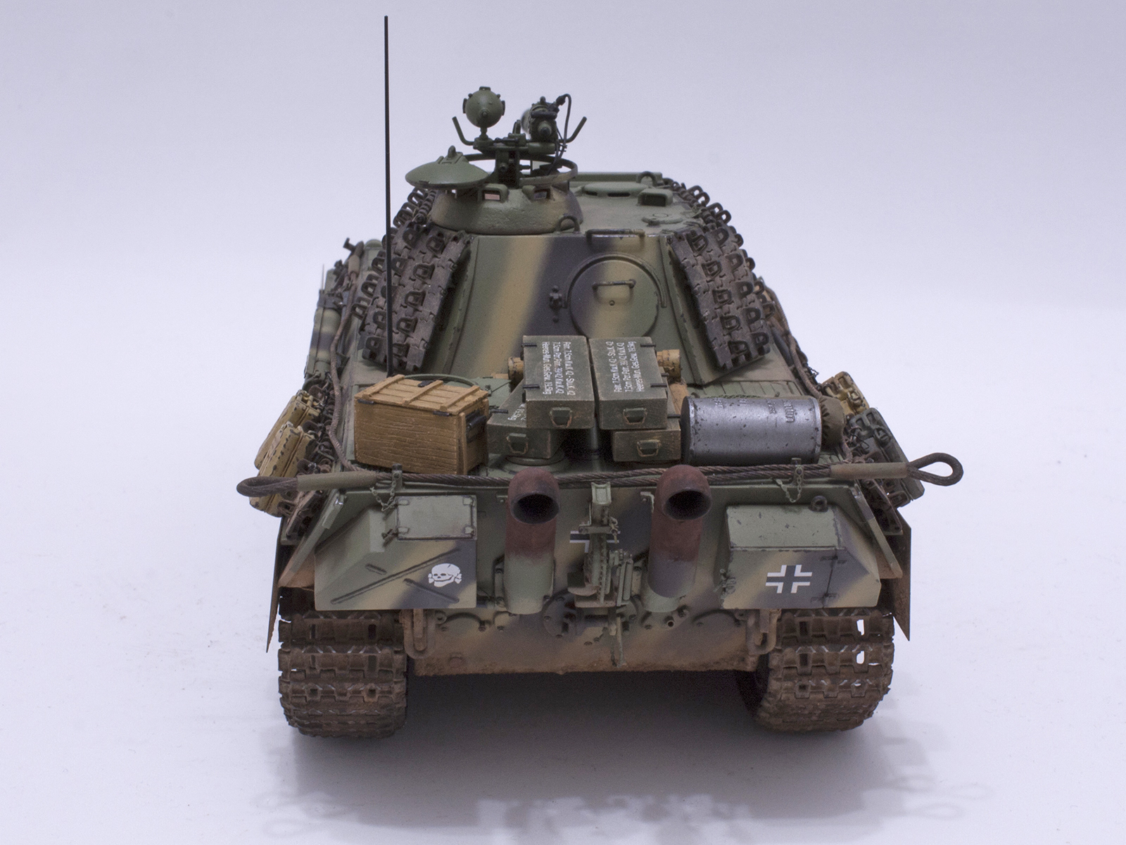 Эту модель Вашу рассматривал часто при постройке Ягдпантеры Г2. Великолепная работа! Ржавчина на пламегасителях идеальна. По мне все же в 35 масштабе полосы лучше бы смотрелись четкими с использованием масок. И быть может чуть сильнейнужна тонировка плоских частей брони. Но тут на вкус и цвет...Обилие «хлама» на корме придаёт реалистичности конечно. Задумался о приобретении тоже