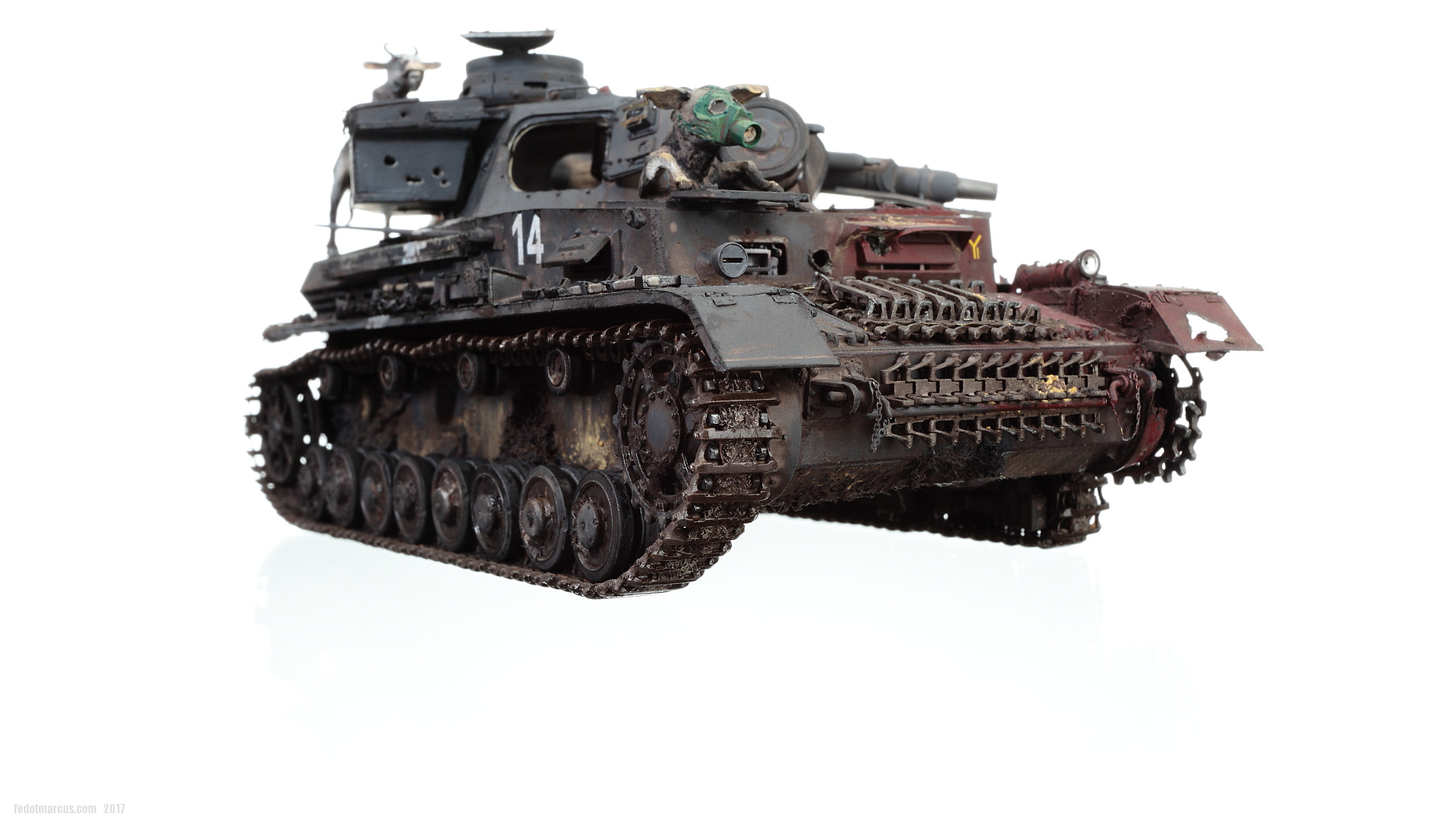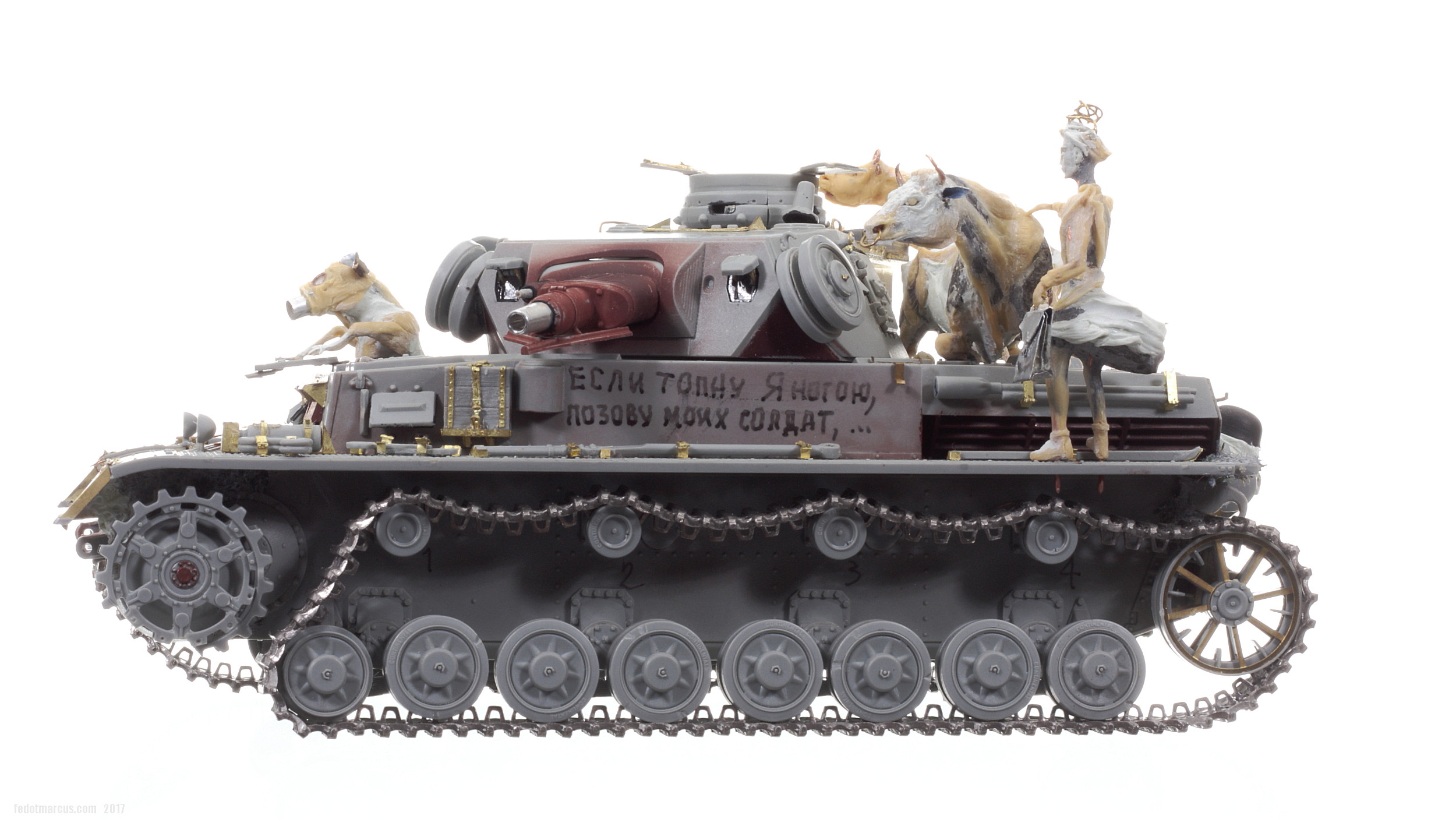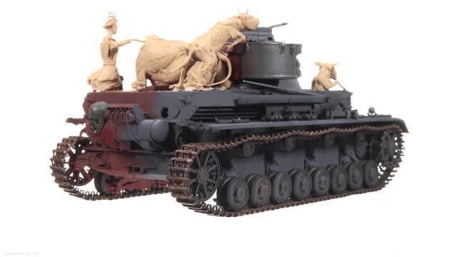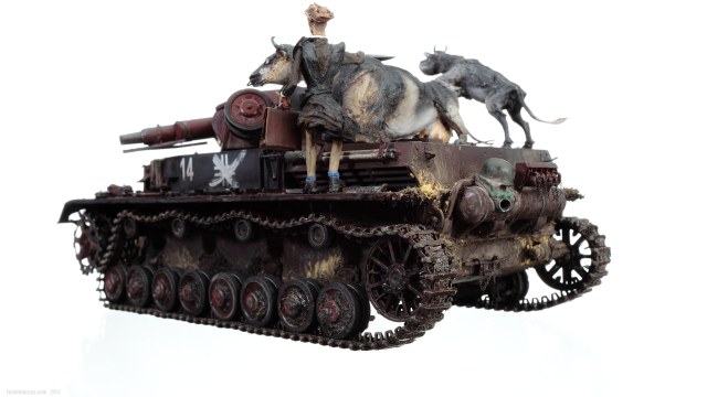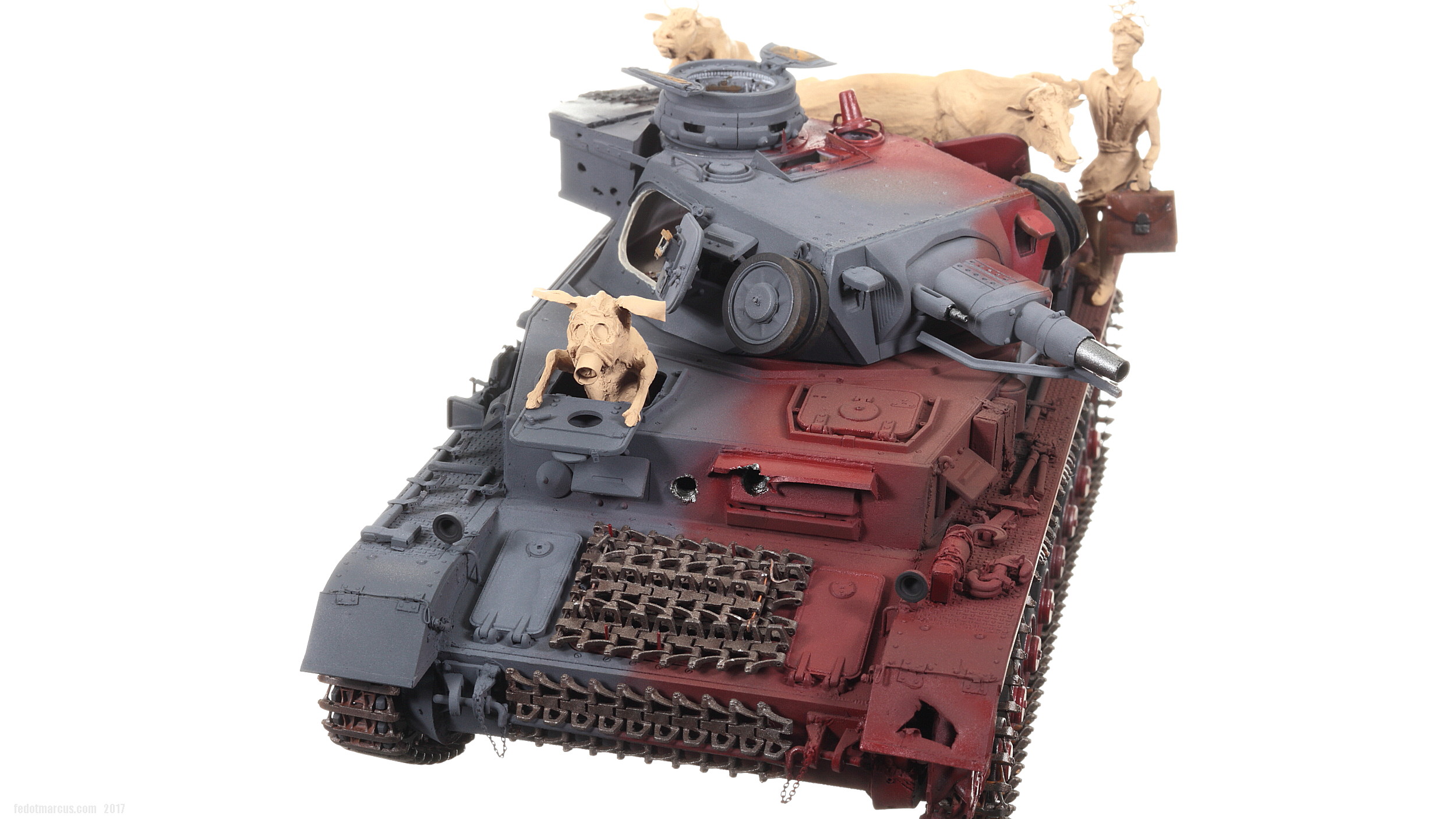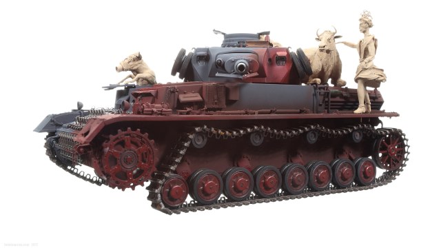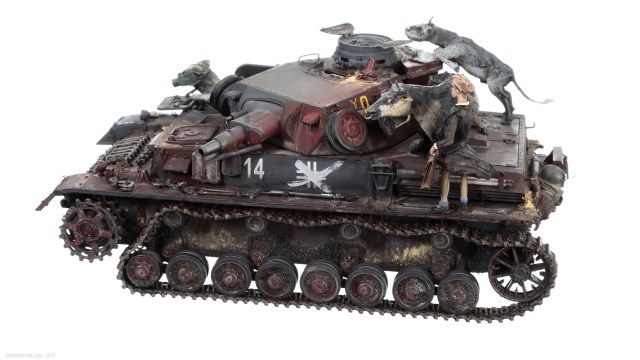 «Дырки» в загрунтованном корпусе, имхо (по задумке автора), означают, что изначально проектируемое изделие не предназначалось для действий на Восточном фронте – в царстве Т-34 и КВ. А значит, априори, не могло равноценно с ними тягаться, т.е. «panzer» обладал оптимистично-иллюзорными шансами на «Блицкриг». Отговорки партайгеноссе (на фоне Германо-Советского торгового соглашения), мол не знали про новые русские танки, их ТТХ, количество, т.п. – переросло в нечто трудно-передаваемое изобразительными средствами: война стала тотальной битвой народов, а процесс – беспощадным ко всему живому.