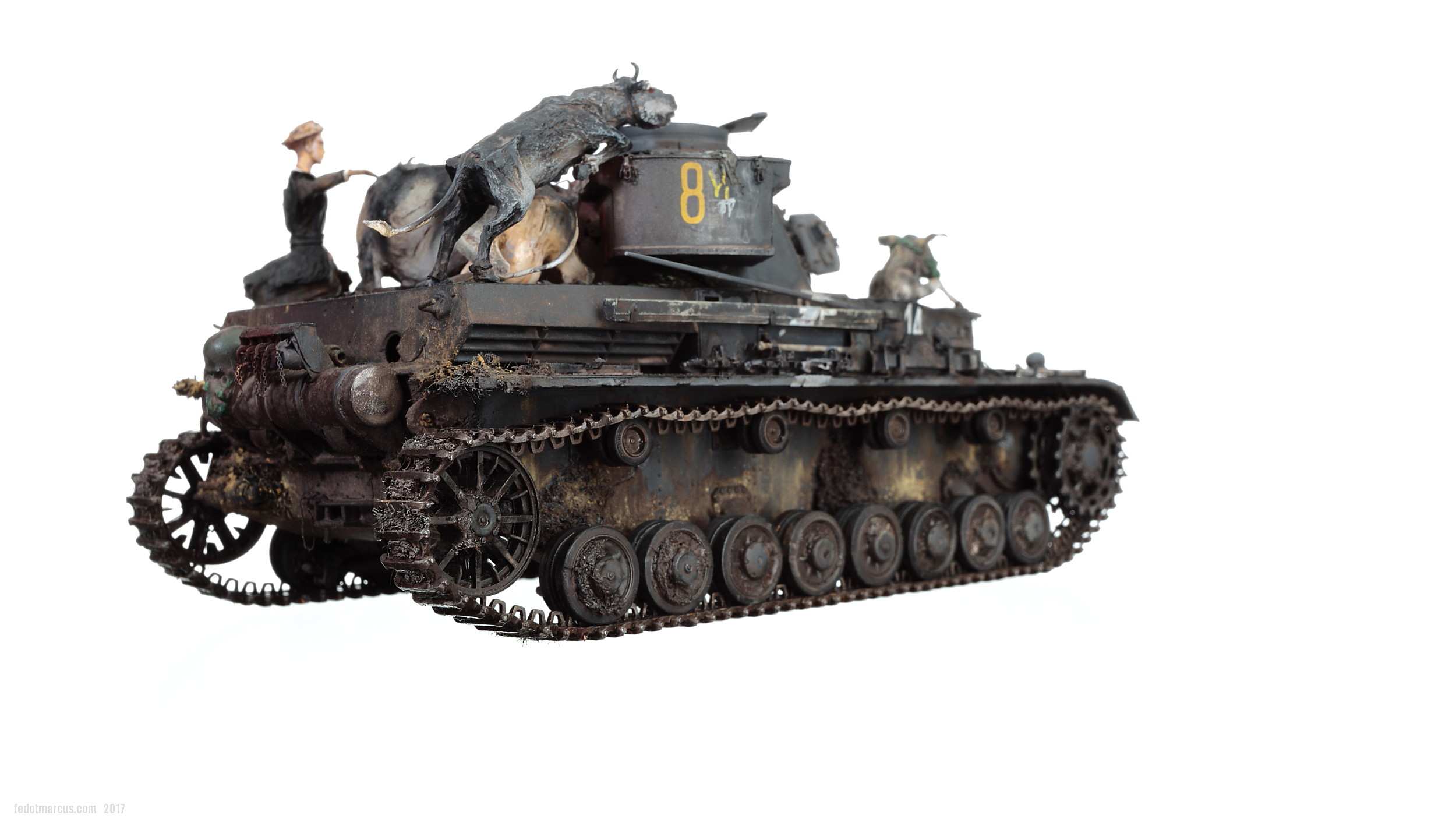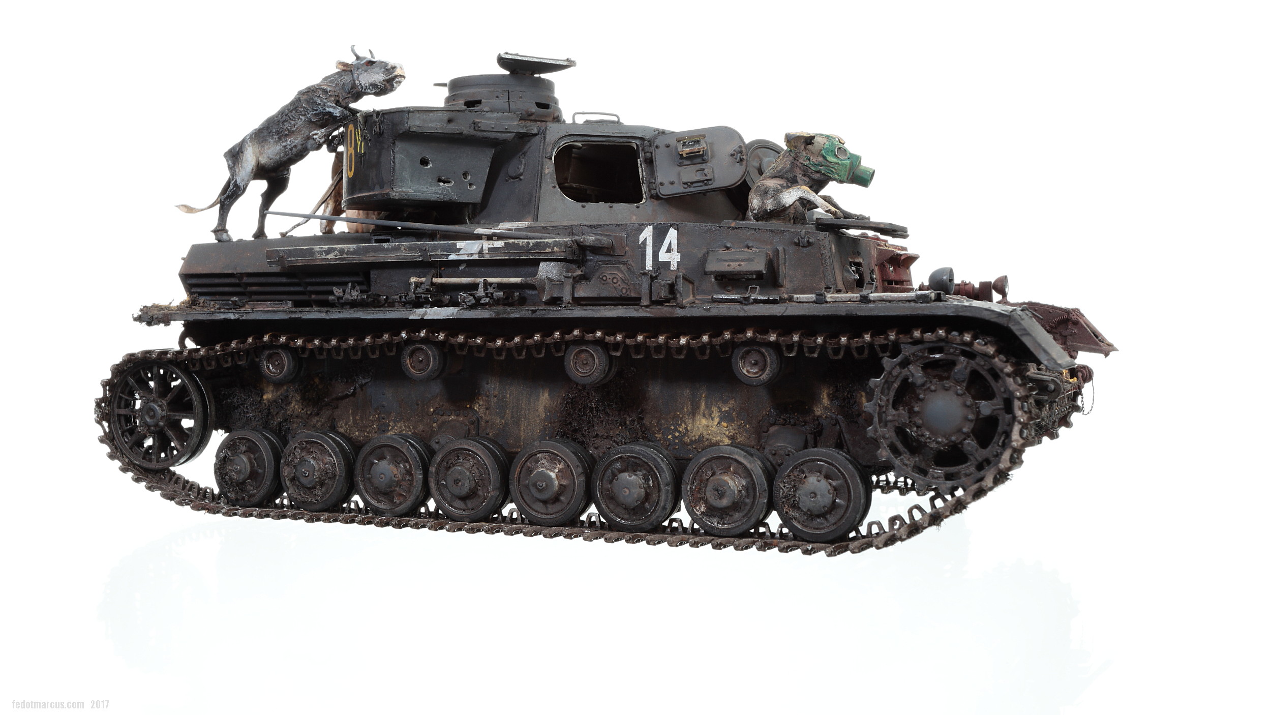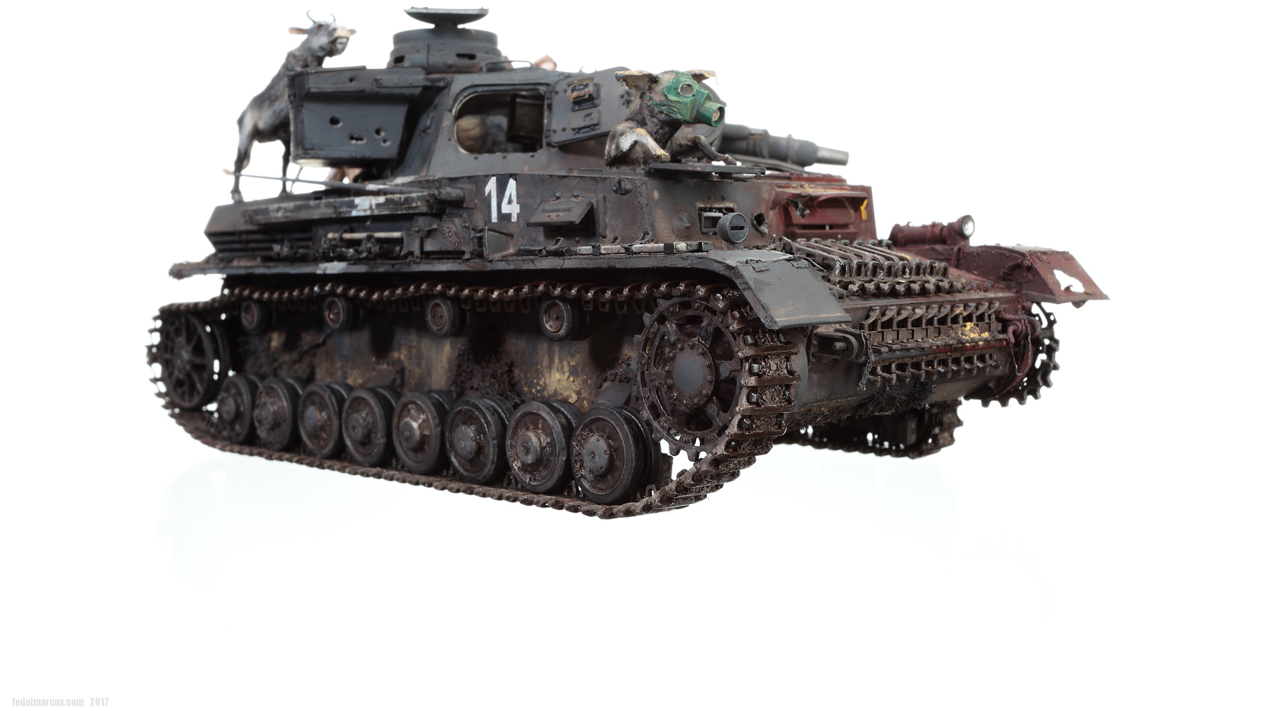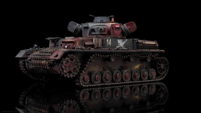 «Дырки» в загрунтованном корпусе, имхо (по задумке автора), означают, что изначально проектируемое изделие не предназначалось для действий на Восточном фронте – в царстве Т-34 и КВ. А значит, априори, не могло равноценно с ними тягаться, т.е. «panzer» обладал оптимистично-иллюзорными шансами на «Блицкриг». Отговорки партайгеноссе (на фоне Германо-Советского торгового соглашения), мол не знали про новые русские танки, их ТТХ, количество, т.п. – переросло в нечто трудно-передаваемое изобразительными средствами: война стала тотальной битвой народов, а процесс – беспощадным ко всему живому.