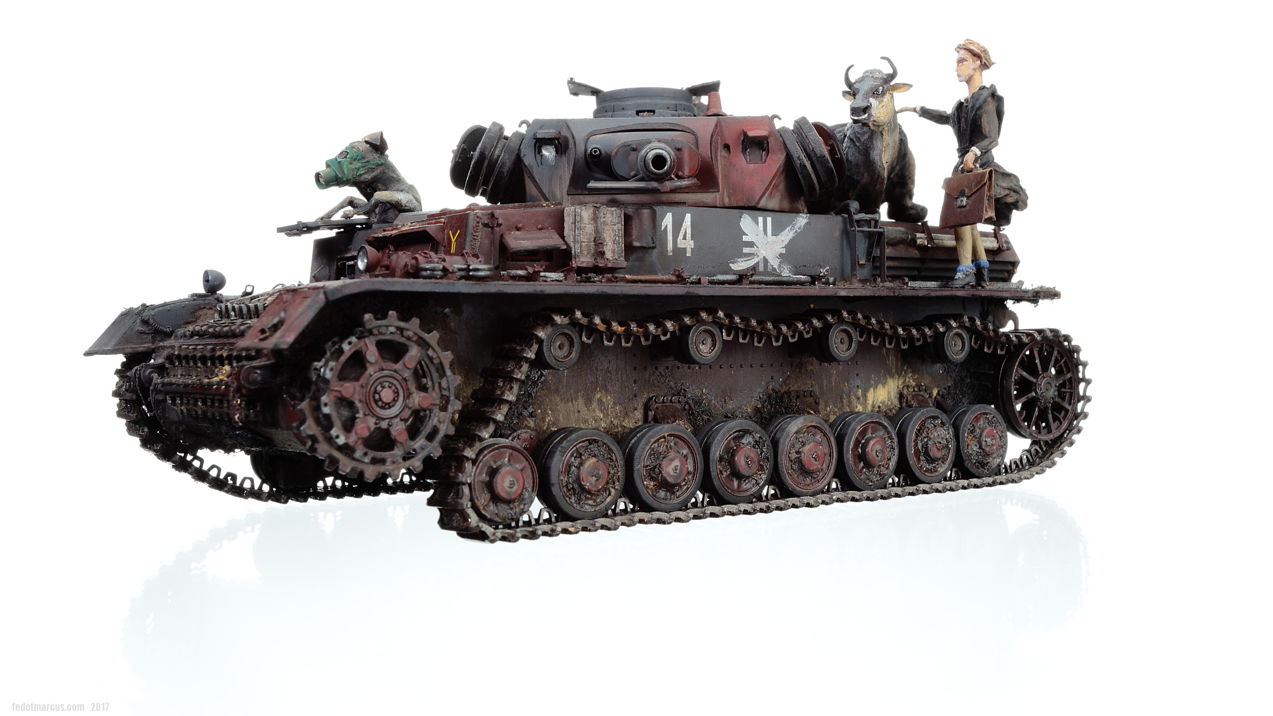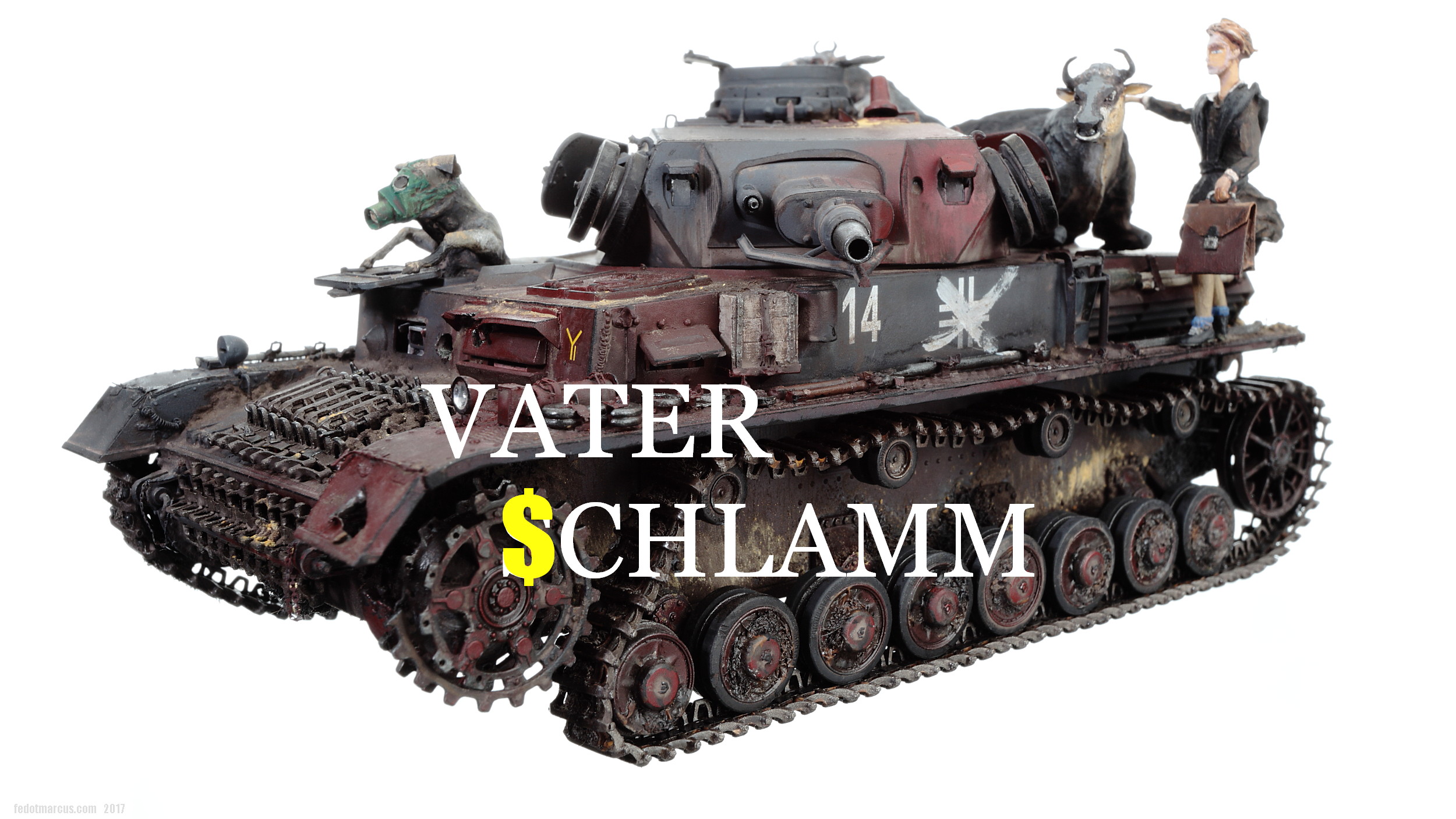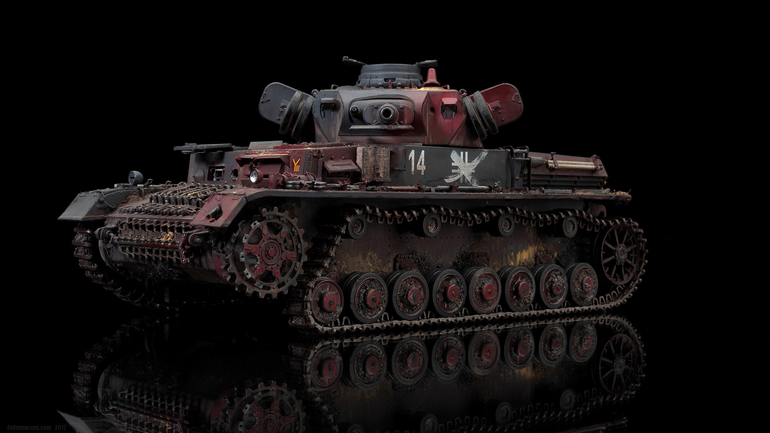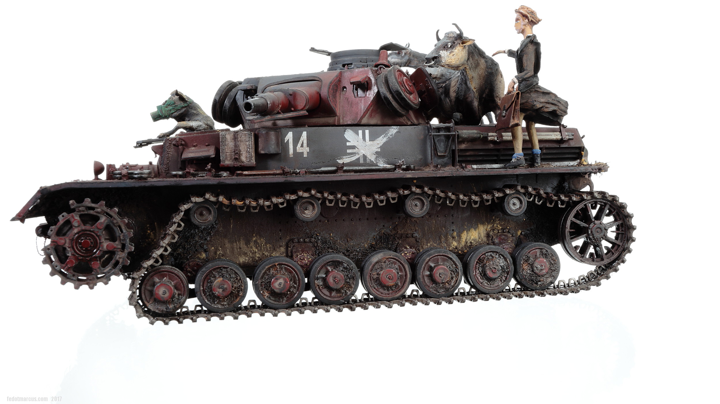 «Дырки» в загрунтованном корпусе, имхо (по задумке автора), означают, что изначально проектируемое изделие не предназначалось для действий на Восточном фронте – в царстве Т-34 и КВ. А значит, априори, не могло равноценно с ними тягаться, т.е. «panzer» обладал оптимистично-иллюзорными шансами на «Блицкриг». Отговорки партайгеноссе (на фоне Германо-Советского торгового соглашения), мол не знали про новые русские танки, их ТТХ, количество, т.п. – переросло в нечто трудно-передаваемое изобразительными средствами: война стала тотальной битвой народов, а процесс – беспощадным ко всему живому.