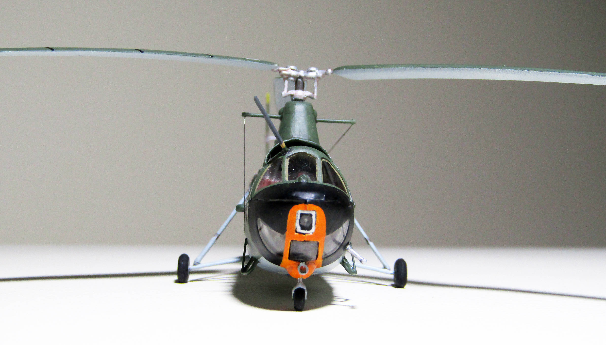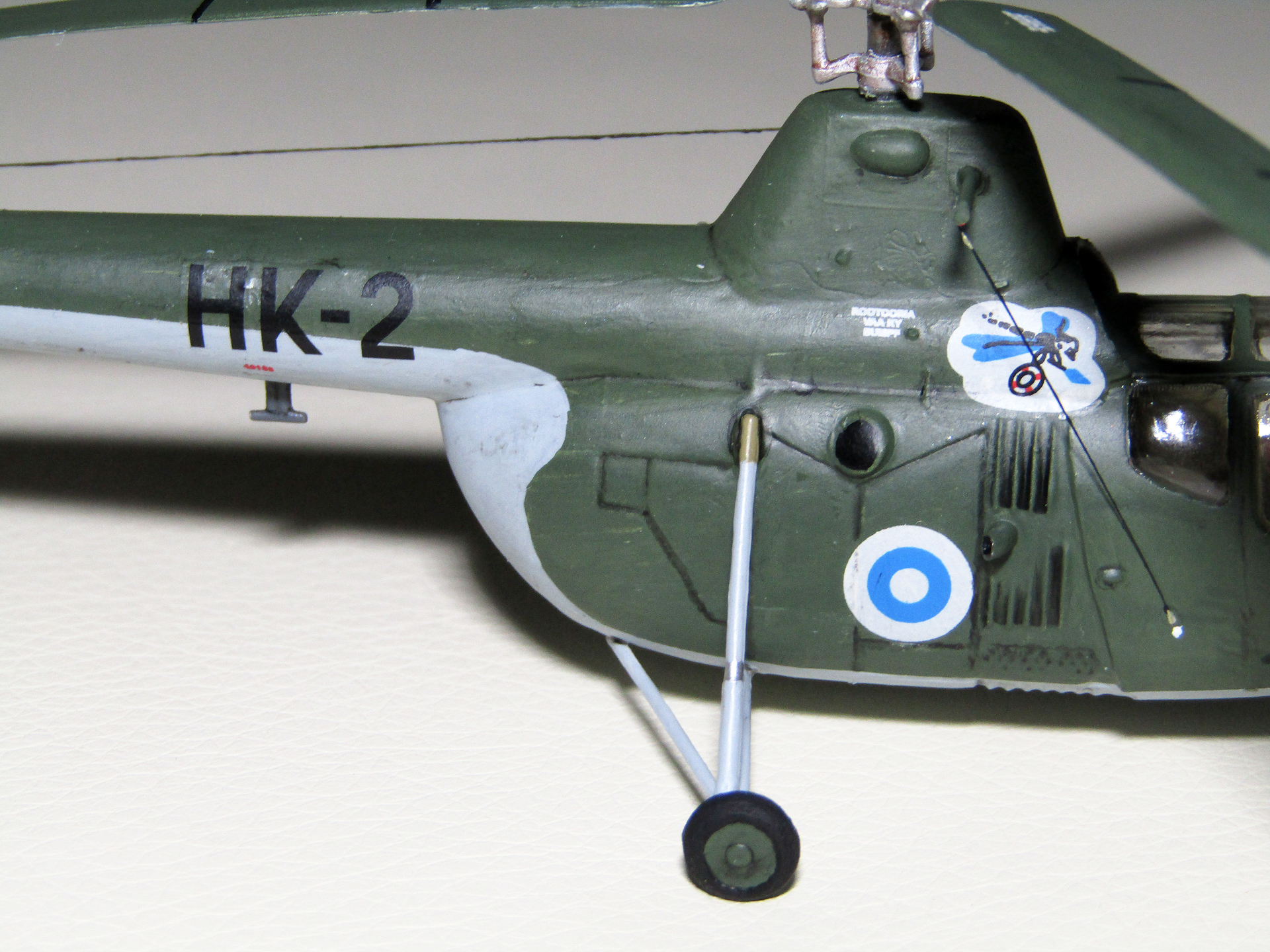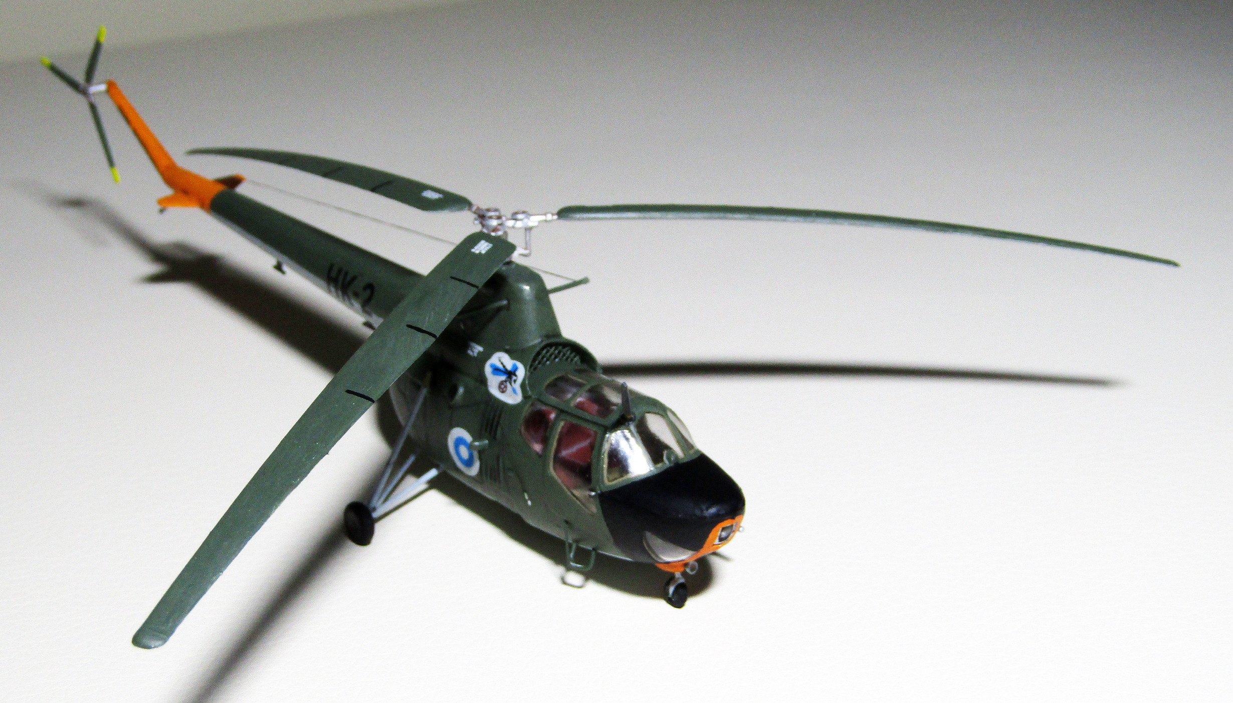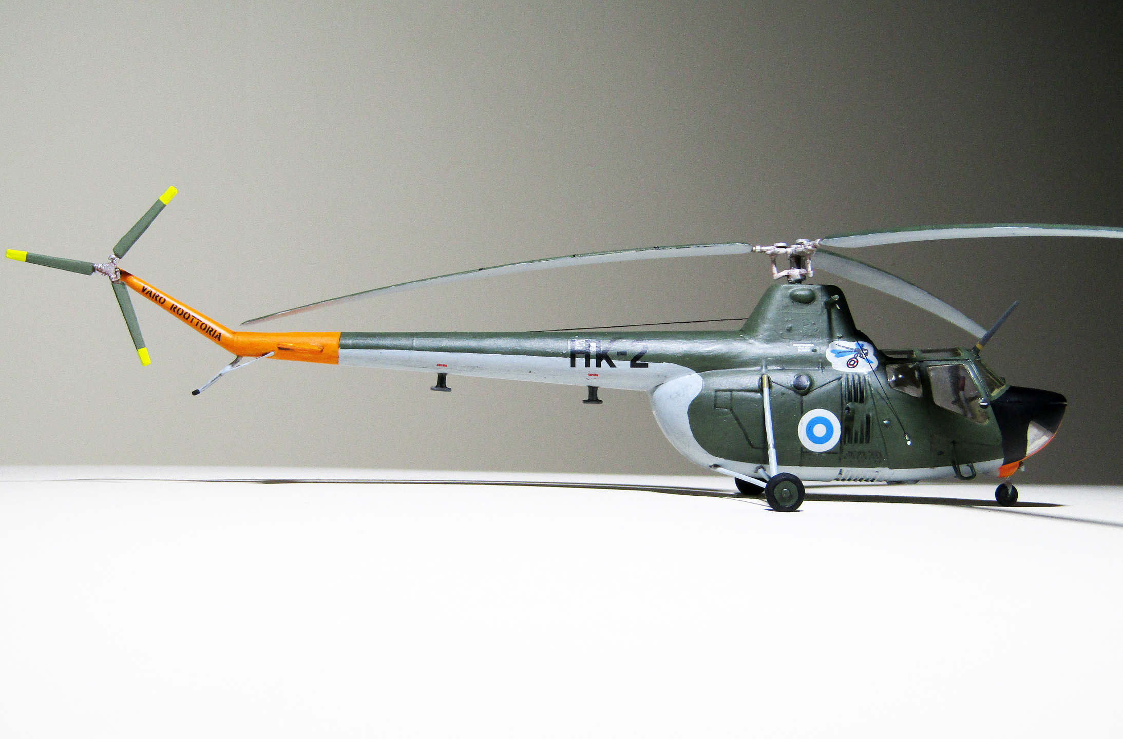 изготовил посадочную фару перед передней стойкой шасси. Грунтовал корпус аэрозолью "Kudo", красил кистью жидко разведённой эмалью от revell и звездовскими акрилами, оранжевые участки ПВА темперой ввиду свойственных ей "ярких свойств". Перед наклейкой декалей покрывал звездовским глянцевым лаком, после смывал акварелью, ну а затем матовой 2-й от revell. Цветовую схему использовал коробочную (как я понял это Егерская парашютная школа, сформированная в 1961 году) от производителя, также использовал фотографии отдельных элементов музейного экспоната польского вертолёта pzl sm-1, который находится в музее авиации города Вантаа в Финляндии. От коробочной отличаются они количеством оранжевой краски на носу вертолёта, ну и бортовым номером (HK-2, а не HK-1). В общем, работа заняла около 2-х недель и доставила только удовольствие. Приятного просмотра коллеги....