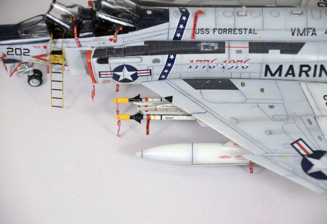 Сошлифовал расшивку и срезал все дурацкие замыленные антенки. Перерезал заново всю расшивку полностью. Кабинет смоляной (не помню уж какой фирмы). Воздухозаборники закрыл заглушками сделанными самостоятельно из пластика по фото. Сопла двигателей дополнил лепестками из фольги. Заполнил ниши шасси всякой проводкой. БАНО – цветные шпажки. Окраска классическим способом с постшэйдингом. Эмаль Revellи Humbrol. Смывка и подтёки – уайт-спирит с эмалями. Фонарь искупал в Футуре. Ну и обвес Эдуардовскими лентами RemoveBeforeFlight. Лестница - травление от Эдуарда.. Вот собственно и всё.