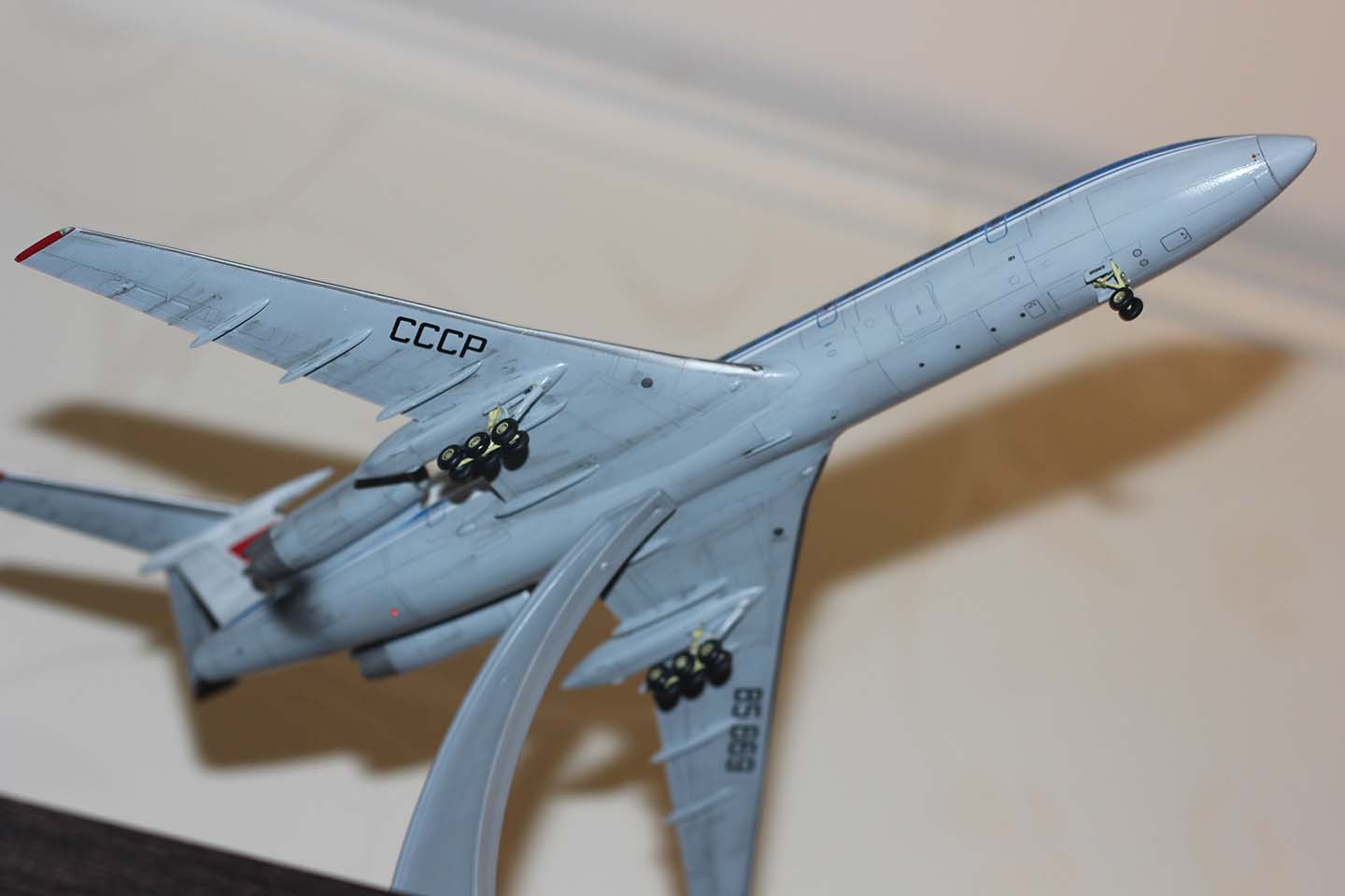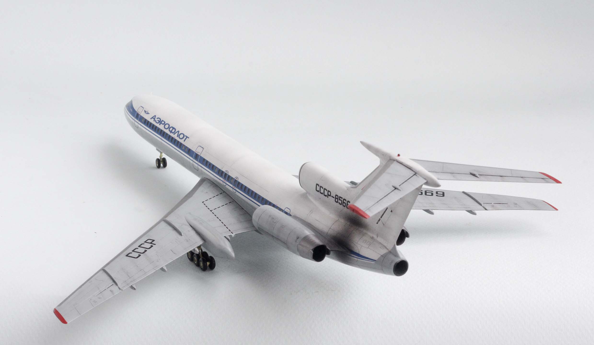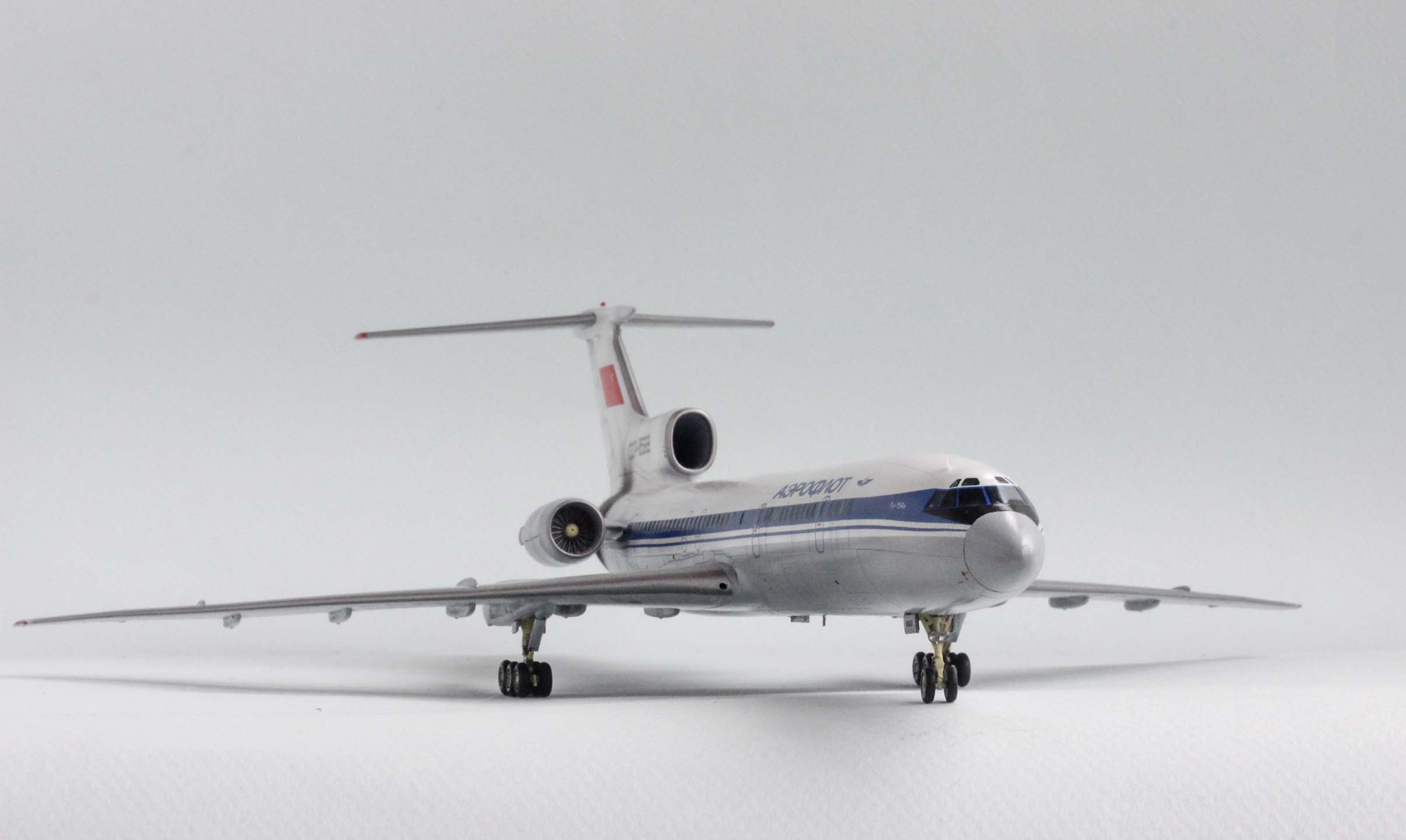 Я понимаю, что основные стойки не стали укорачивать, потому как жаль было тратить на них время. Щитки носовой стойки (и воздухозаборники в корне) не стали переделывать потому, что не все на них обратят внимание, но хотя бы минимум, меняющий облик модели, сделать можно было? -> опустить носок стабилизатора на 1.6 мм. (от продольной оси 3 градуса на кабрирование). Тем более, что стойки не нагружены.