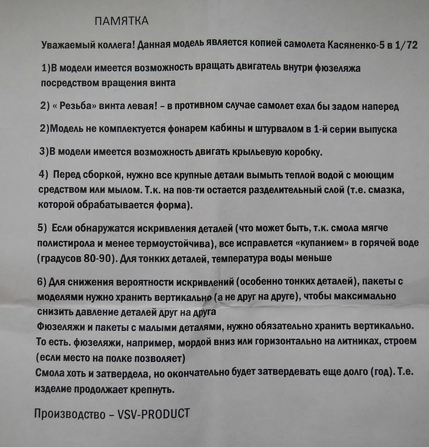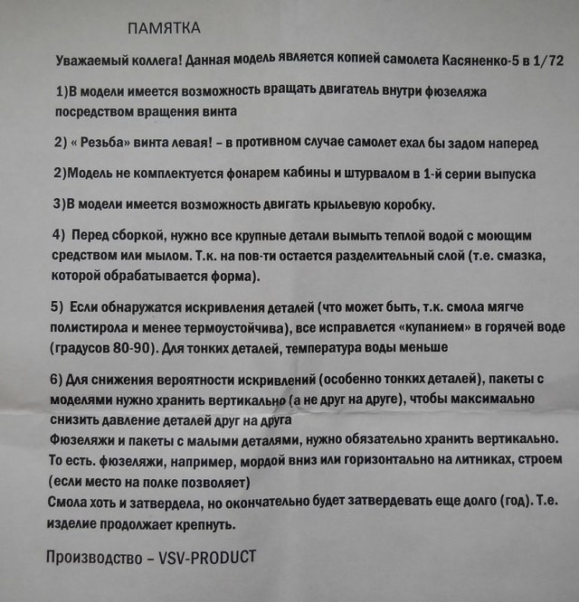 Модель из смолы от фирмы VSV-PRODUCT в масштабе 1/72 упакована в картонную коробку с верхним открытием. Не смотря на малые размеры самолёта набор содержит почти четыре десятка деталей. Интересно то, что предлагается сделать двигатель вращающимся вместе с винтом. Колёса шасси, скорее всего, придётся заменить на спицованные. Стойки также потребуют замены. Присутствуют ваку-козырёк и инструкция по сборке.