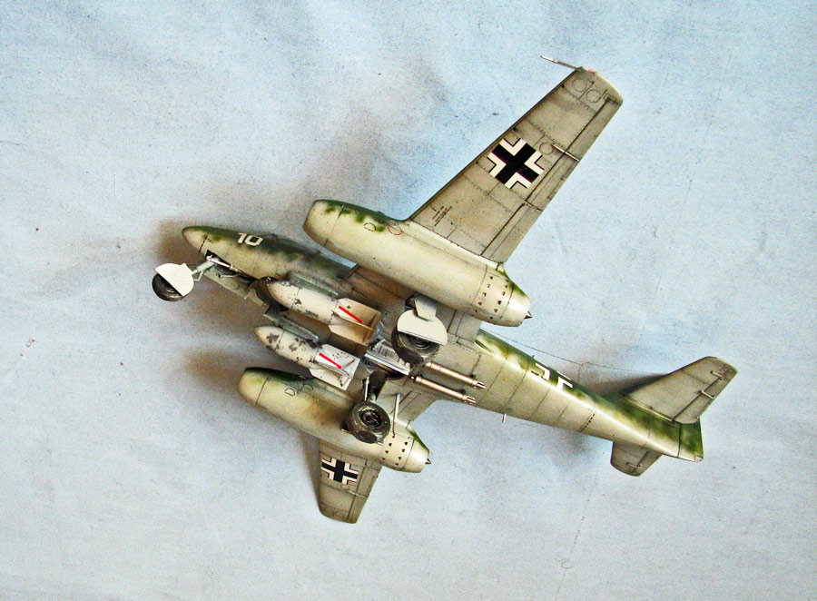 Модели Ме-262-х на моей полке имеют разные камо и не хотелось повторять окраски. Сперва окрасил под стандартный камо — верх РЛМ 82/83 + поверху полосы светлой краски типа Скай и по ним зеленые змейки РЛМ 83. Но затем решил перекрасить в более спокойный вариант РЛМ 82/83/74. Далее лак, смывка, одекаливание, лак, тонирование...