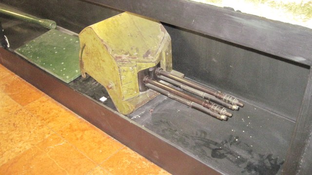 Стенд с вооружением итальянской бронетехники(САУ и танкетка), спаренная пулемётная установка, интересная конструкция, да ещё с оригинальной краской.