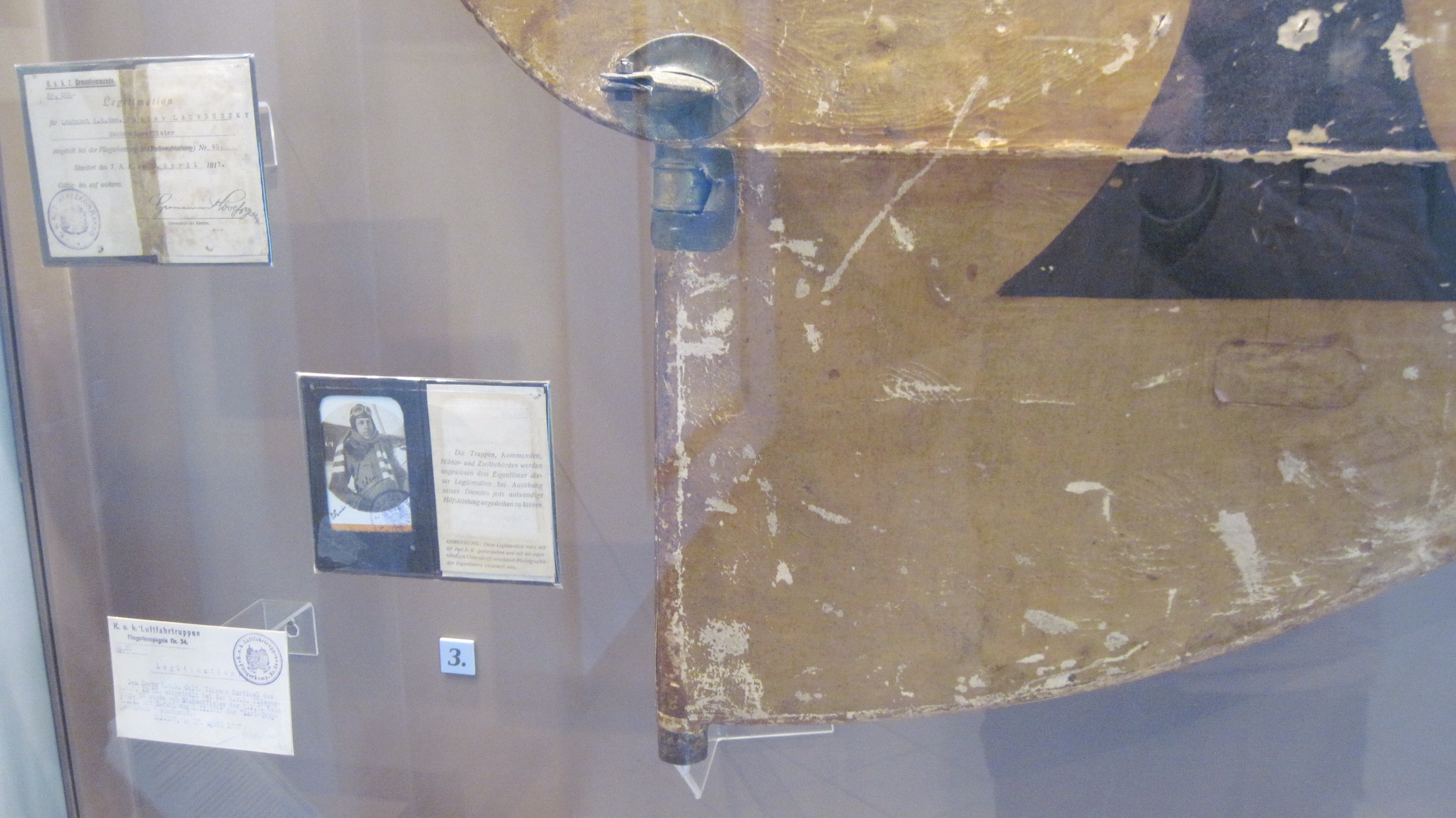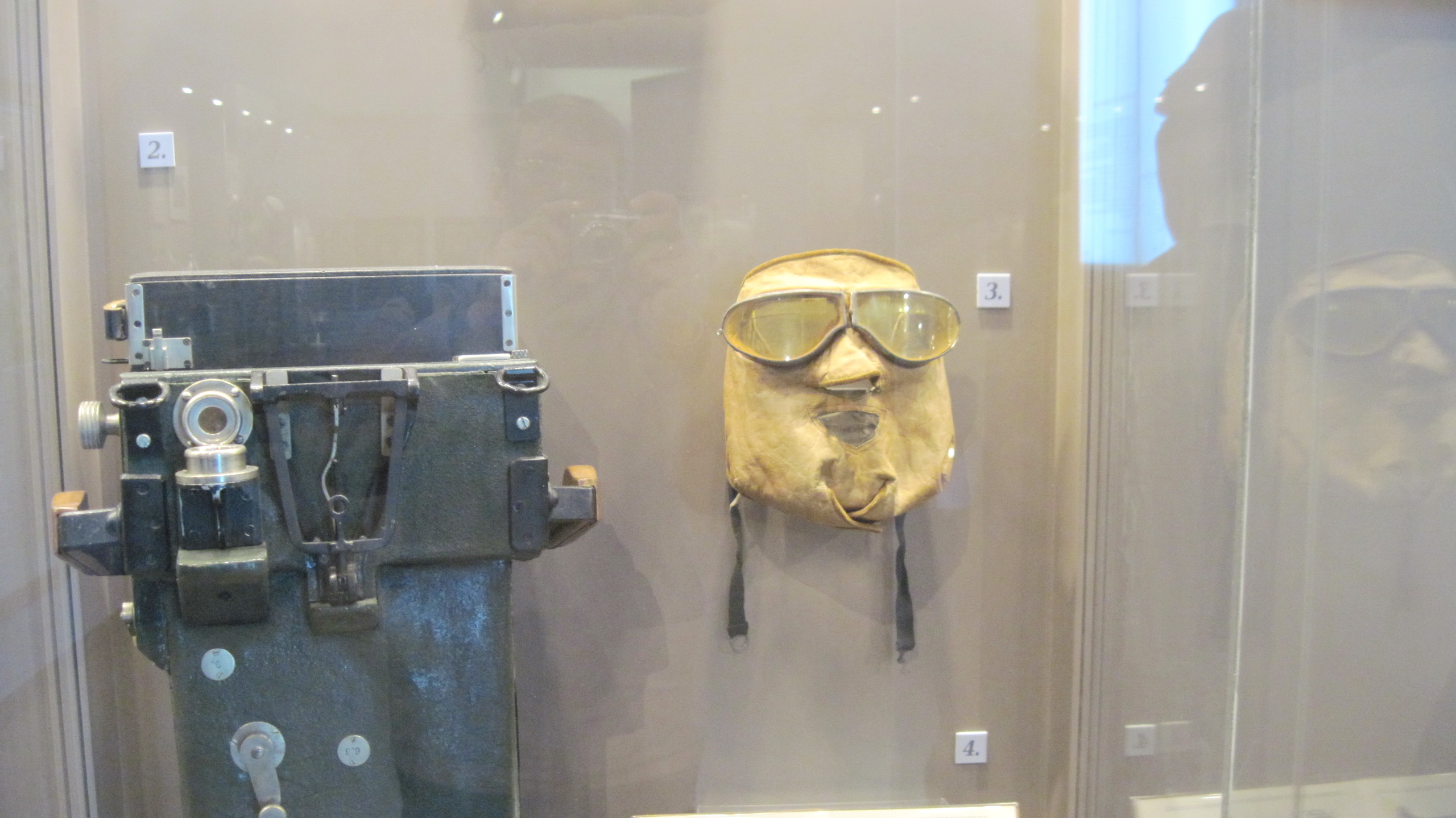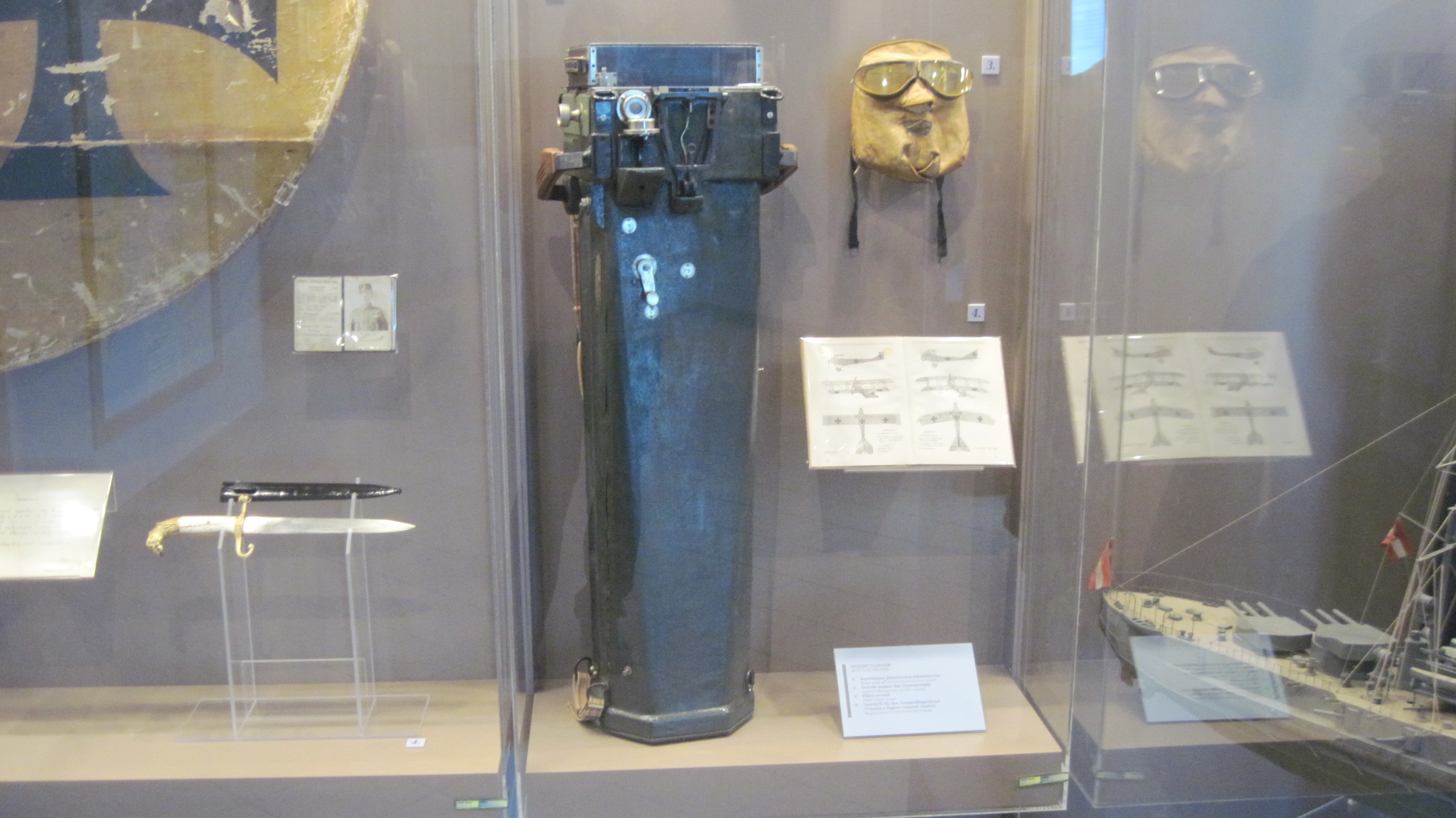 Раздел, посвящённый авиации 1 МВ. Руль направления от Фоккера, с оригинальной окраской. Австрийская фотоустановка, маска, сбрасываемый вымпел.
