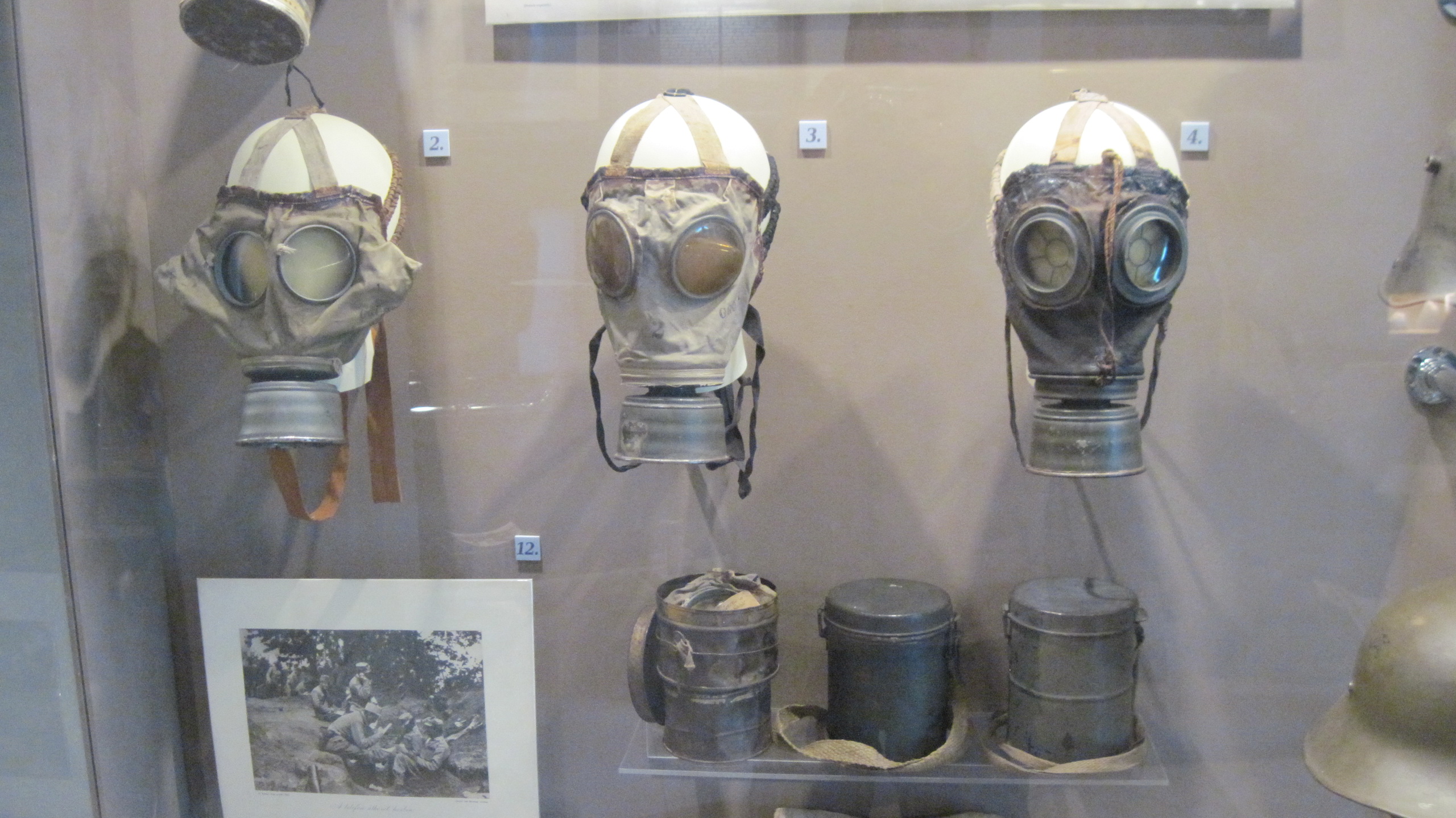 Стенд с противогазами 1 МВ, всех воюющих сторон.