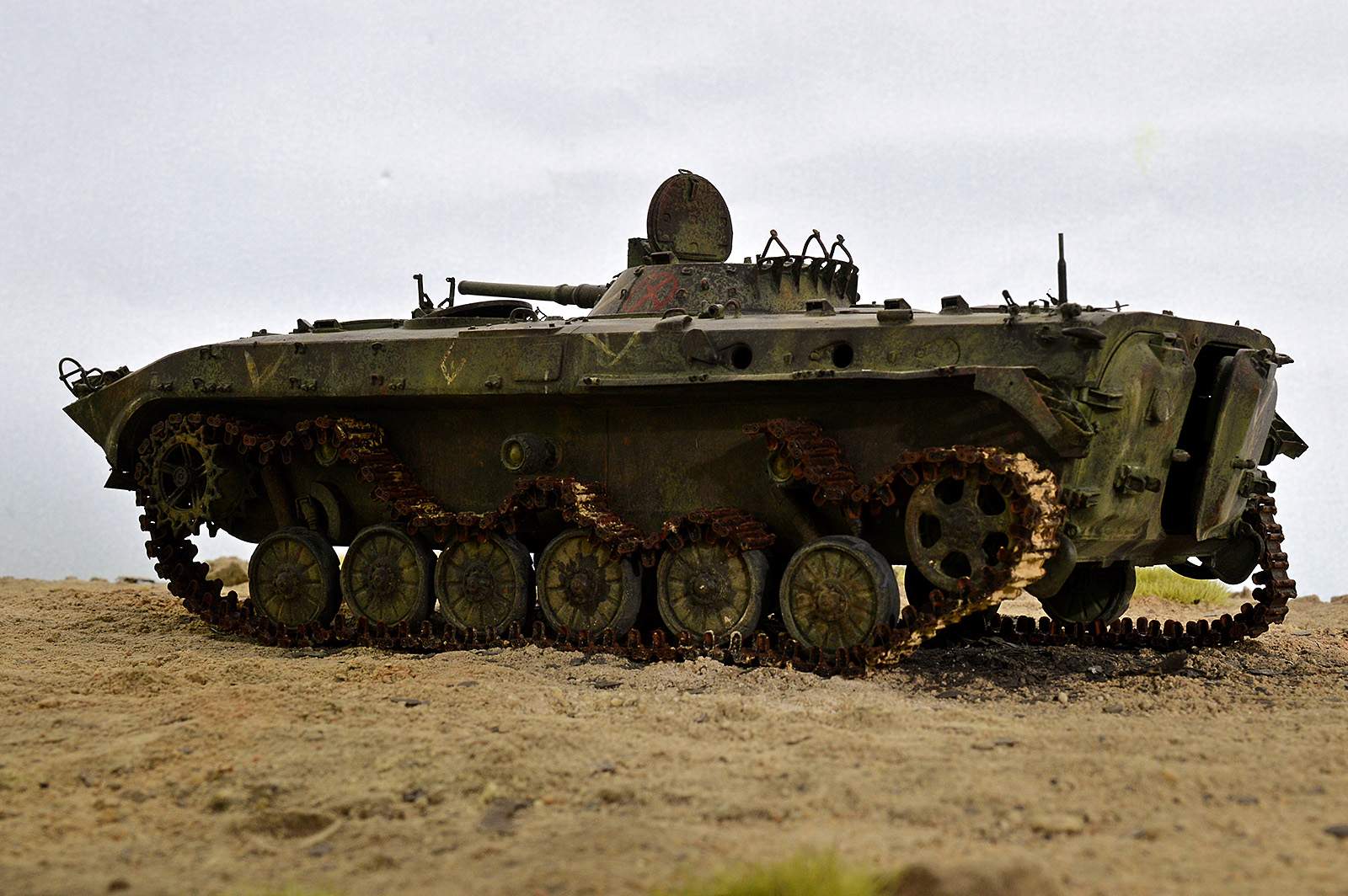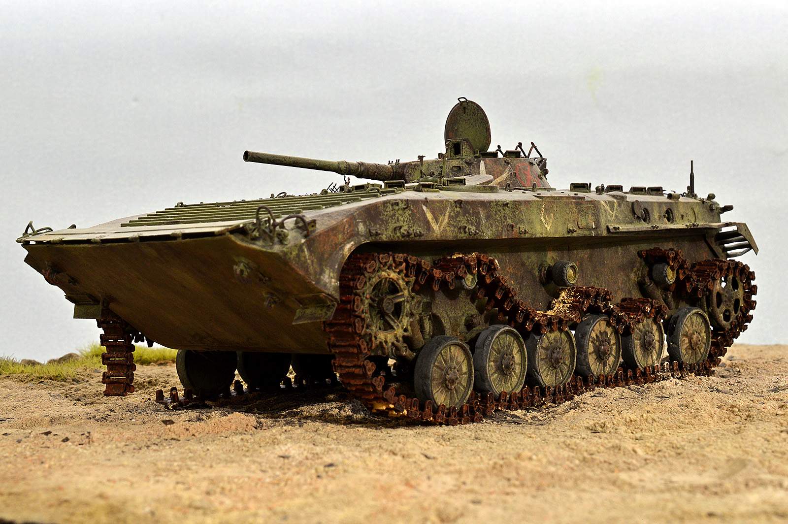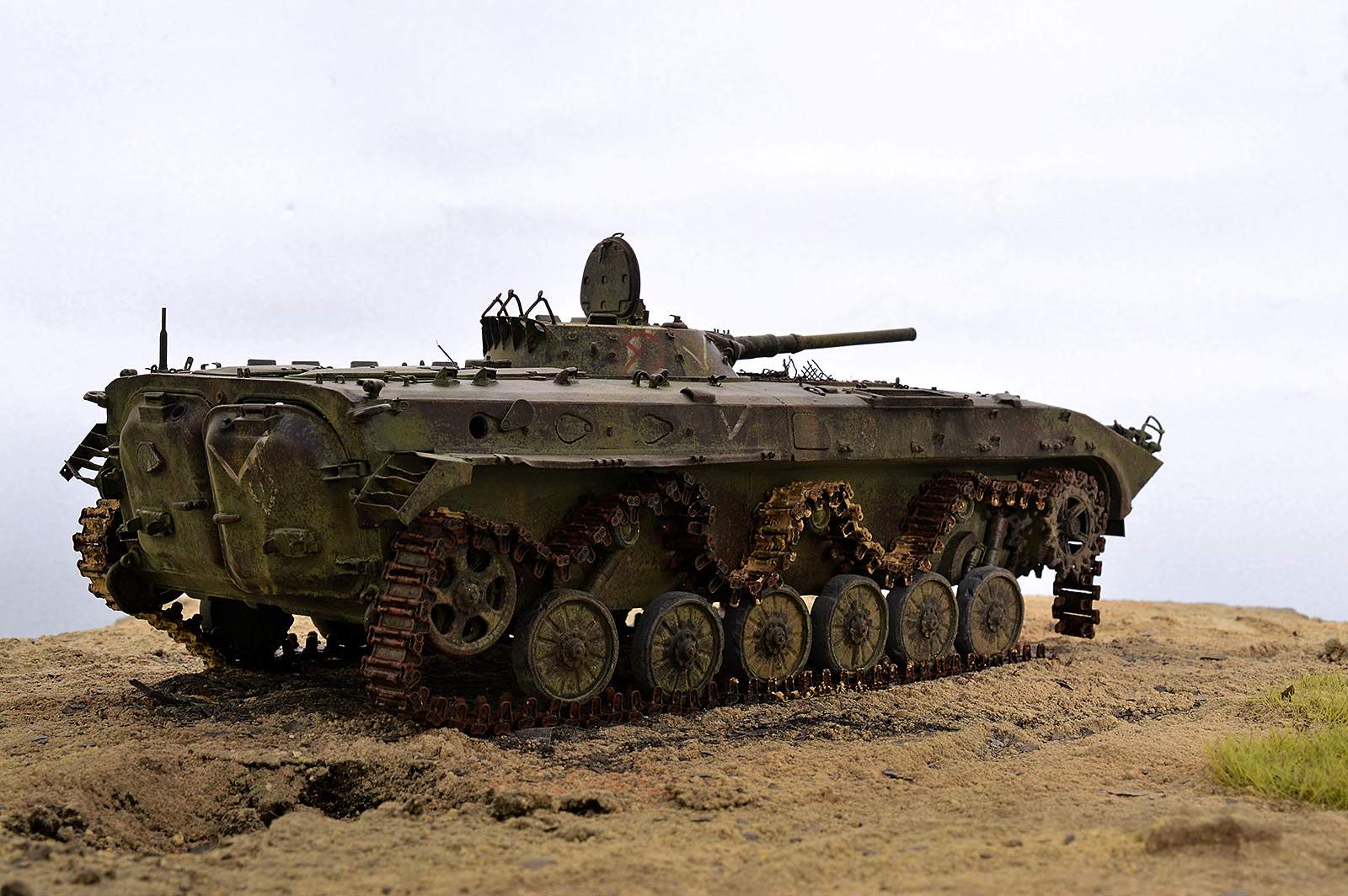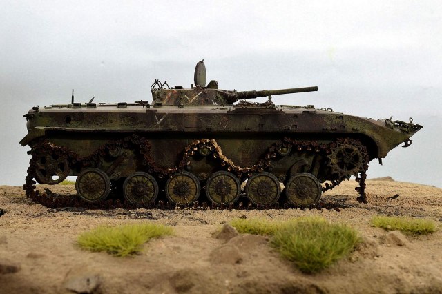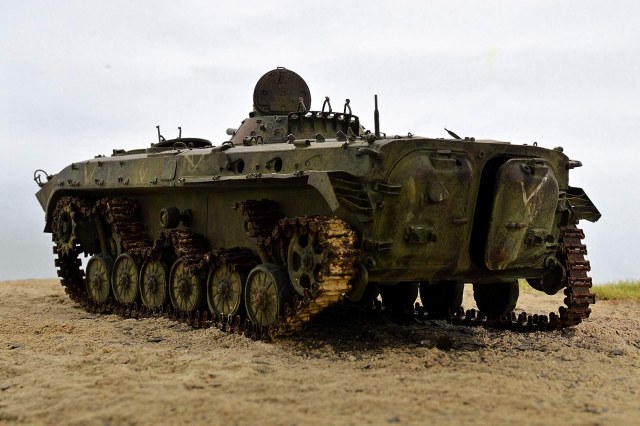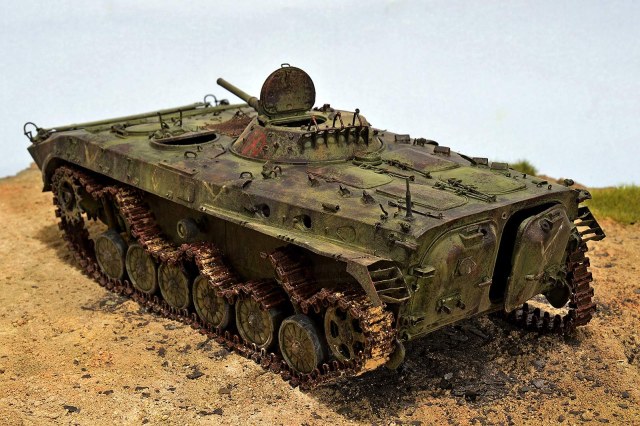 Всем привет!!! Представляю вашему вниманию БМП-1 от TRUMPETER. Отличный набор! Нет не так… Просто замечательный набор, но требует должного подхода. Данная модель не является прототипом конкретной машины. По матчасти сделал полную деталировку по мере своих способностей. Наверняка где-то что-то пропустил (уже знаю где), но я старался, изучая и работая по фото реальной машины. С траками, может быть, чуточку перержавил, но 30-ти летние приблизительно так и выглядят, в зависимости от климатической зоны. Для дальнейшей работы требуется такая вот потёртая машина.