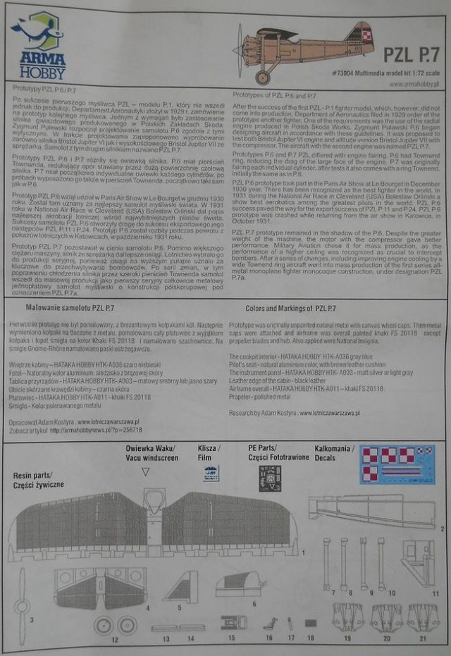 Модель из смолы от фирмы Arma Hobby в масштабе 1/72 (номер по каталогу 73004) упакована в прочную картонную коробку с верхним открытием. В наборе представлен прототип - PZL P.7/I. Литьё отличного качества. Интересно сделано членение планера. Проработка внешних поверхностей исполнена на высоком уровне. Присутствует плата с фототравлением. Шкалы приборов выполнены на плёнке. Ваку-козырёк кабины отменного качества. Декали смотрятся замечательно. Инструкция весьма подробна и информативна.