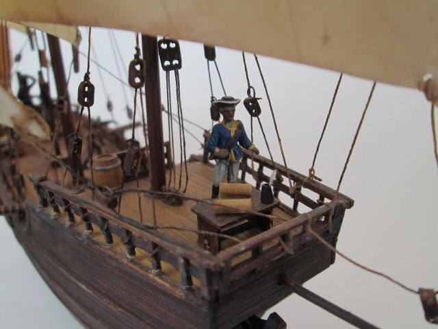 Из замечаний, добавлю к уже озвученным: фок-мачта в пятнерсе палубы болтается (надо было либо нитку намотать на мачту, либо закрыть тканью) и слишком рыхлые узлы на такелаже.