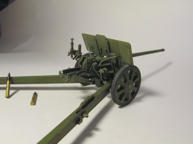 Первое знакомство с этой не самой дешевой фирмой, впечатления самые положительные. Очень хорошая детализированная модель с прекрасной стыкуемостью, в наборе небольшая плата фототравления, декали, даны три различных снаряда. Из минусов - очень ненадежное крепление подвижных элементов, пришлось фиксировать намертво. Кроме того, немного удивили декали на снарядный ящик - на немецком языке, только для трофейного варианта.