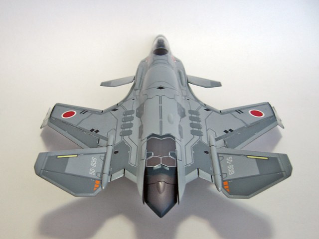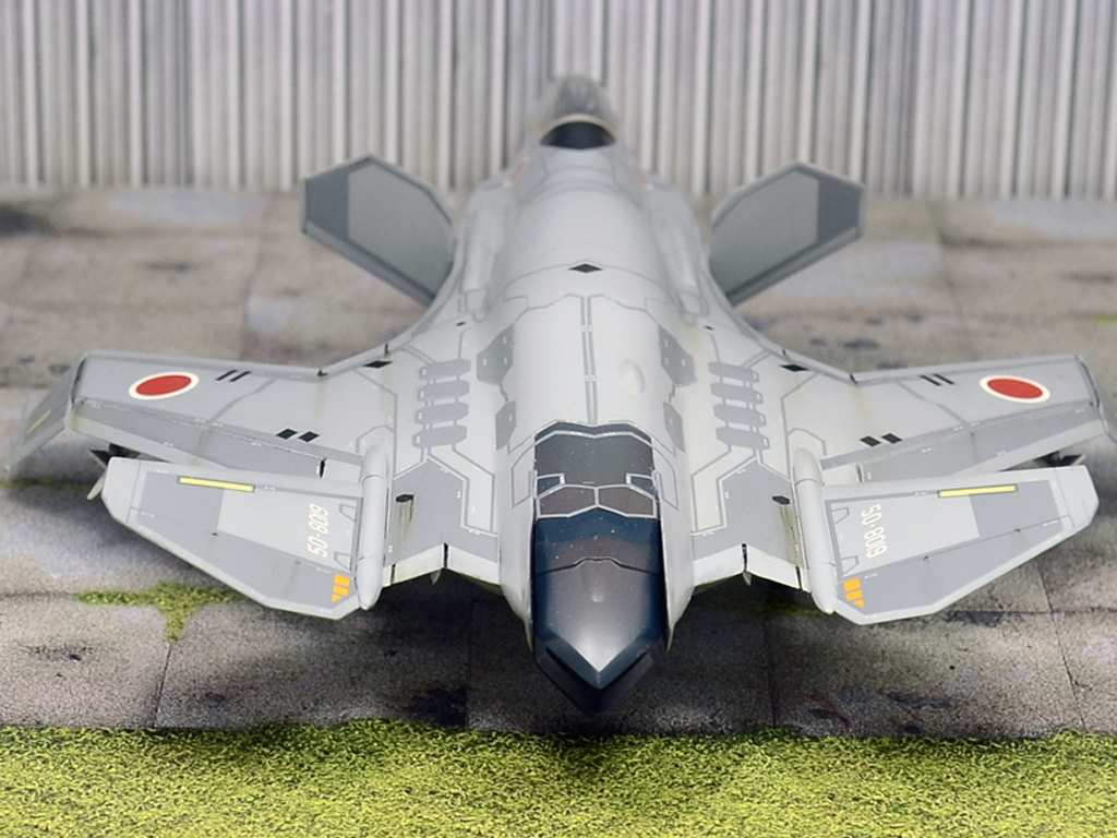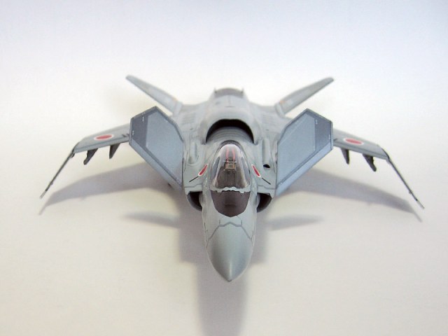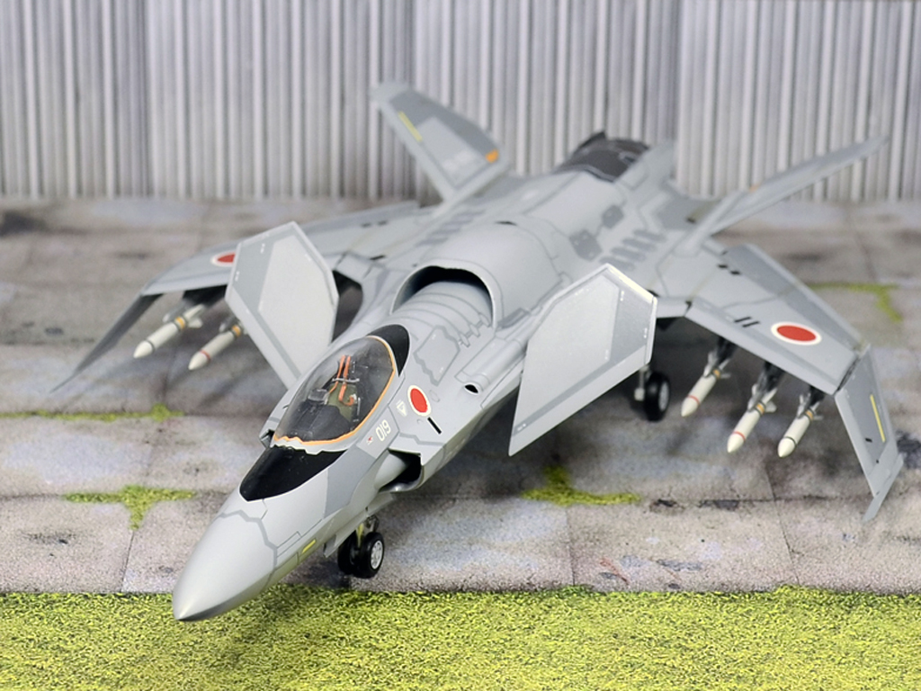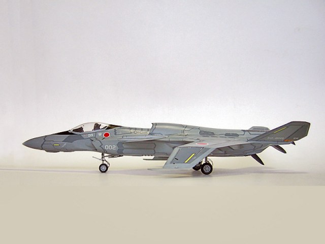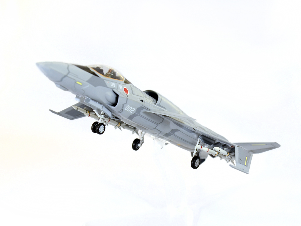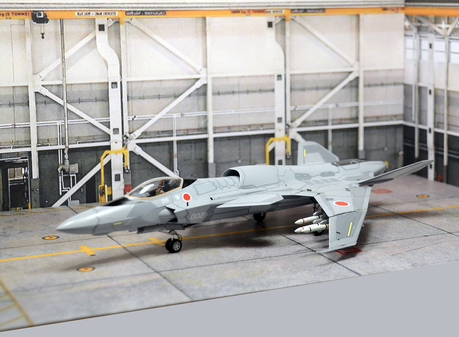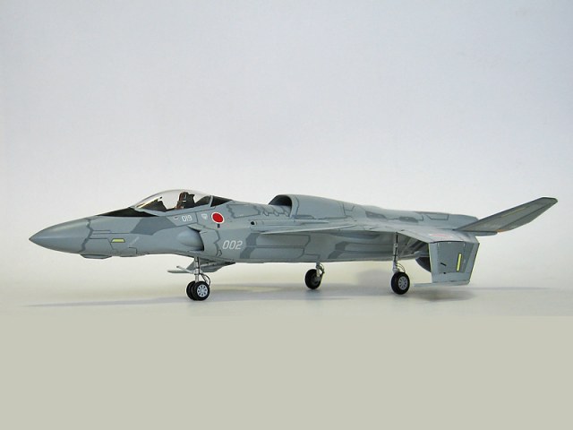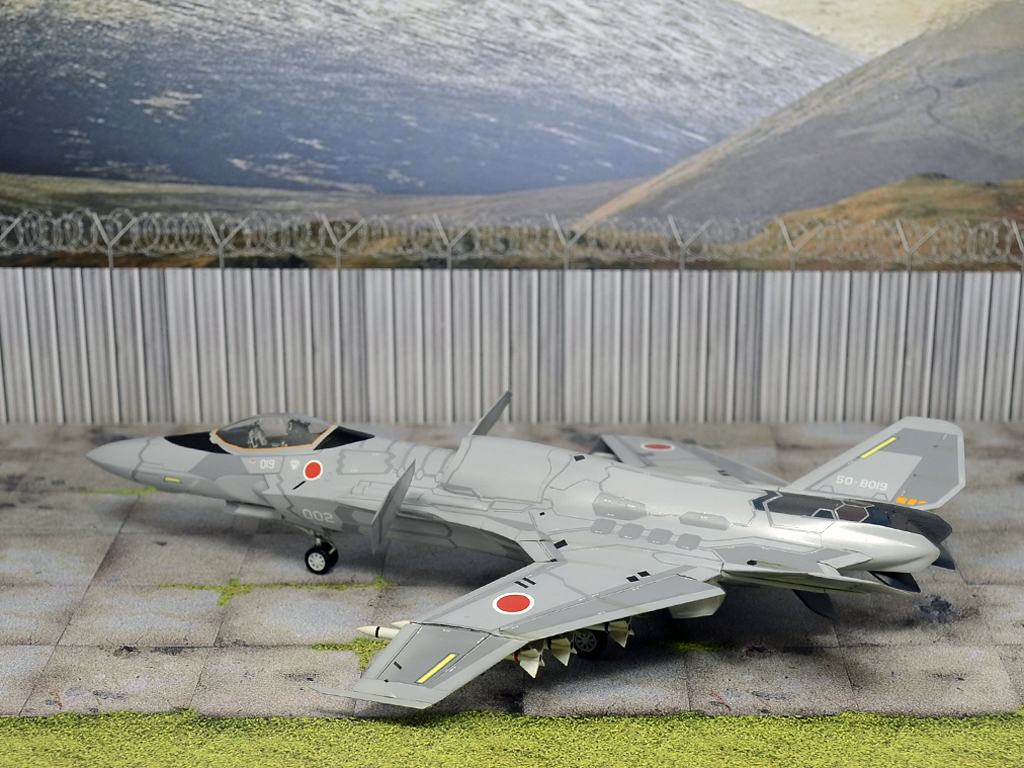 На самом деле это вымышленный аппарат, придуманный известным создателем анимэ Сэдзи Кавамори. Но ходят слухи, что всё-таки японцы втихаря разрабатывают что-то похожее. У самолёта крыло обратной стреловидности. Законцовки крыла могут отклоняться вниз. Довольно большое переднее горизонтальное оперение. Два сильно разнесённых киля тоже могут отклоняться как вниз, так и вверх. Двигателей два. И они расположены не рядом, а друг над другом со значительным смещением вдоль оси планера. Нижний двигатель питается через боковые воздухозаборники, а верхний двигатель питается через верхний воздухозаборник наподобие F-16.