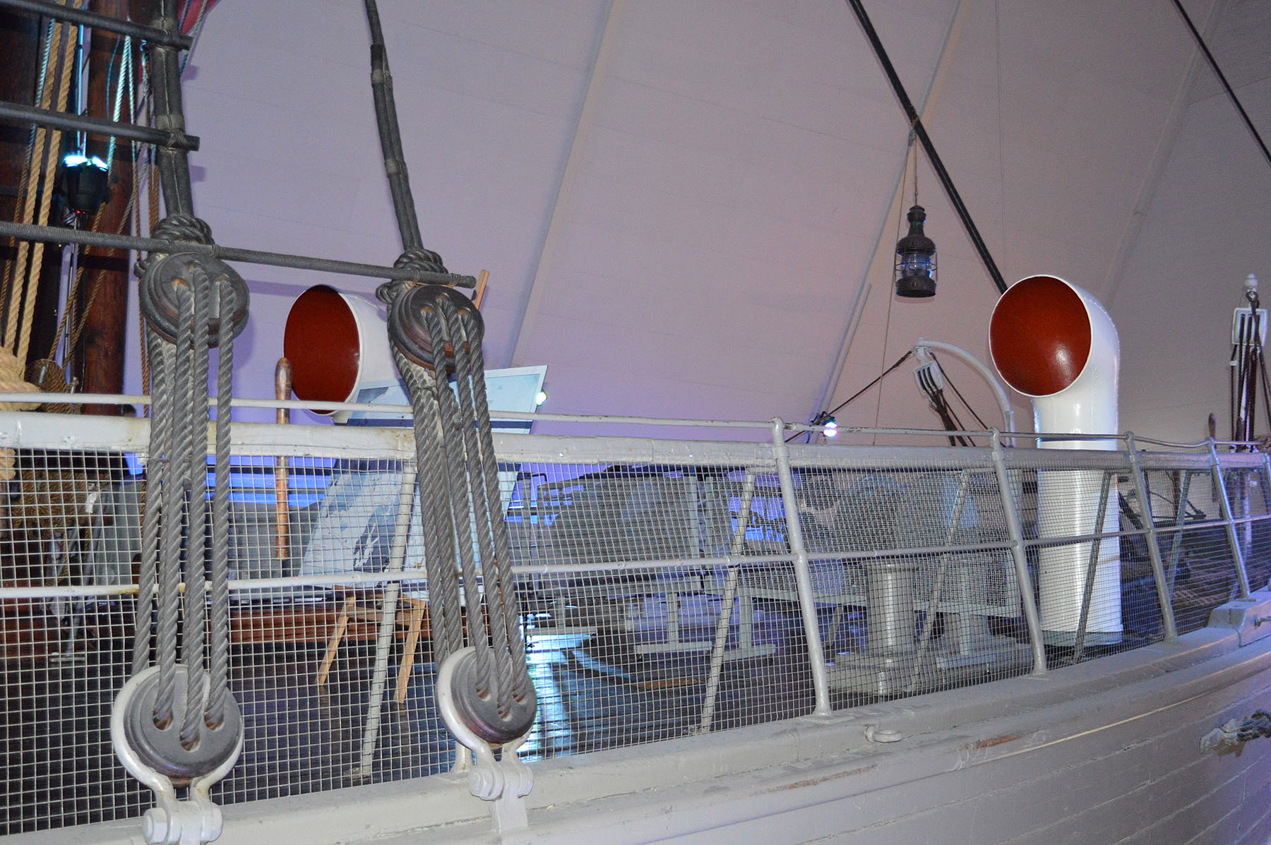 2. Забота об экипаже. Фрам был спроектирован так, что мог нести запасы, достаточные для команды в 12 человек сроком на 5 лет. Были предусмотрены и ветрогенератор (сборный) для высоких широт, используемый в качестве источника освещения в условиях полярной ночи, каюткомпания для всего экипажа в условиях зимовки во льдах, 8 шлюпок для эвакуации не только экипажа, но и изрядной части припасов.