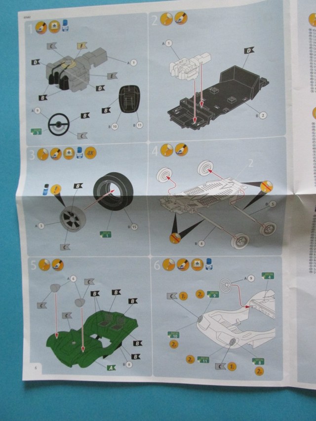 Внутри инструкция, один пакет, в котором литник белого цвета, литник серого цвета, литник с резиновыми колёсами и прозрачный литник с ветровым стеклом. Отдельно дан листик с декалями с защитной калькой но без упаковки, но по дороге не пострадал.