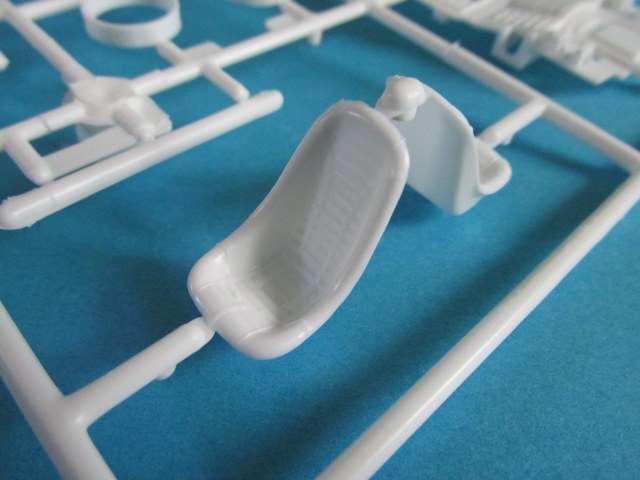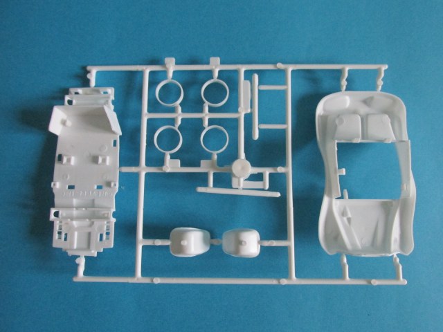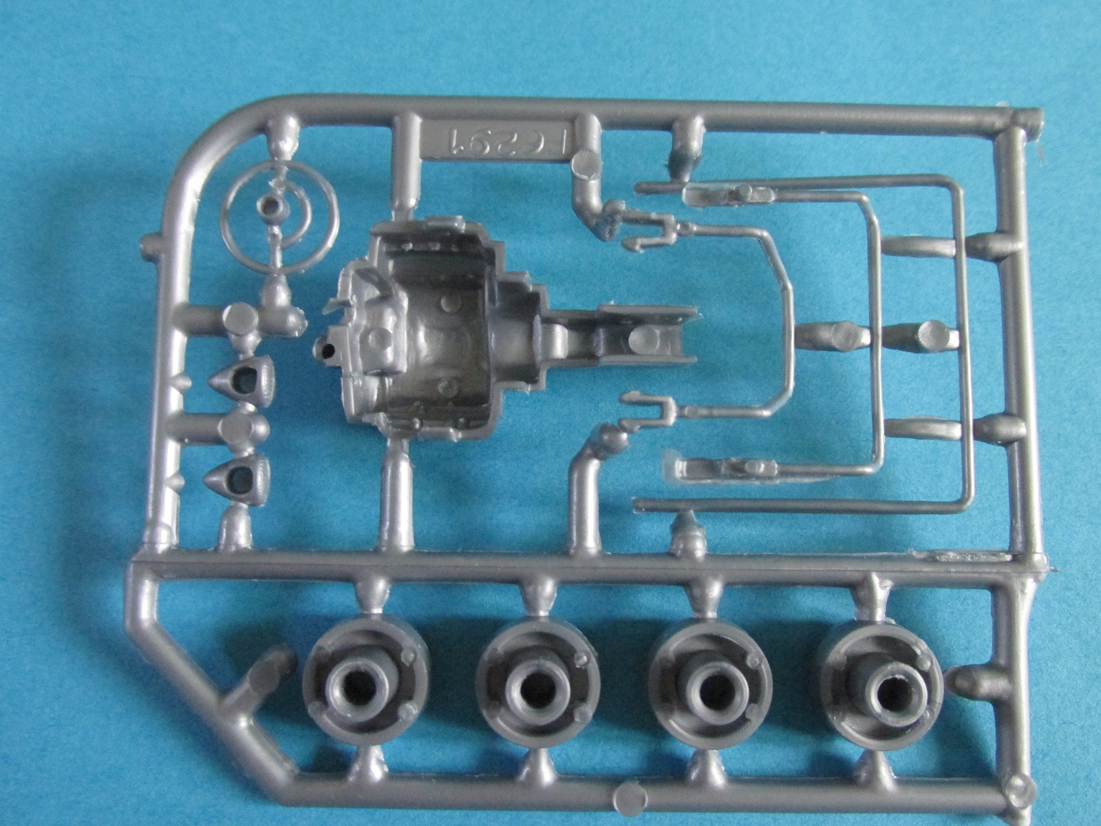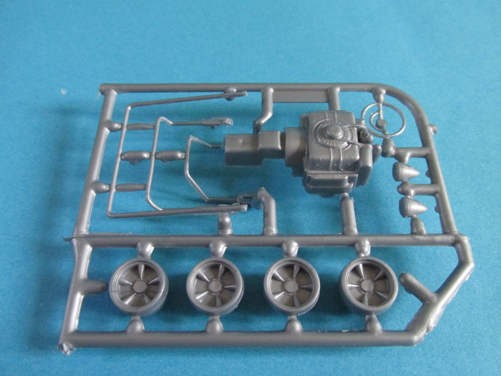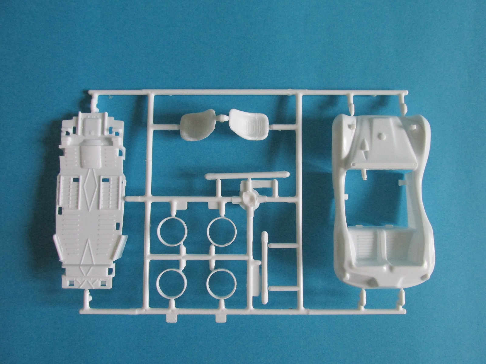На белом литнике даны верх и низ корпуса, кресла (по виду как из старттрэка), очень сильно упрощённая подвеска и четыре непонятных обода, в инструкции про них ни слова. Верх корпуса отлит отлично, низ тоже. Следы от толкателей с внутренней стороны, незначительный облой.