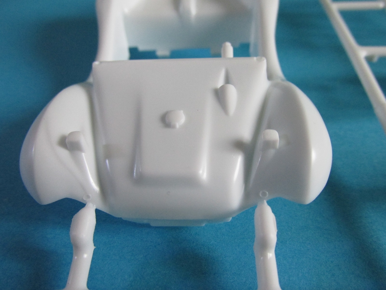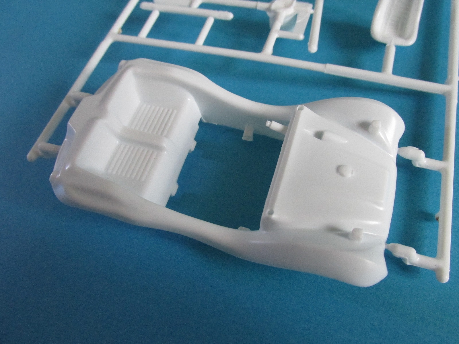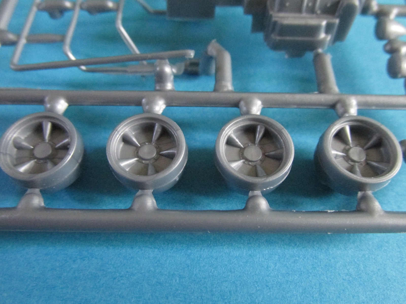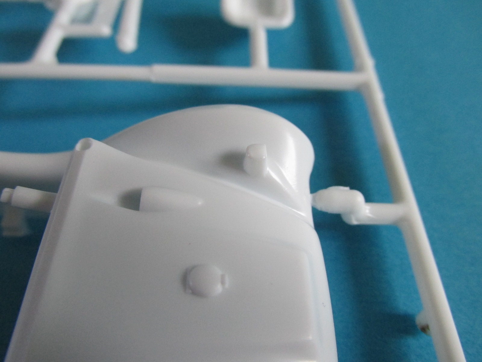 На белом литнике даны верх и низ корпуса, кресла (по виду как из старттрэка), очень сильно упрощённая подвеска и четыре непонятных обода, в инструкции про них ни слова. Верх корпуса отлит отлично, низ тоже. Следы от толкателей с внутренней стороны, незначительный облой.