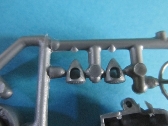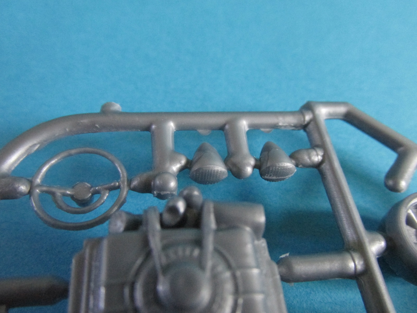 На сером литнике четыре диска вполне приличного вида, элементы рамы и поручней, двигатель, руль и две фары. Следы от толкателей также на невидимых местах, рама и поручни с облоем, но поправимо. А вот фары расстроили. Отлиты целиком, да ещё и шов в неудачном месте, а снизу пазы под посадочные места на корпусе. С ними придётся повозится.