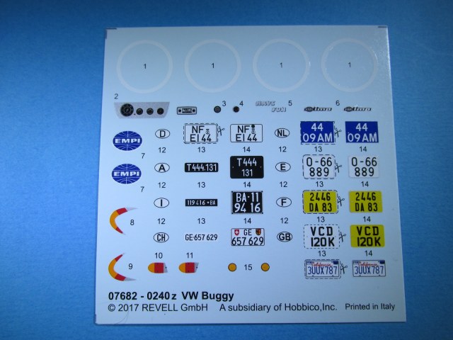 Листик с декалями весьма богатый. Имитация задних фонарей из двух дек каждый, панель приборов, то ли радио то ли магнитола, аж девять вариантов номерных знаков, и ещё какие то надписи.