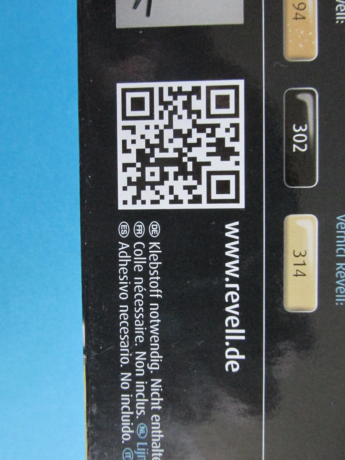 Коробка из плотного картона с боковой загрузкой. Размеры 31х18х4,5 см. с привлекающим к себе артом на аверсе. На обратной стороне четыре фотографии готовой модели, номенклатура цветов, скорее всего ревелловская, и куча каких то надписей.