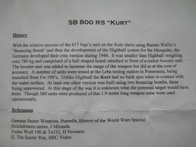 Для поражения надводных кораблей немцы спроектировали так называемые глиссирующие 800-кг бомбы с небольшим реактивным двигателем SB-800RS «Kurt». Эти бомбы имели шарообразную боевую часть диаметром 750 мм и кольцевой стабилизатор. Общая длина бомбы 1910 мм. Сброс бомб происходил на малой высоте, около 20 м, с дистанции 4,0-4,5 км от цели. После сброса срабатывал твердотопливный двигатель, и бомба летела горизонтально, а затем касалась воды под малым углом. Хвостовая часть и стабилизатор отваливались, а боевая часть делала несколько рикошетов и ударялась в борт корабля противника. На испытаниях боковое отклонение от цели составляло до 55 м при дальности сброса 4,5 км. Однако точность глиссирующей бомбы очень зависела от состояния моря и силы ветра, поэтому в 1944 г. работы над ней были прекращены.