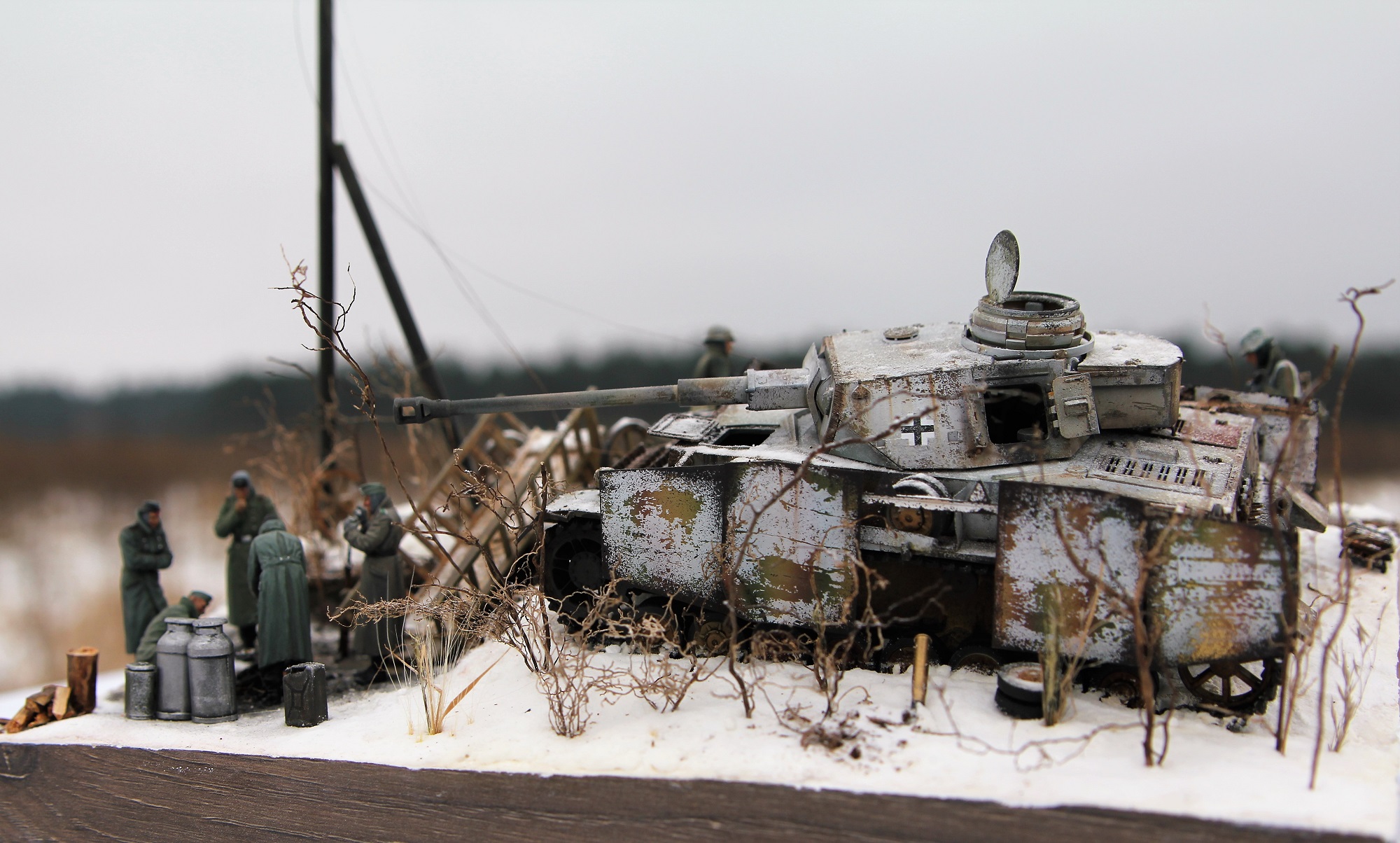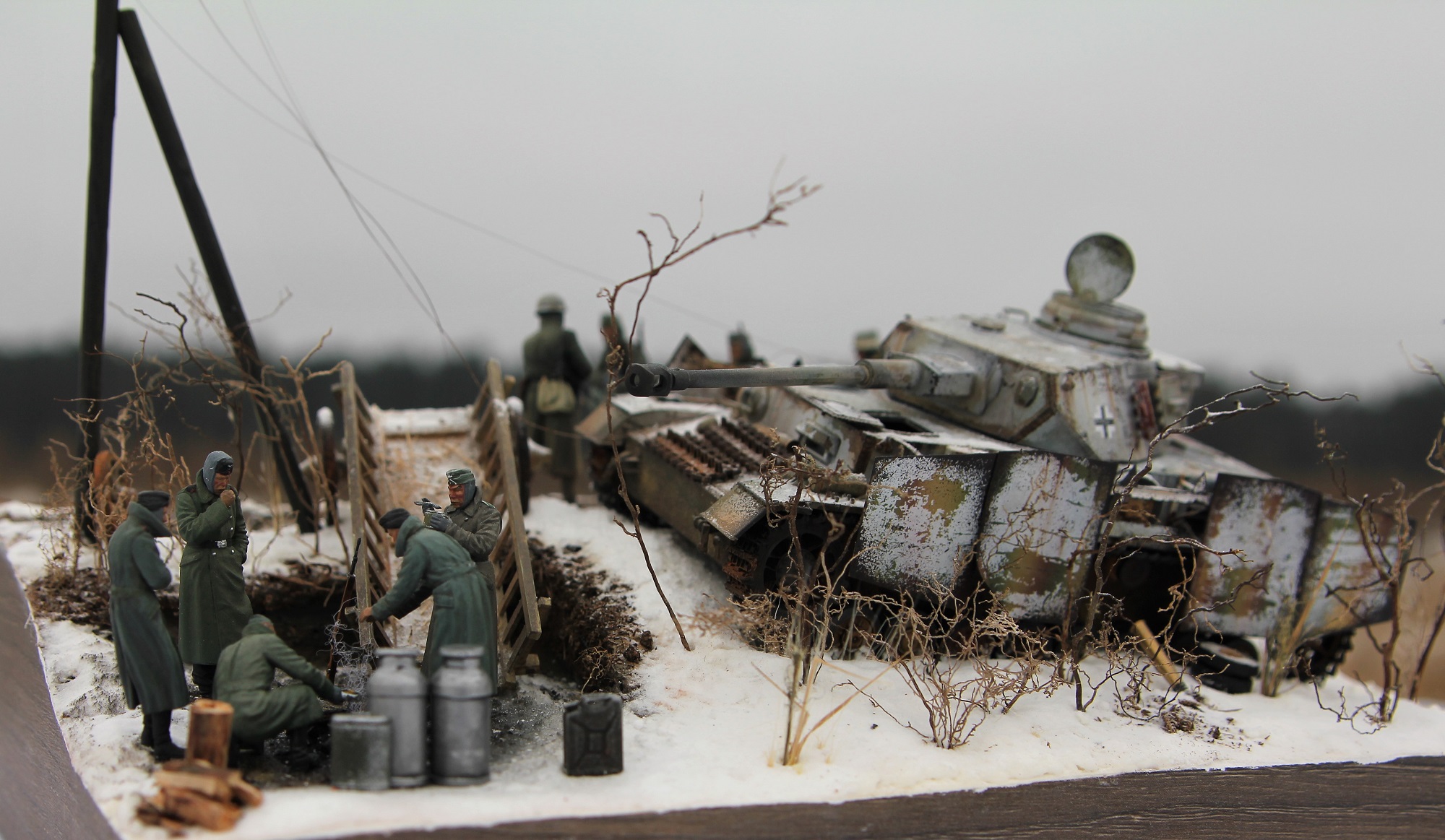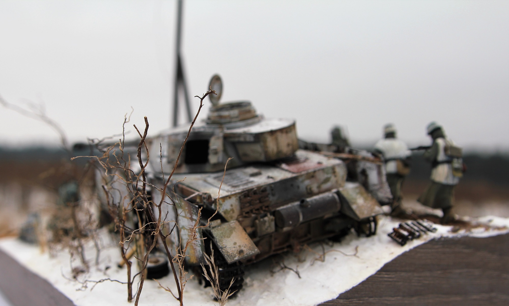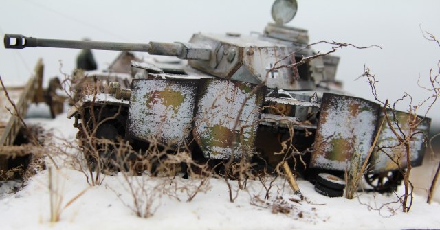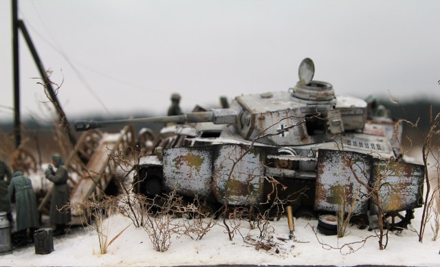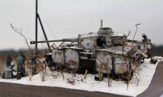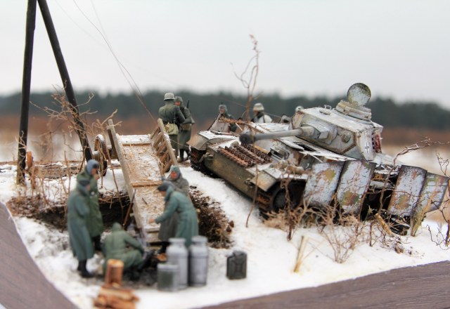Немецкий средний танк PzKpfv IV Ausf.H. (ведь это он?) выпускался с апреля 1943 года (а с экранами с лета). Примерно в это время (если я не ошибаюсь) был введен новый порядок окраски танков вермахта (что мы и видим под зимним камуфляжем). Принимая во внимание то, что на диораме на танке зимний камуфляж, смею предположить, что это, самое раннее, поздняя осень 1943 года. И всё бы ничего, но не отменили ли к тому времени пилотки?