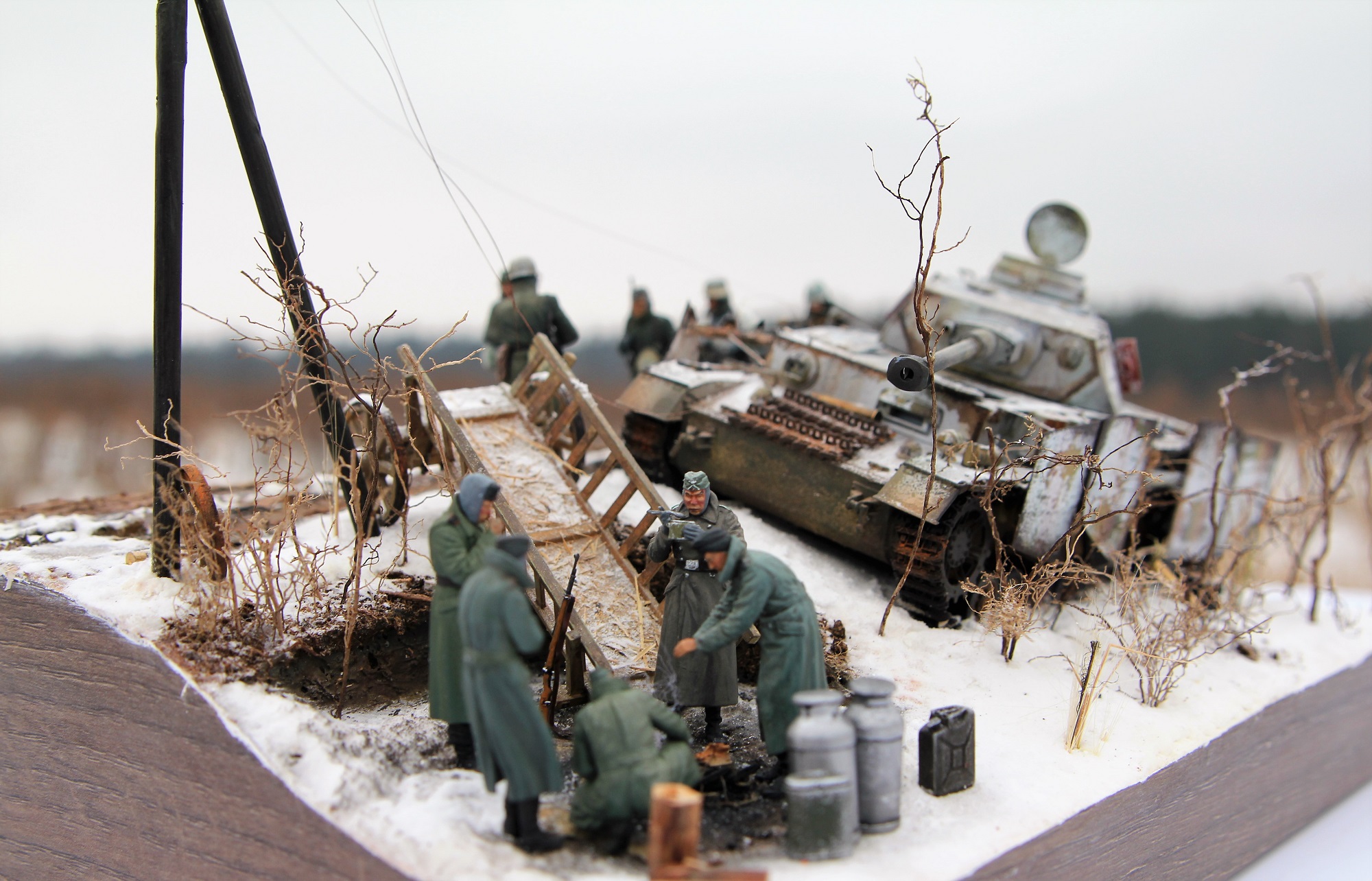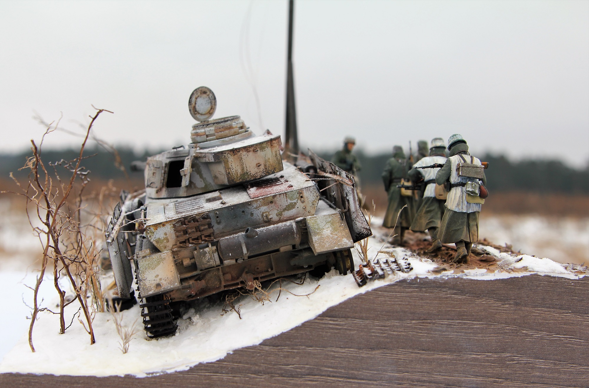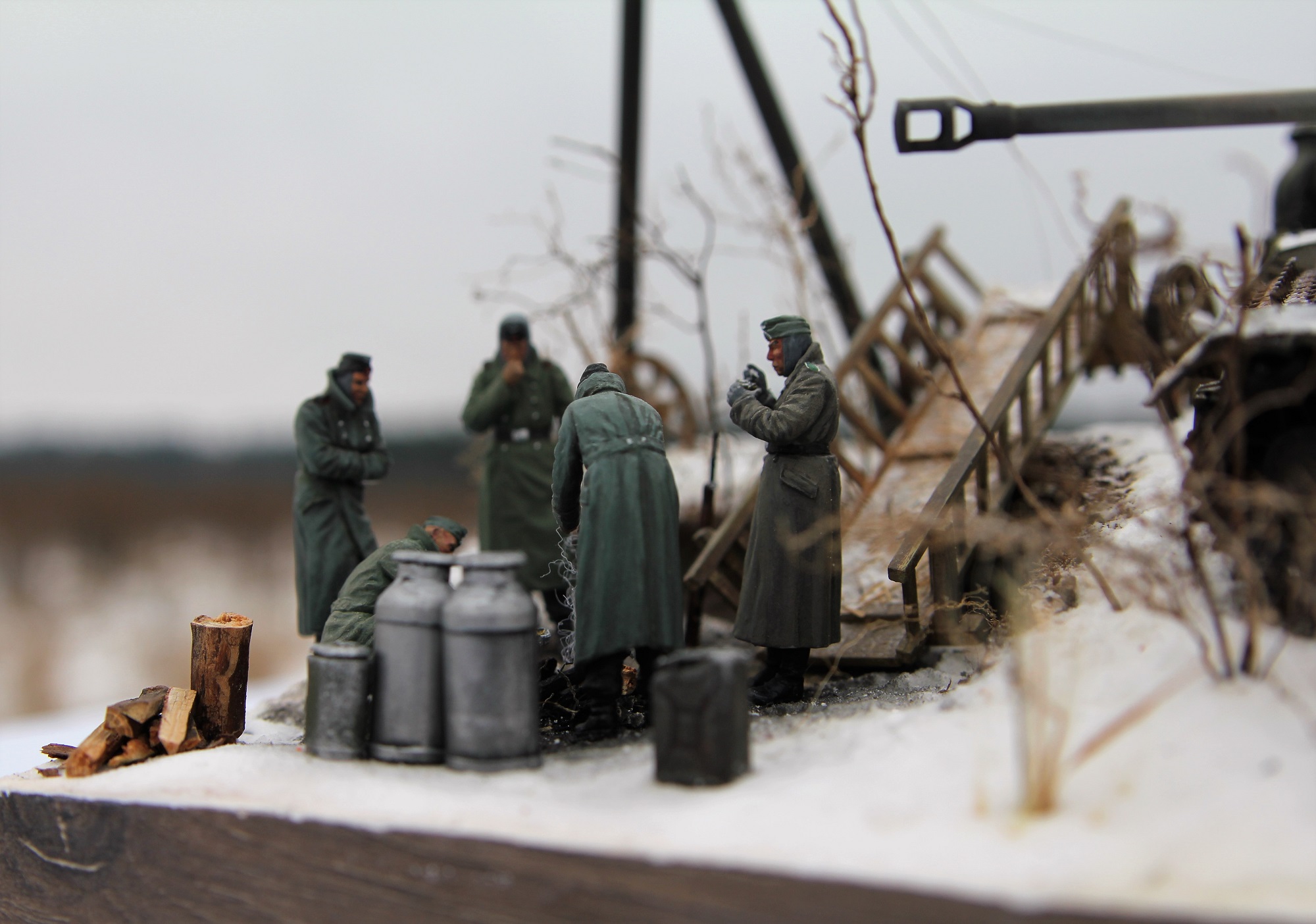 Немецкий средний танк PzKpfv IV Ausf.H. (ведь это он?) выпускался с апреля 1943 года (а с экранами с лета). Примерно в это время (если я не ошибаюсь) был введен новый порядок окраски танков вермахта (что мы и видим под зимним камуфляжем). Принимая во внимание то, что на диораме на танке зимний камуфляж, смею предположить, что это, самое раннее, поздняя осень 1943 года. И всё бы ничего, но не отменили ли к тому времени пилотки?