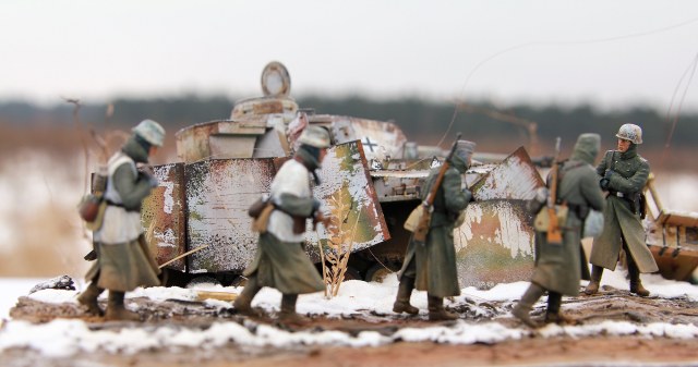 Ни чего особенного. В "песок"! Шутка конечно!!!))) Диорама очень красивая! Фото может и без резкозти, как заметил Владислав, но "черт возьми" они как из фильма! Рассматривал долго, впечатлён буквально всем: и танком, и идущими солдатами, и греющимися у костра, и снегом, и костерком, и грязью! "Настоящесть" просто зашкаливает!