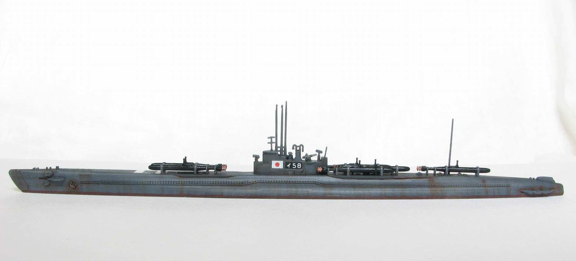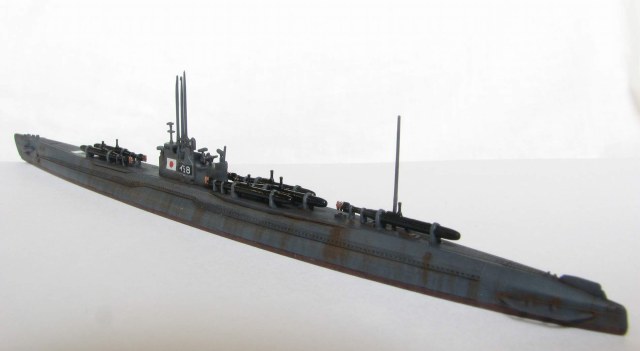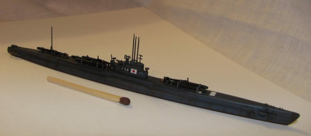 Пара слов о прототипе. И-58 относилась к типу Otsu-Gata B3, построена была на верфи ВМФ в Йокосуке в 1942-44гг., в конце 44-го была переоборудована в носитель человекоторпед "Кайтен", были сняты 140-мм орудие и гидросамолет с ангаром. Знаменита главным образом тем, что в самом финале войны, в конце июля 45-го под командованием М. Хасимото потопила американский тяжёлый крейсер "Индианаполис"(известный в первую очередь тем, что на нем до этого перевозились атомные бомбы). Причем по словам самого Хасимото - без использования человекоуправляемых торпед.