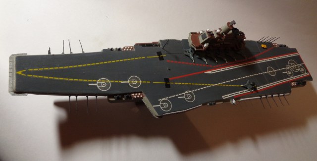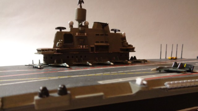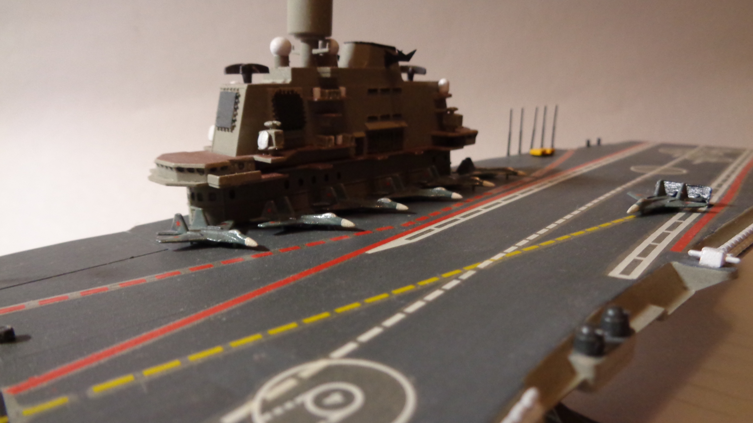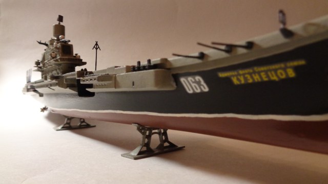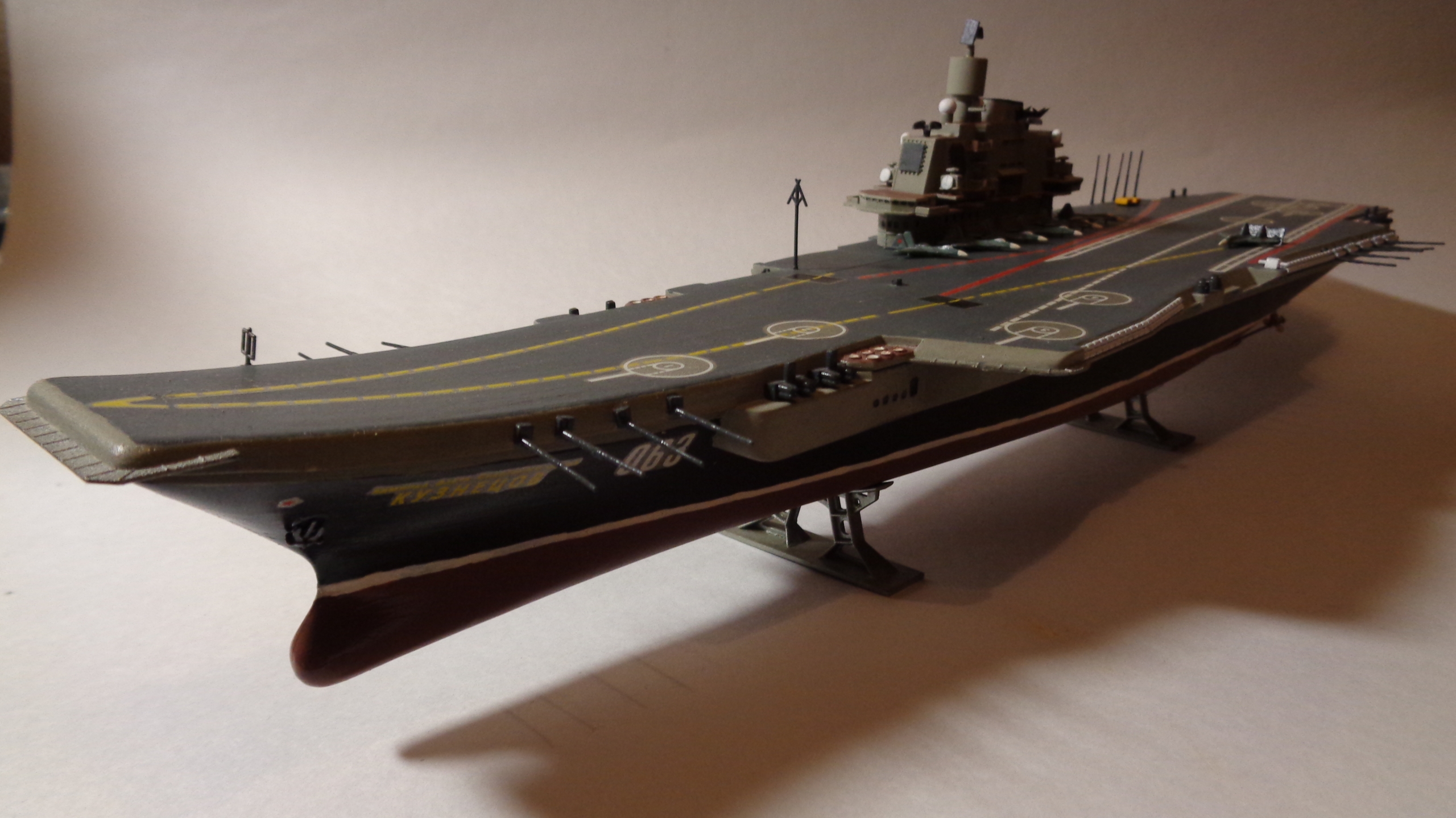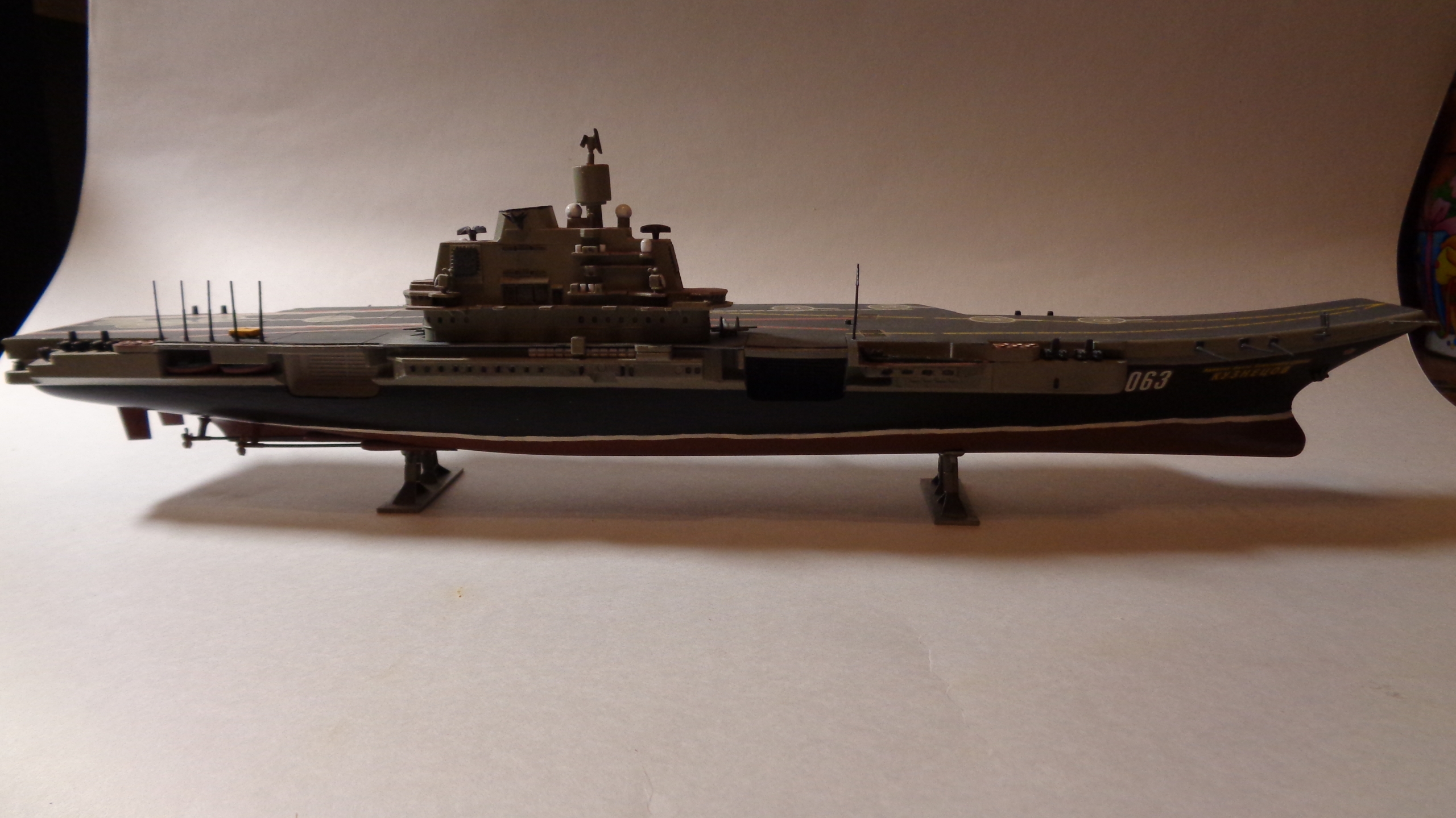 Самая сложная моя модель. Сложная потому, что вымученная. С колоссальными перерывами собирал что-то около 3-х лет. После сборки понял что корабли -- не моё. Сама модель, тем не менее, вполне хороша, каких-то особых проблем вспомнить не могу. Красил кисточкой. Понравились миниатюрные МиГ'и.