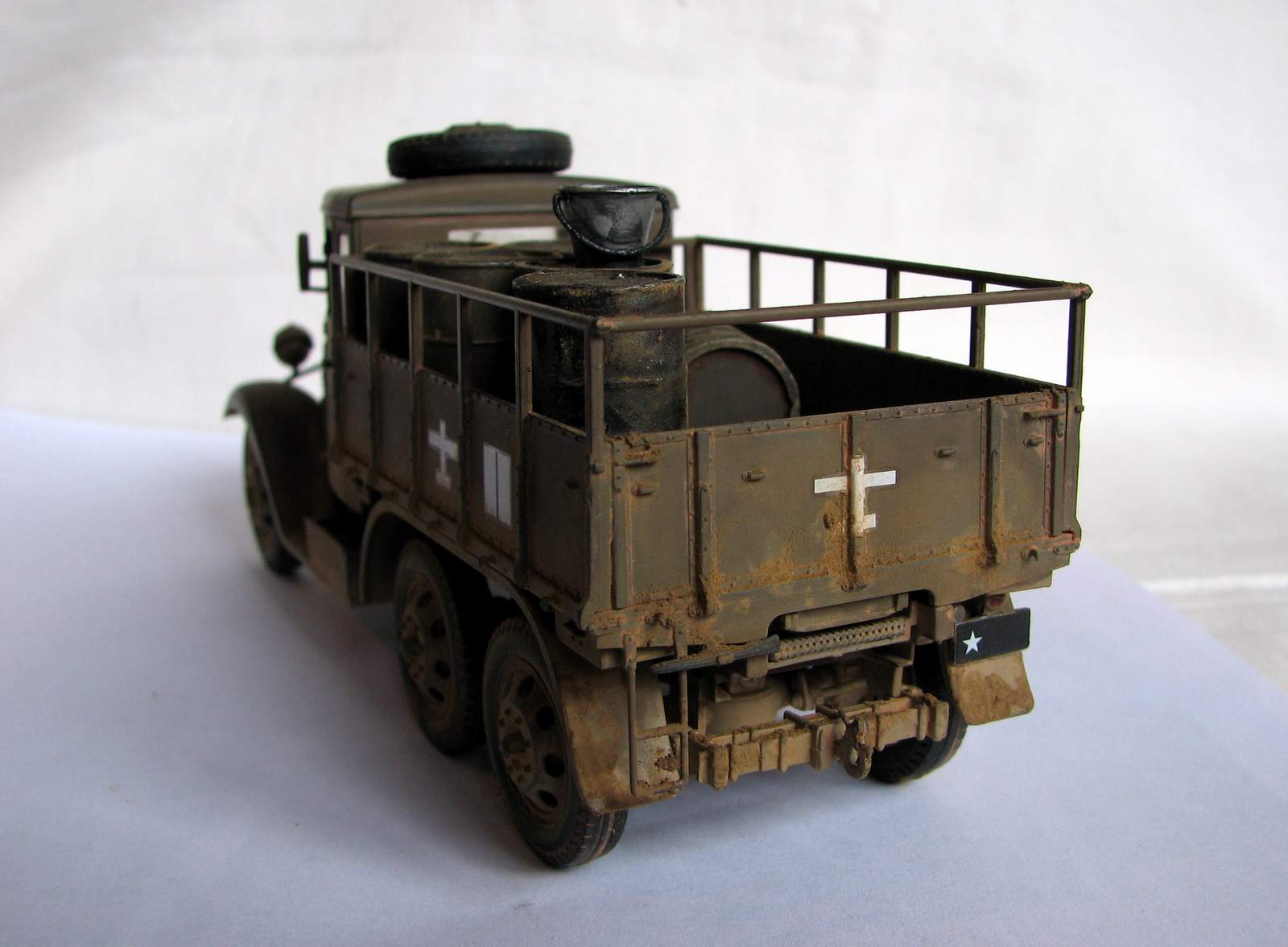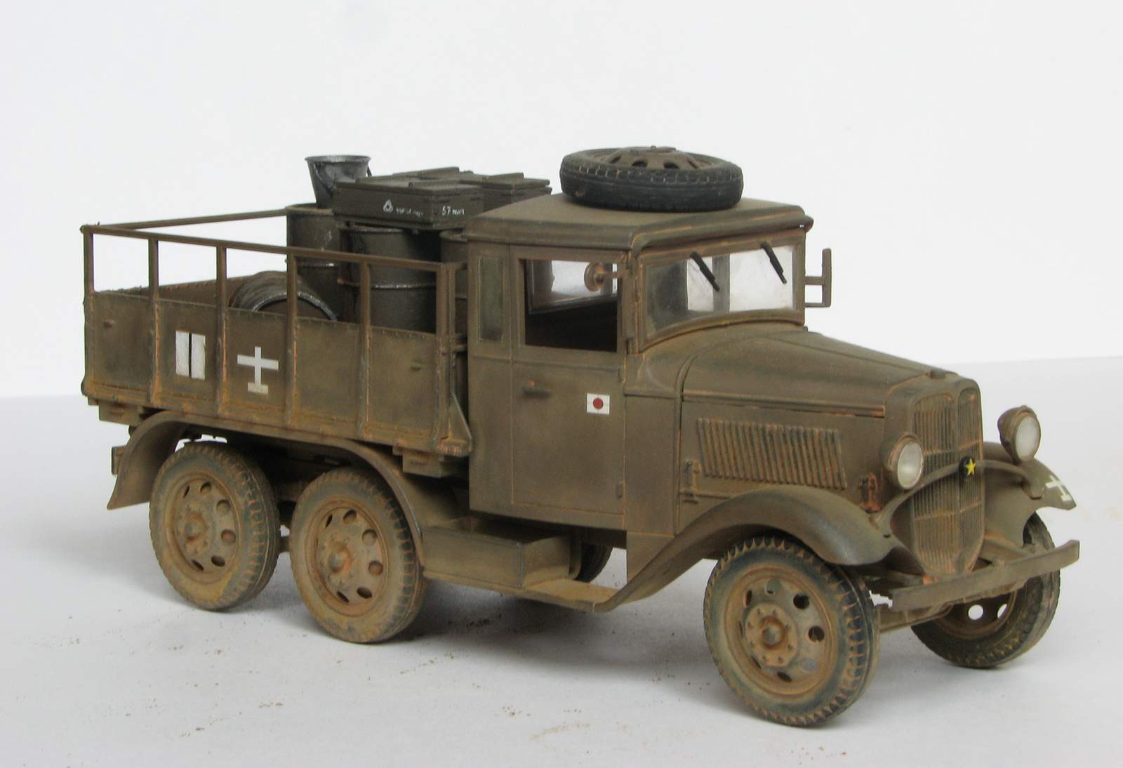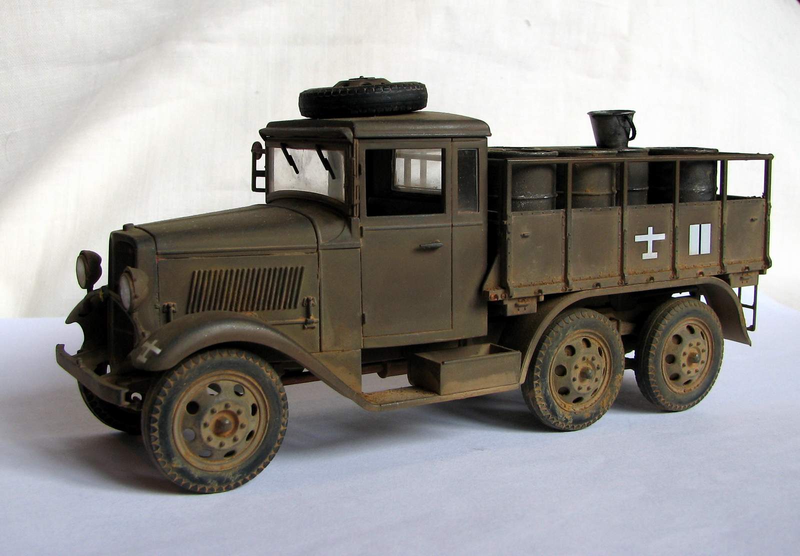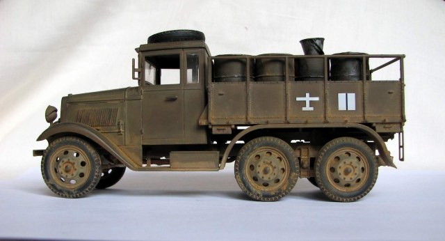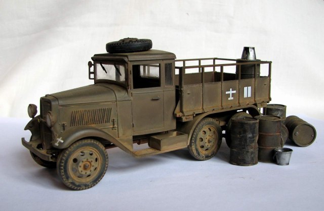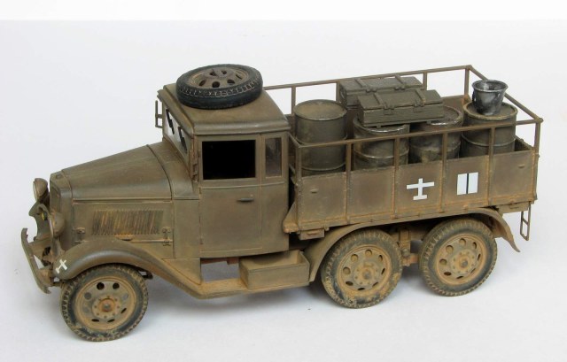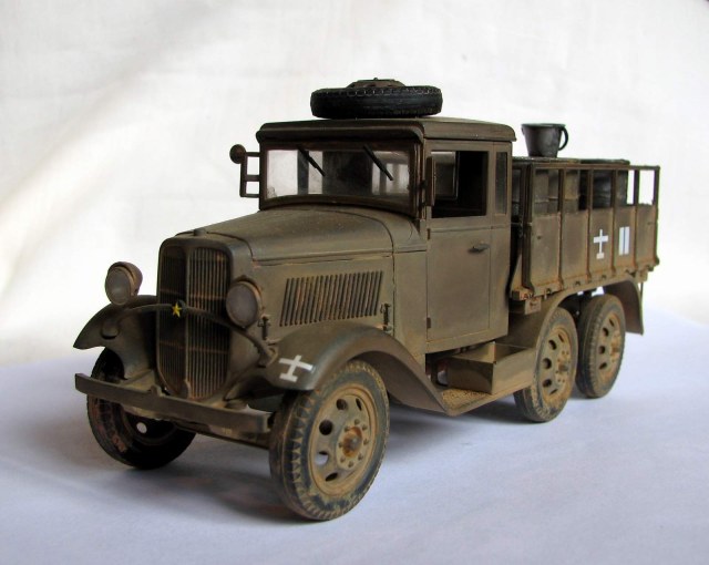 Модель без каких-либо доработок. Собралась хорошо, хотя левую фару я всё же умудрился залить. Пытался изобразить не старую еще машину, которой уже довелось поколесить по фронтовым дорогам. Окрашена тамиевским акрилом (Хаки иро - XF-49+XF64), пигменты - ЗИП. Смывки нет. История её изгадинга тяжела и поучительна для начинающих типа меня. Сначала не придумал ничего лучше, чем не залакировать модель, потом - использовать обычную гончарную глину для имитации грязи и пыли. Результат был малоприятный... Стал отмывать водой. Грузовик разумеется пошел пятнами и вид его сделался совсем неприятным, да еще и декали повредились... Кое-как прикрыл ущерб нормальными ЗИПовскими пигментами. Вышло ожидаемо.