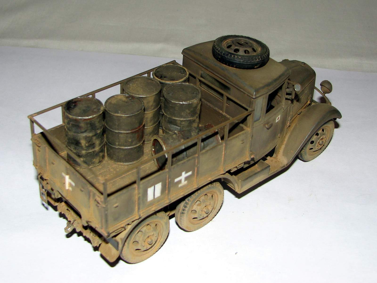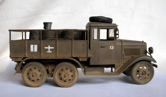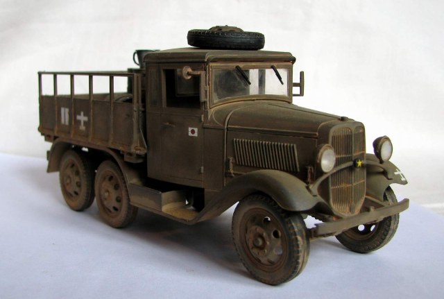 Первая полностью законченная мною модель в 35-м масштабе. Изкоробочный японский грузовик времен Второй мировой, конкретно - самого окончания войны и битвы за о. Шумшу в августе 45-го. Семейство унифицированных армейских машин, к которому принадлежал и данный агрегат, выпускалось фирмой Исудзу и другими фирмами с 1934-35гг. и составляло основу автопарка японской армии к началу Второй мировой.