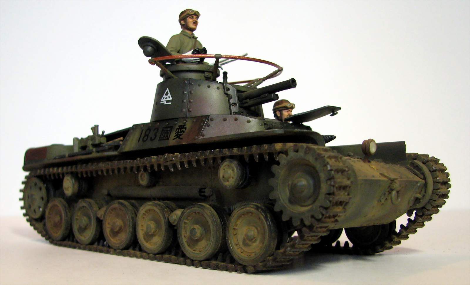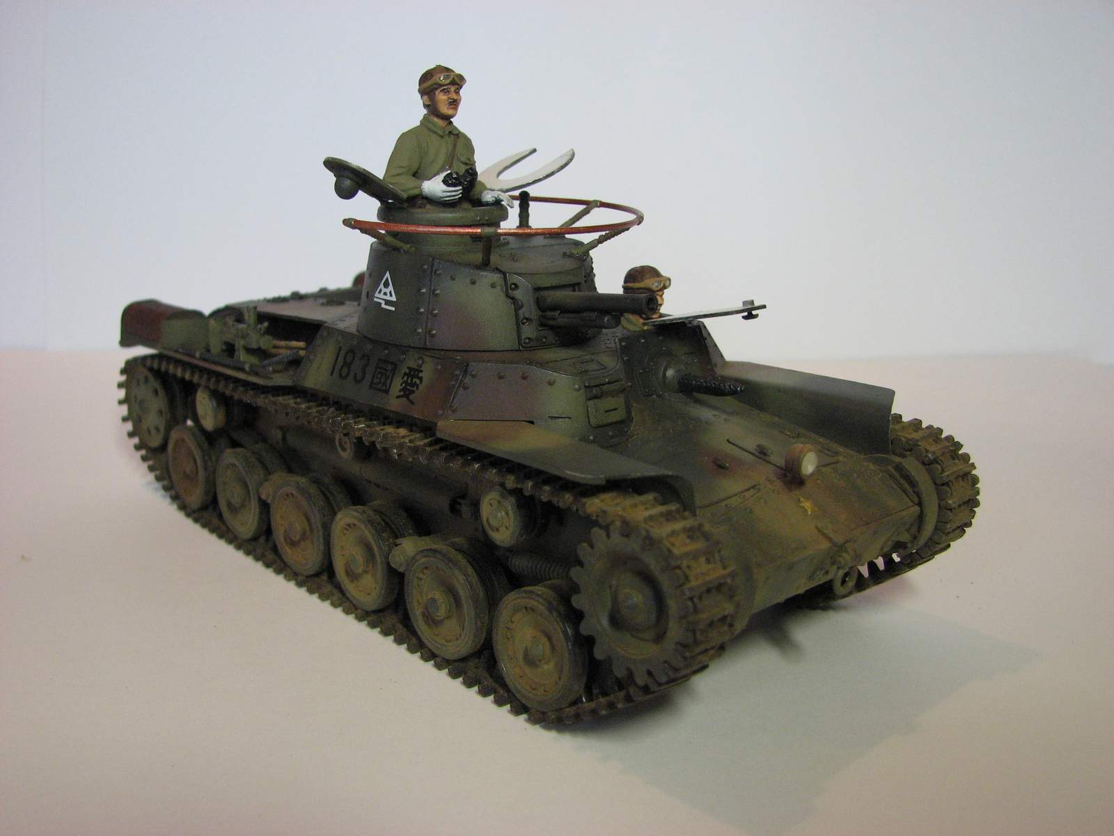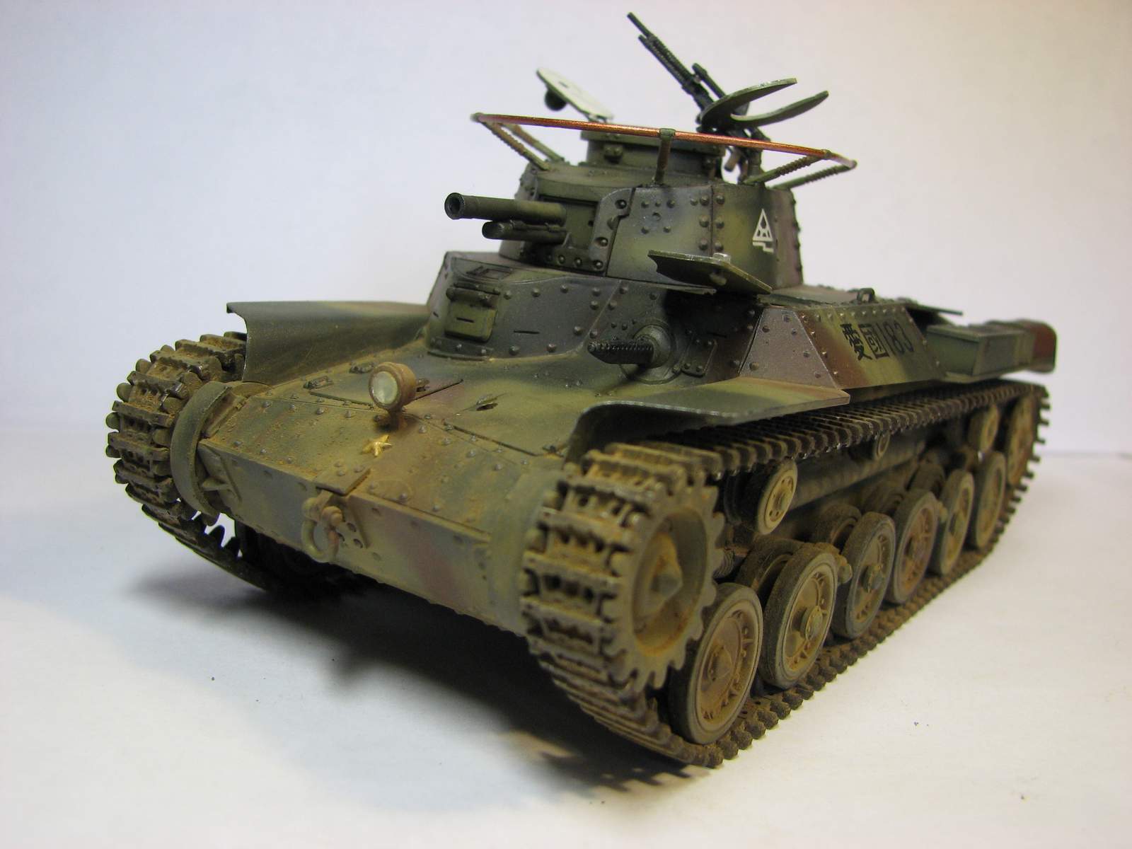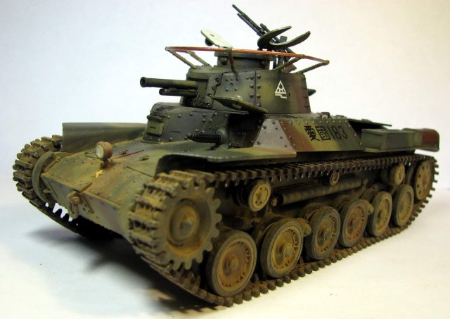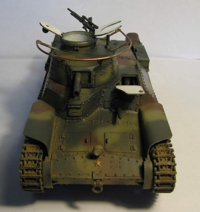 Вторая работа в 35-м масштабе, сделана весной этого года. Ею стал старый тамиевский набор 70-х годов. Как водится - сборка изкоробочная, хотя теперь сам вижу, что глушители смотрятся просто чудовищно. Окраска - стандартная, акрил Тамия и Звезда, поверх матовый лак. Из-за неправильно нанесенной маскировочной жидкости камуфляж пришлось полностью перекрашивать, поэтому он получился толще, чем следовало бы. Смывка - звездовский акрил, ржавчина - акрил и местами акварель. Запыление - пигменты ЗИП. Единственная доработка - доделана фара. Танк пытался показать почти новым, поэтому он и неободранный - в августе 45-го 34-й танковый полк в боях практически не участвовал и в полном составе сдался наступающим советским войскам. Большая часть матчасти позднее была передана китайской Народно-Освободительной Армии.
