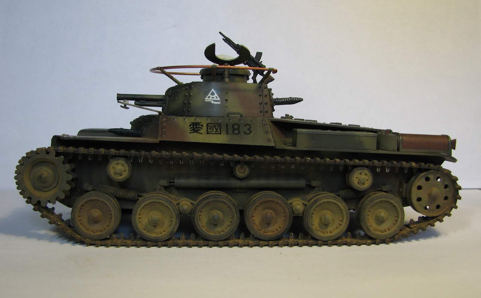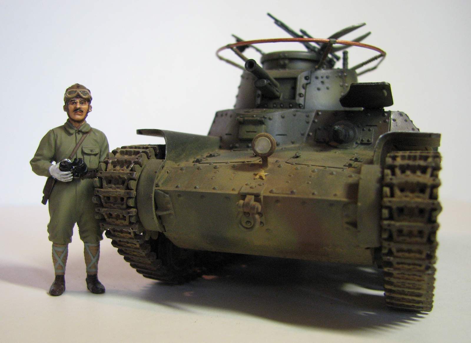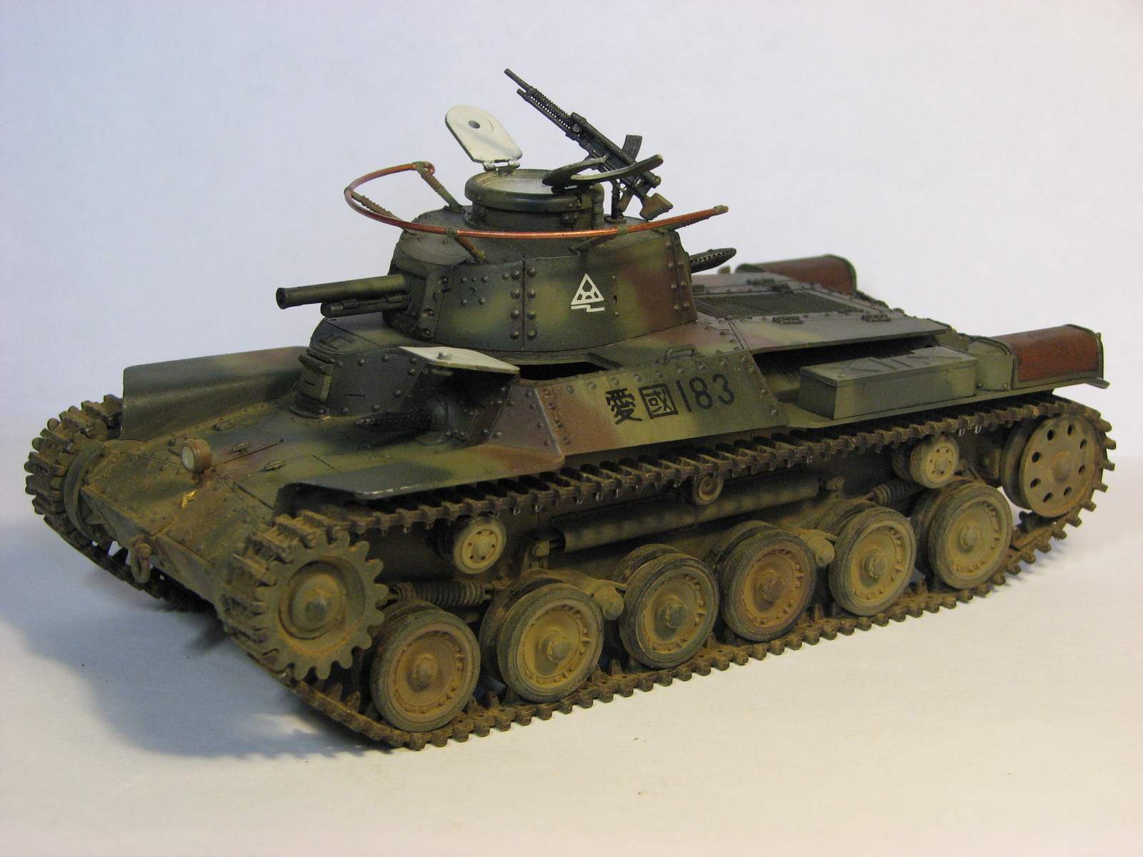 Вторая работа в 35-м масштабе, сделана весной этого года. Ею стал старый тамиевский набор 70-х годов. Как водится - сборка изкоробочная, хотя теперь сам вижу, что глушители смотрятся просто чудовищно. Окраска - стандартная, акрил Тамия и Звезда, поверх матовый лак. Из-за неправильно нанесенной маскировочной жидкости камуфляж пришлось полностью перекрашивать, поэтому он получился толще, чем следовало бы. Смывка - звездовский акрил, ржавчина - акрил и местами акварель. Запыление - пигменты ЗИП. Единственная доработка - доделана фара. Танк пытался показать почти новым, поэтому он и неободранный - в августе 45-го 34-й танковый полк в боях практически не участвовал и в полном составе сдался наступающим советским войскам. Большая часть матчасти позднее была передана китайской Народно-Освободительной Армии.