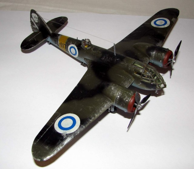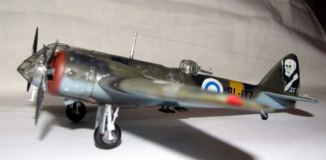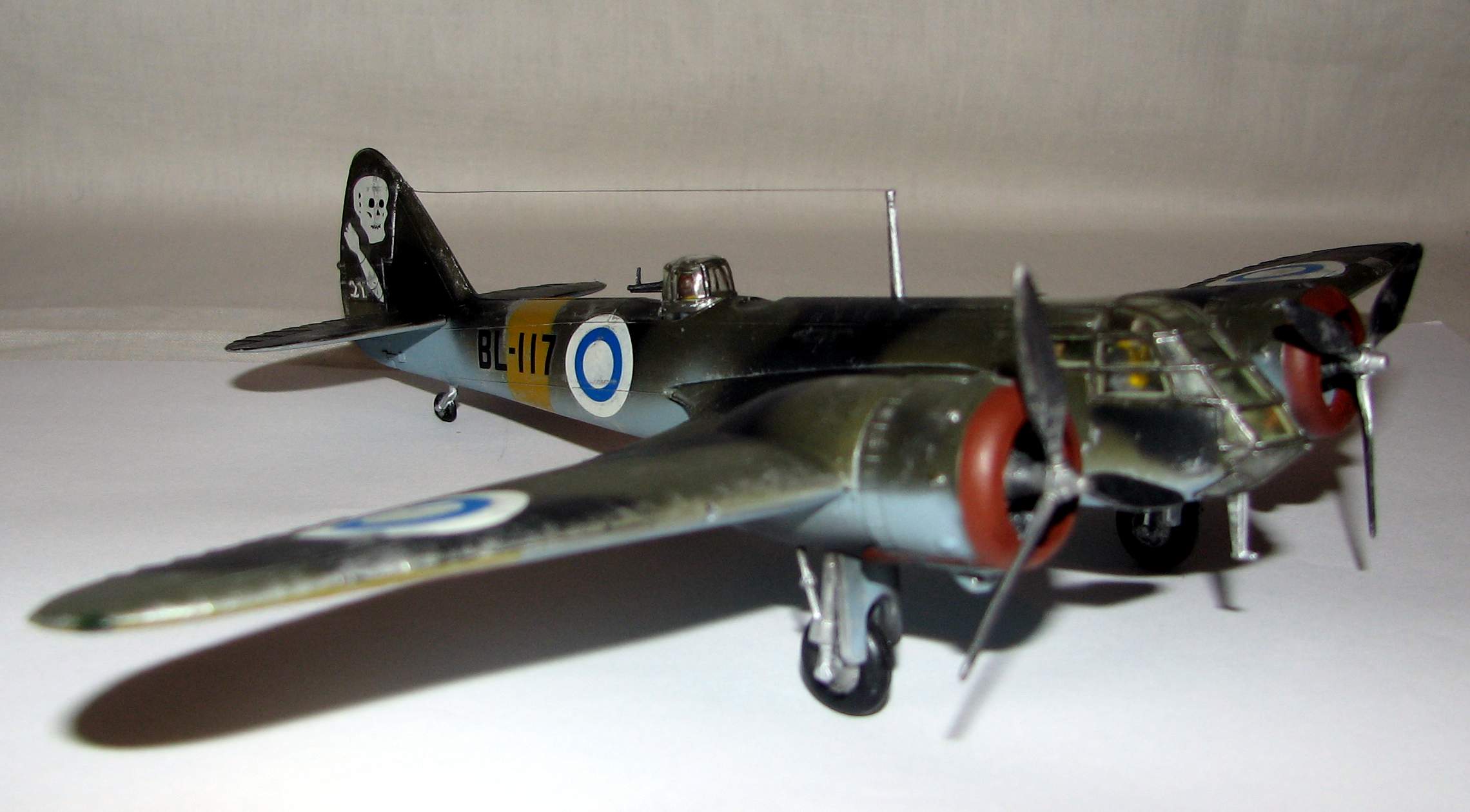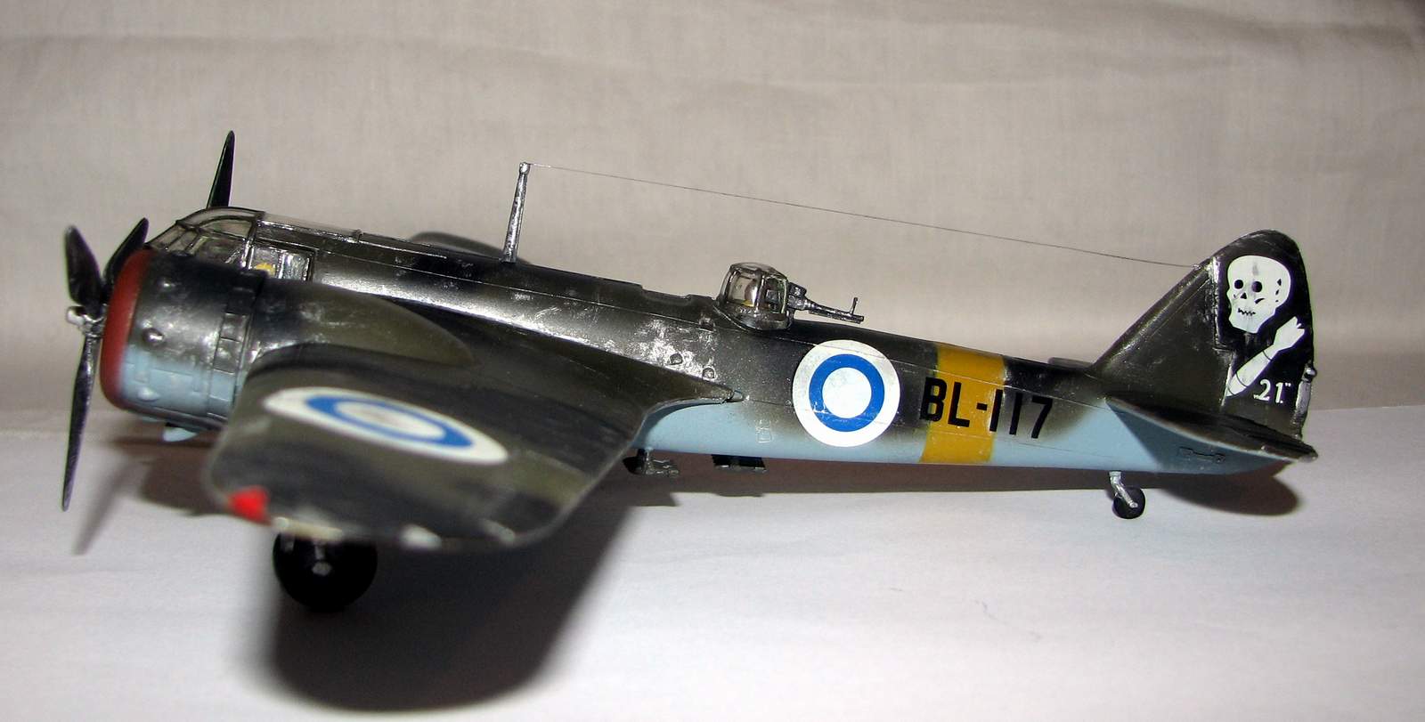Одна из моих первых авиакошек, собранная около года назад в порядке тренировки и пробы изображения ободранности. Изображает аппарат финских ВВС, примерно 1945-46гг, поэтому с кокардами и такой ободранный. Без каких-либо доработок. Окраска - акрил Тамия. Утерянный в процессе сборки турельный пулемет был заменен самодельным.