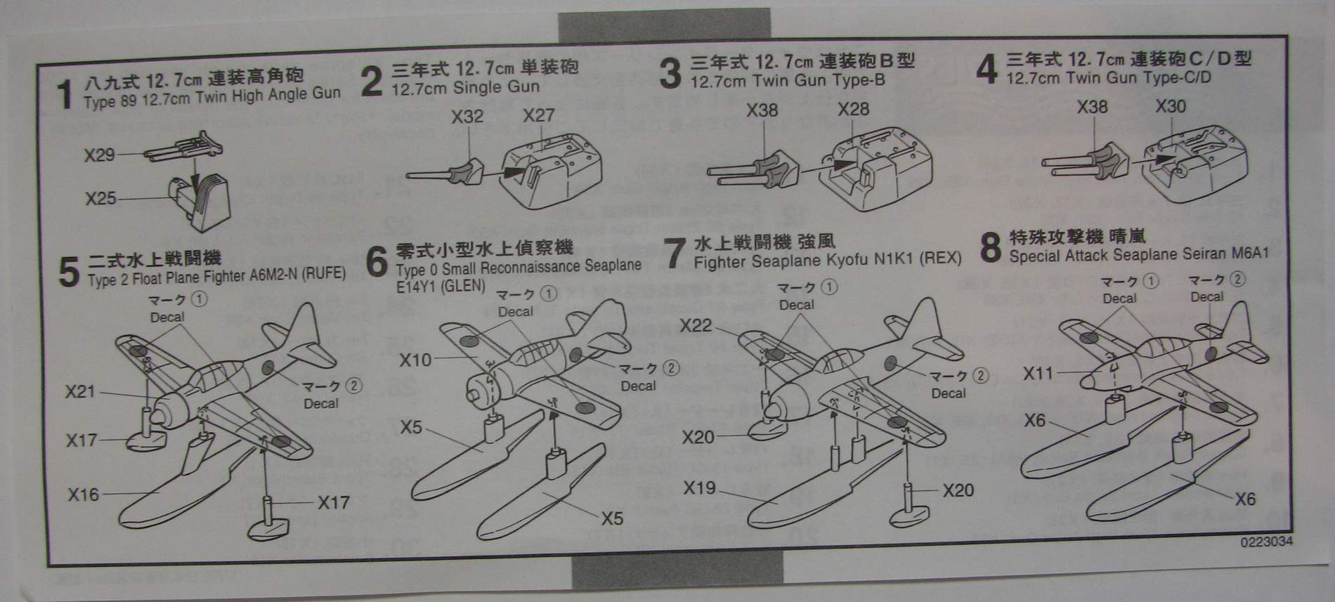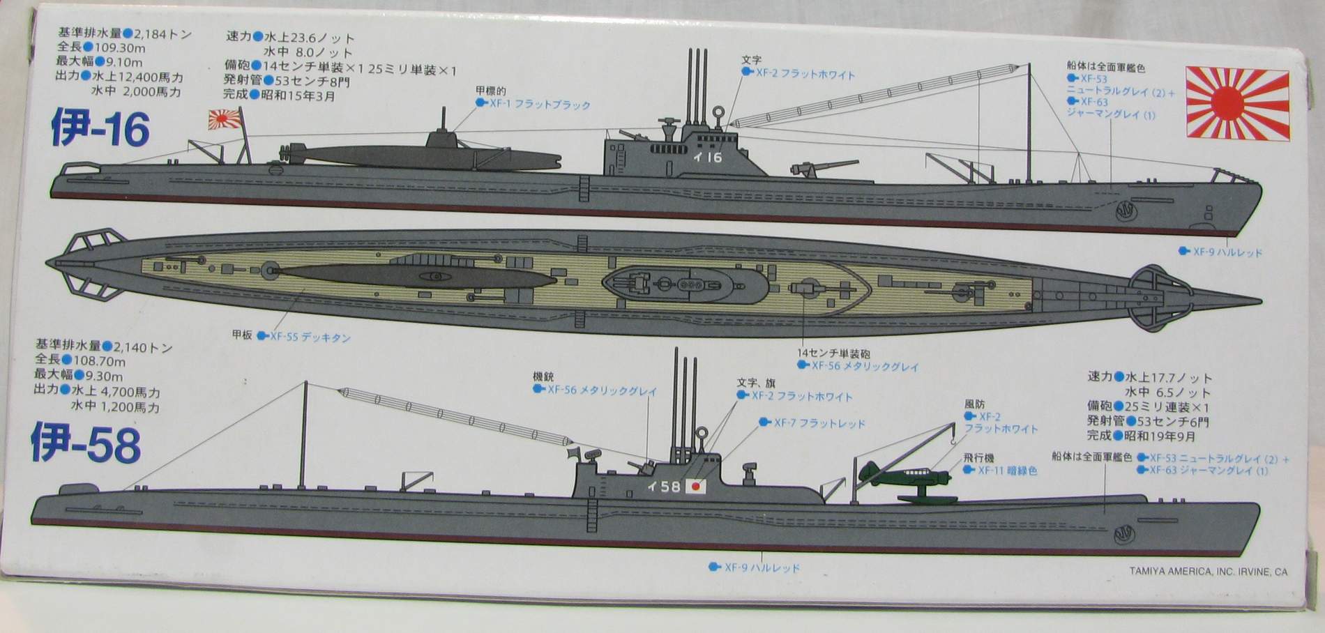 Вот и приехала наконец ко мне долгожданная посылка из Китая. Честно говоря, я похоже здорово переплатил за эту дрянь, но здесь как-то данного набора давно не встречал... Впрочем, не о том сказ. Небольшая аккуратная тамиевская коробочка (сзади на ней изображена схема окраски) содержит два пакета. В первом - 2 литника и 2 корпуса для сборки двух, нет, всё же трёх японских ПЛ времён Второй мировой в 700-м масштабе. Поскольку это вотер-лайн - подводной части у них соответственно нет. Инструкций как водится тоже 2 - на английском и на японском. Набор позволяет собрать ПЛ И-16 со сверхмалой лодкой типа А на палубе (СМПЛ дана одной деталью), и И-58 - в раннем варианте с гидросамолетом и ангаром вместо "кайтенов". Декалей к ним к сожалению нет - только рельефные выштамповки на корпусе для нанесения обозначений. Корпуса в общем подкачали - на фоне недавно выставленной мною И-58 в позднем варианте рельефность их слабая, стык между легким и прочным корпусами дан фактически одной линией, что большой минус и главное расстройство на мой взгляд. Второй пакет содержит тамиевский доп. набор для японского флота в 700-м масштабе, в основном для надводного флота, а не для ПЛ - это 4 разных гидросамолета ("Кёфу", "Сейран", А6M2-N и E14Y), орудия, торпедные аппараты и т.п. Также вместе с ними идет инструкция по сборке самолетов и ОЗ для них же, данные декалью. На обратной стороне инструкции указан список доп. оборудования. Литьё в целом нормальное, но облой в некотором количестве присутствует. Ну стволы автоматов или перископы с антеннами несколько толстоваты, понятно, леерных ограждений на лодки нет. Как-то так.