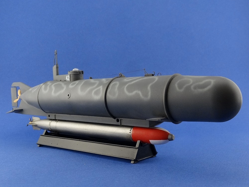 Базовый цвет корпуса лодки получен смешиванием красок Tamiya XF-24 Dark Grey,Tamiya Xf-83 Med. Sea Gray 2 Raf, Tamiya X-4 Blue. Пропорцию сказать не смогу, ибо мешал на глаз.Камуфляжные пятна нанесены цветом Tamiya Xf-83 Med. Sea Gray 2 Raf . Далее выделил модель смывкой от AK Interactive 045 Dark Wash For Green Vehicles. Номера были взяты из набора сухих декалей из запасов.Торпеда,основная часть была задута краской Tamiya XF-56 Metallic Grey (Серый металлик) , а носовая часть покрашена красками Tamiya XF-2 Flat White (Белая матовая) и Tamiya XF-7 Flat Red (Красная матовая).Затем так же сделал смывку химией от AK Interactive 045 Dark Wash For Green Vehicles. Гребные винты красил краской от Gunze Sangyo №9 Gold (Золото)