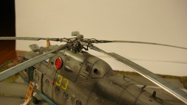 Также за решётками(жабрами) сделал сопло ВСУ Аи-9В. На фюзеляже в верхней его части и по бокам, где расположен редукторный отсек ВР-14 и на капотах вентилятора сделал поручни и ручки открытия капотов из проволоки. Перед основным соплом двигателей установил трубку дренажа. Кромки сопла сточил как можно тоньше, чтобы придать им более естественный вид с тонкими краями. Нижнюю часть фонаря очень аккуратно срезал мини-диском от мини-дрели. Здесь остановлюсь подробнее. Будьте предельно внимательны при отрезании нижней части фонаря: стекло очень хрупкое. Мне пришлось испортить три фонаря от моделей ХоббиБосс: стекло трескалось. Пробовал резать стекло мини пилкой Tamiya - получалось ещё хуже, постоянно закусывало. В конечном итоге купил ещё один набор от ХоббиБосс. Теперь три новых набора Ми-8 лежат как запчасти без фонарей. После того, как аккуратно с четвертой попытки, отрезал низ фонаря подогнал его по месту, приклеил и подшпаклевал. Шпаклёвки пришлось наложить совсем не много, хорошо подогнал фонарь, процедура подгонки оказалась весьма кропотливой приходилось очень часто прикладывать фонарь.