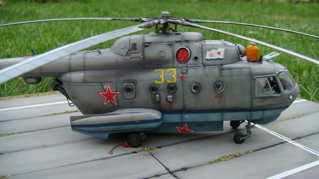 Продолжая свою работу с моделью, накатал имитацию заклёпок расшивки, по правому борту над аварийным люком сделал водоотлив, на лебёдке сделал трос и крюк, на блистере левого пилота-командира сделал визуальный обледенительный датчик, сделал трап, установил стеклянный проблесковый маяк, натянул тросовые антенны, установил стеклянные фары, перенес сигнальные ракеты ЭКСР-46 на правой створке рампы по чертежу (на модели не правильно). Использовал технические надписи. Покрасил краской акрил Tamiya на спиртовой основе, покрыл лаком, сделал, как смог, тонировку и другие эффекты. Фото делал на улице на травянном газоне при естественном освещении, особо незаморачиваясь на окружающие предметы, Посчитав что нужно осматривать модель а не окружающую среду. Оценить качество полученной модели предлагаю Вам, дорогие коллеги! Высказывайтесь, спрашивайте, кому интересно, отвечу на любые вопросы, касающиеся процесса изготовления модели.