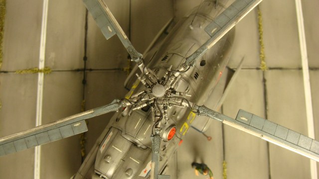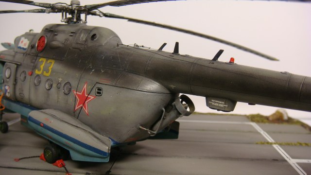 Модель делал, не опираясь на какой-то конкретный прототип. Работу начал с того, что предварительно прицелился к подгонке нижней части лодки к верхней (модель Ми-8 от ХБ). При подгонке окон оказалось, что борта фюзеляжа очень толстые и окна туда просто не лезут. Необходимо было стачивать оконные проёмы. Сточил толщину смолы практически до нуля. Стачивать нужно очень и очень аккуратно, и постоянно примеривать блистера на фюзеляже. Затем сделал имитацию заклёпок, удалил «Липу» за отсеком АИ-9В, немного пришлось зашпаклевать место среза «Липы». Потом сделал из фольги решётки (жабры) на отсеке Аи-9В
