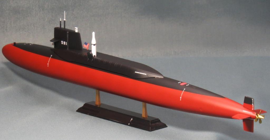 Для воссоздания раннего Джорджа Вашингтона немножко переделал кормовую часть «панциря», закрывающего ракетные шахты: убрал большой сдвижной люк, добавил обтекатель ходового огня, несколько ступенек и переделал направляющий страховочный рельс. Чтобы пластиковый Джордж стал больше похожим на оригинал, пришлось запилить нижние полукруглые части на «панцире» - сверялся с фотографиями прототипов. Ракету сразу планировал устанавливать, для чего прорезал одну крышку ракетной шахты и повторил деталь из дошипласта.