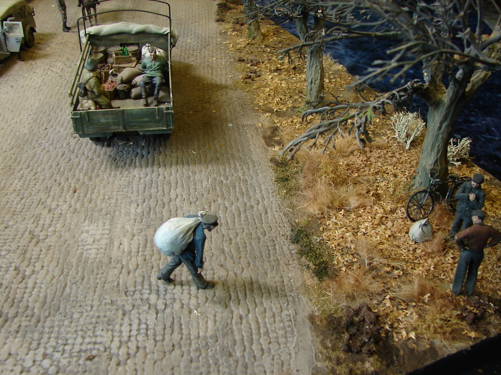 Спасибо,всем за комментарии.Конечно при таком объеме работ,я сознательно пошел на упрощение некоторых деталей.Это касается деревьев,домов и колючки.Мне требовалось 10 метров ее.При цене 15 долл за метр...многовато выходит.В контексте музея это упрощение не заметно.По моей задумке-человек быстро переходящий дорогу-мародер .Он забирает вещи .В посадке его ждут подельники.Работа финансировалась музеем .Справиться с таким количеством фигур,для меня было не просто.((Работа над второй диорамой в процессе.Там весьма сложный этический момент-изобразить массовое истребление в карьере возле Богдановки.(Уже появилось оптимальное решение.Думаю,что всех устоит?С технической стороны-там фигур будет в разы больше.Правда эту диораму я делаю не один.
